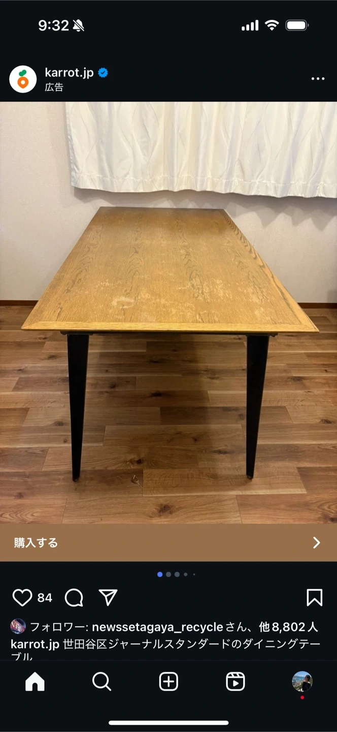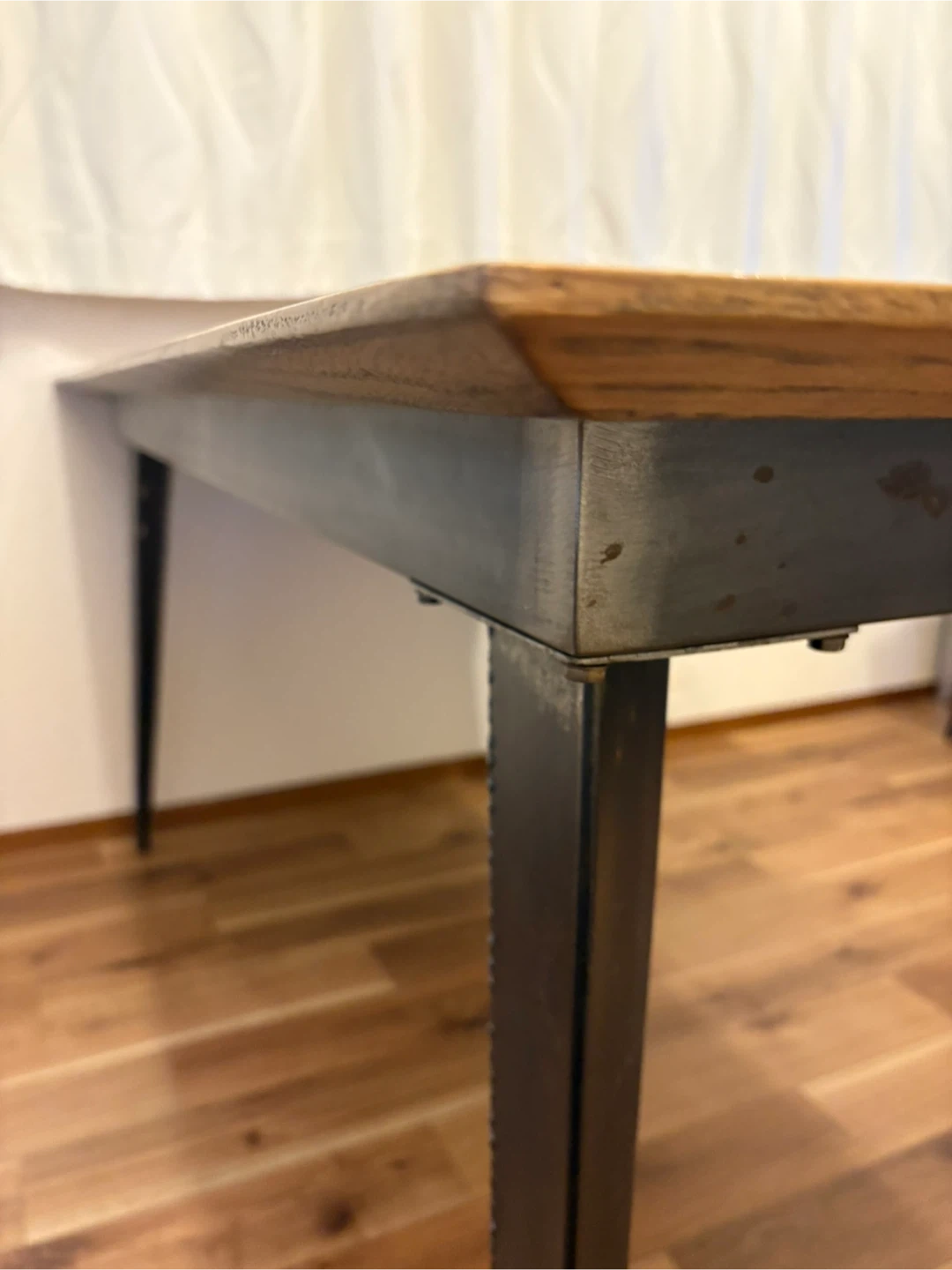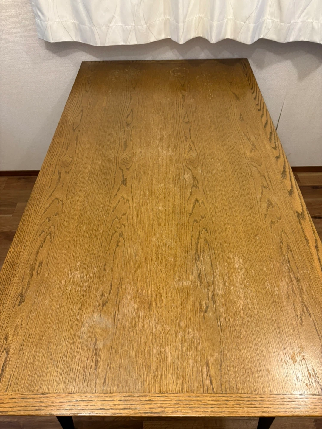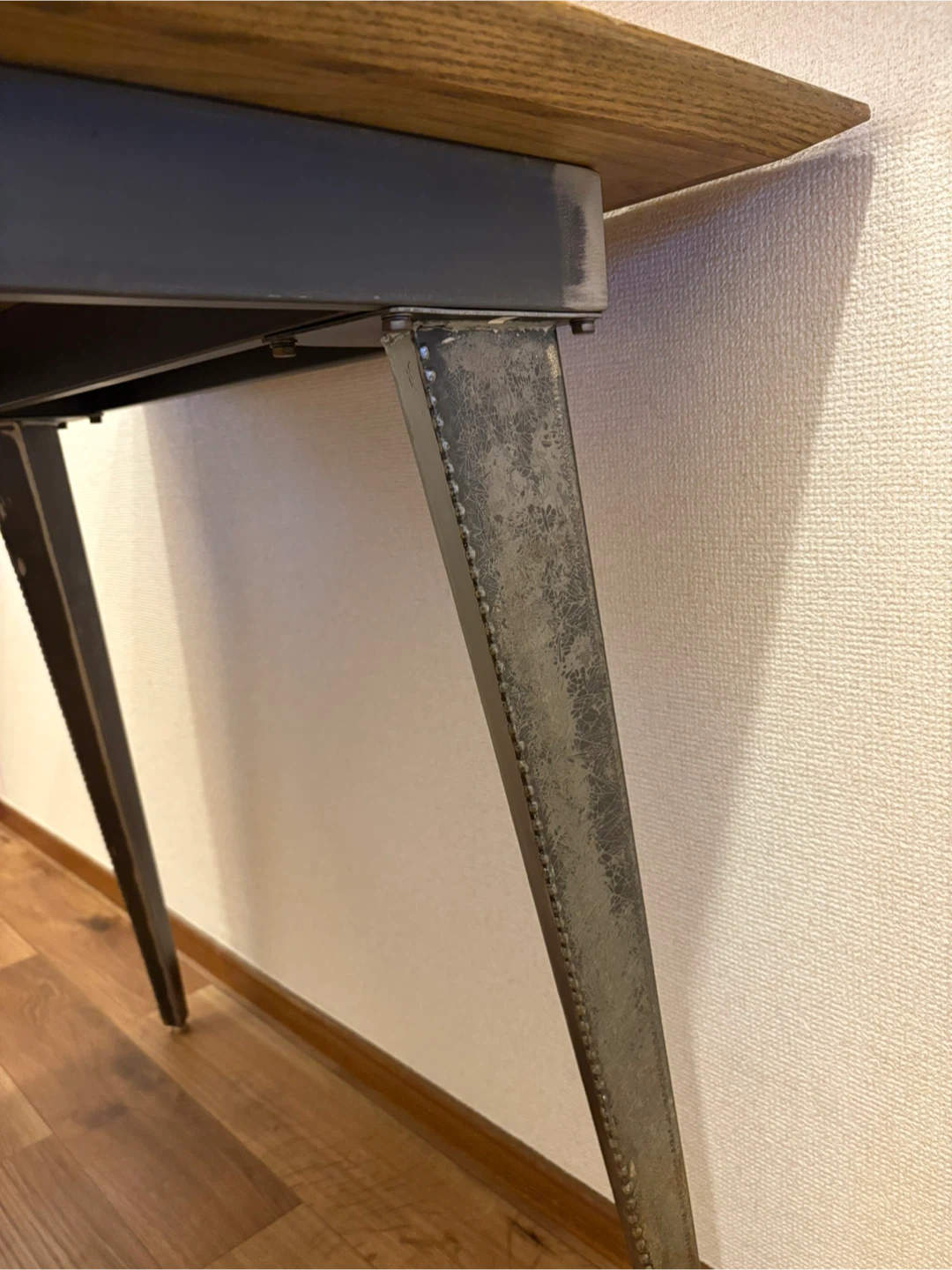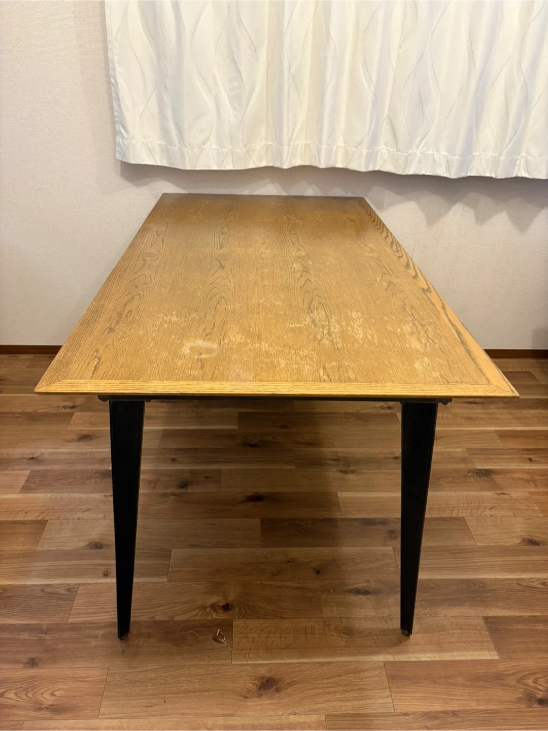 ダイニングテーブル キャロットさんインスタ広告掲載記念⭐︎ お値引きいたします!!!!! ブランド品名: JOURNAL STANDARD FURNITURE ジャーナルスタンダードファニチャー 商品名: CHRYSTIE DINING TABLE クリスタルダイニングテーブル 現在は売り切れてしまっている物です。 定価: 商品説明:Webページ参照 木目が美しいオーク材とスチールを組み合わせたダイニングテーブル。テーパーカットが施された天板、ハの字型の脚部、溶接やグラインダーの跡など、計算されたデザインがインダストリアルな雰囲気を演出します。脚先にはクリスティシリーズのためにデザイン・製作された真鍮のアジャスター付き。仕上げには「JSF METAL WORK SUPPLY」のプレートが取り付けられ、よりビンテージ感を強めています。 幅 150cm 奥行 80cm 高さ 73cm 重量感、安定感のあるダイニングテーブル 4年ほど使用しました。 表面には輪染みや汚れがあります。調べたところ綺麗にする方法はあるようで すが、今回はこのまま出品させていただきます。解体せずこのままのお引き渡しになります。 大きく重い物なので、取りにいらっしゃる際はお2人は必要かと思います。