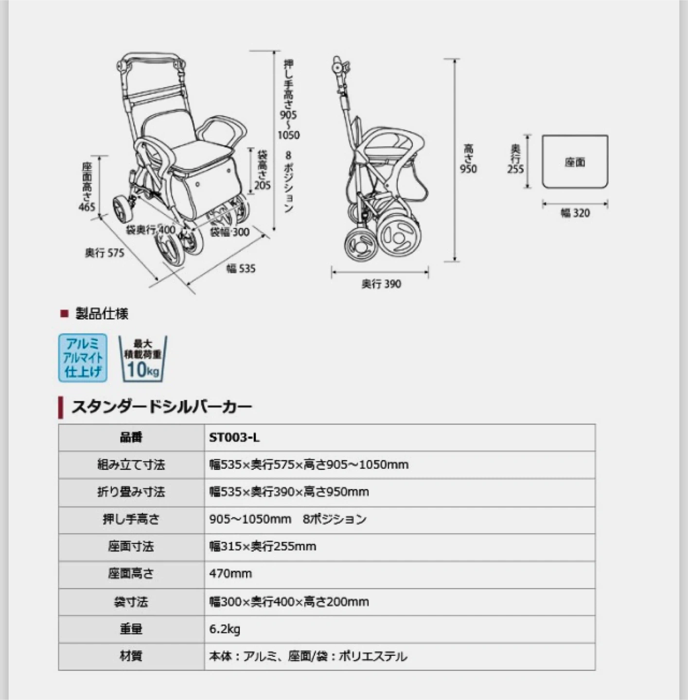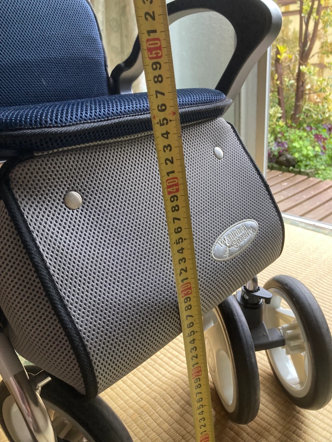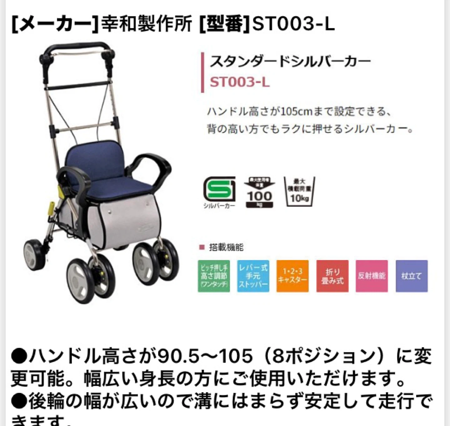 歩行補助車です。状態 良 綺麗 ・サイズ: - 幅 約40cm - 奥行 約56cm - 座面高さ 約28cm - 背もたれ高さ 約39cm ・型番:ST003-L スタンダードシルバーカー 主な特徴 背の高い方でも使いやすいよう、ハンドルの高さが90.5〜105cmまで8段階に調節可能です。 後輪が広く溝にはまりにくい構造になっており、安定した走行が可能です。 ハンドブレーキと駐車ブレーキ(手元押し下げ式)の両方を備えており、安全に使用できます。 3WAYキャスター(直進固定・回転角度90度・360度回転)により、操作性が高いです。 本体重量は約6.2kgで、耐荷重は100kgです。 中古品であることをご了承ください。