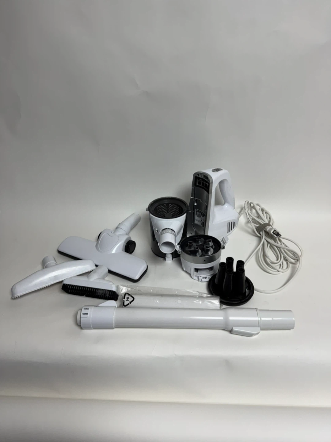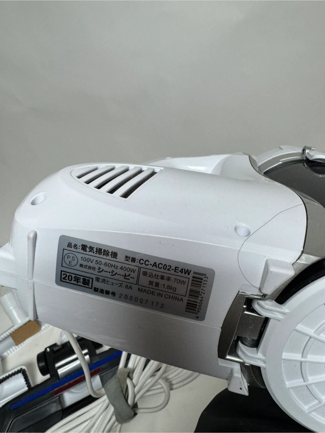 電気掃除機です。 コード式で取り扱いやすいコンパクトなタイプです。 ご覧いただきありがとうございます。 フィルター含めてすべて清掃済みです。 目立った傷汚れはございませんが、使用感については写真でご確認ください。 使わない時はコンパクトに分解できるため、収納時にも場所を取りません。 型番:CC-AC02-E4W - 製品名: 電気掃除機 - 色: ホワイト - 付属品: 各種ノズル、延長パイプ - 電源: コード式 - フィルター: 取り外し可能フィルター - デザイン: コンパクトデザイン ご希望の方はお気軽にご連絡ください。