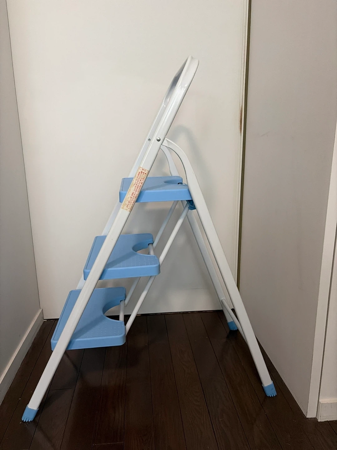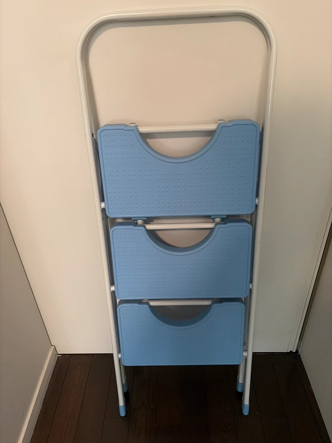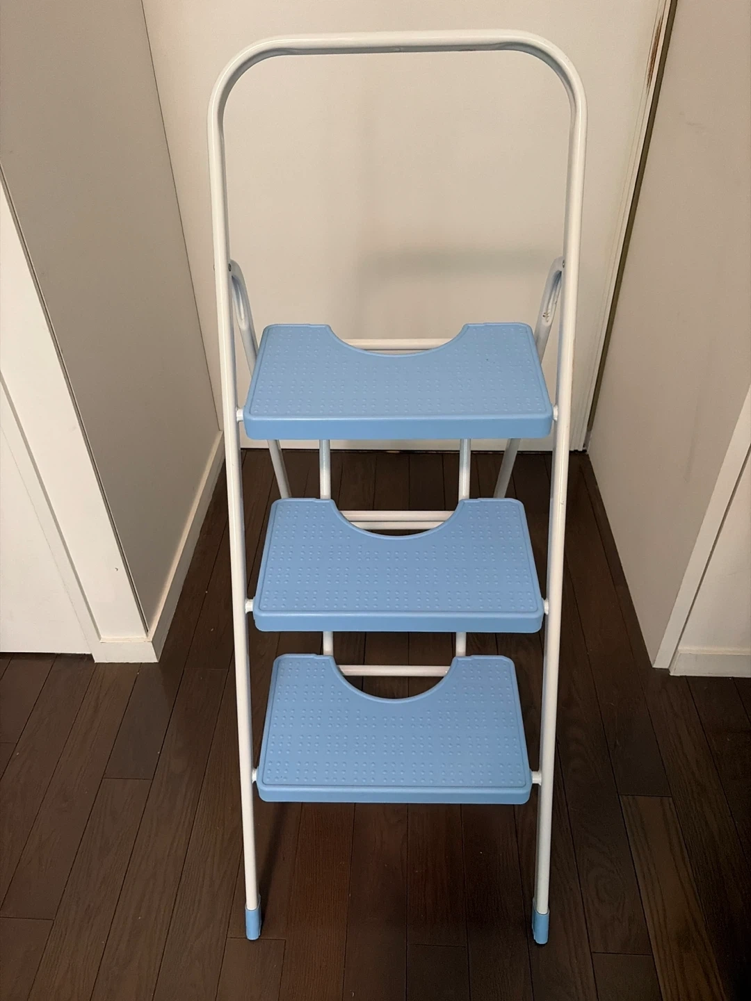 ステップ台3段です。 ・色:水色と白 ・3段ステップ ・使用感あり 中古品であることご了承ください。引越しなどに活躍しておりましたが使用頻度があまり少なく、出品します。足から足まで広げて約70センチ、 3段目まで、かつステップの面までふくめて約66センチ、足、ステップの幅が約40センチです。 重量は不明ですがスチールなのでそれなりに重たいです。 よろしくお願いします。