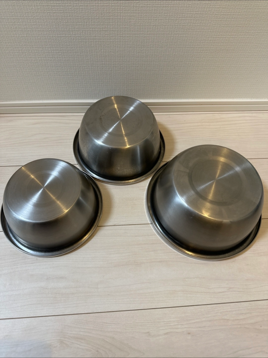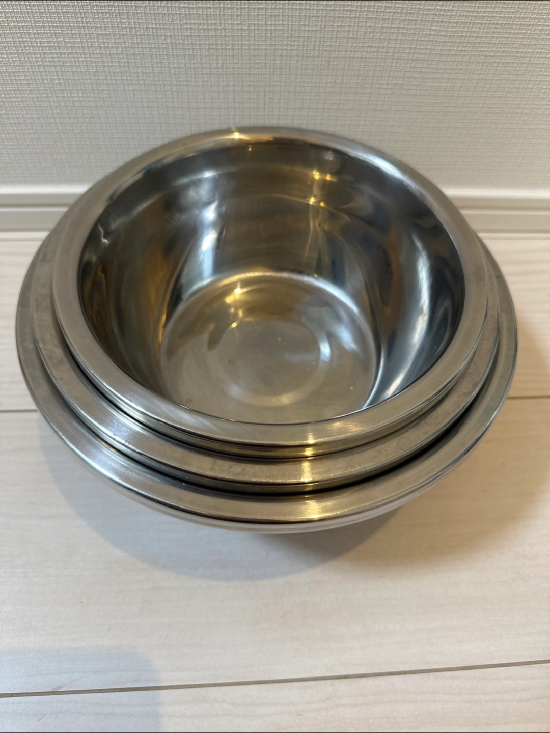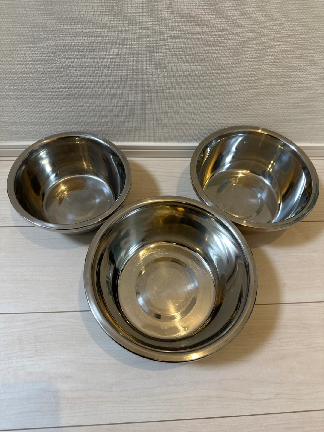 ご覧頂きありがとうございます♪ ☆ ステンレス製のボウル3点セット です。 ☆ステンレス製なので耐久性に優れています。 ☆大・中・小の3サイズが揃っているので様々な料理や下ごしらえに便利です。 ☆重ねられるので収納スペースも コンパクにでき、有効活用出来ま す。 ★サイズ (直径)と深さ 大 24cm(外径) 22cm(内径) 深さ 約10cm 中 22cm (外径) 19.5 cm(内径) 深さ 約8cm 小 20 cm(外径) 18cm (内径) 深さ 7.5cm 完璧を求める方は店舗で新品を定価にてご購入ください。