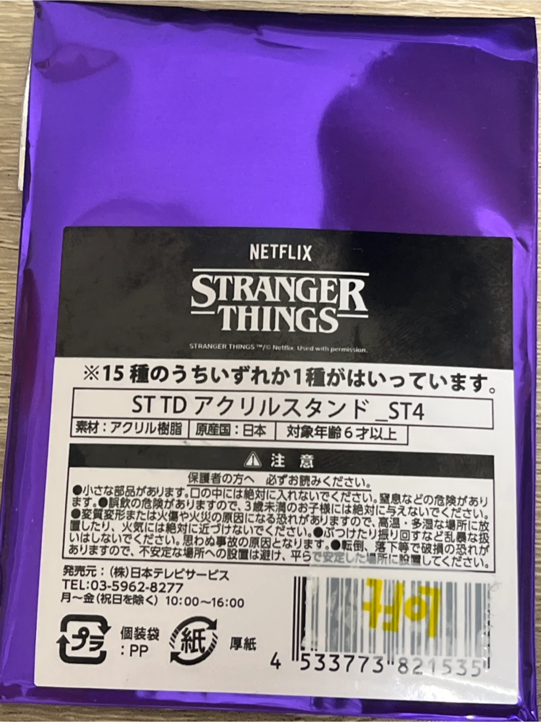 ストレンジャーシングスのマレーのアクリルスタンドです。 渋谷ロフトで購入しました。 中身確認するため開封しました。アクスタは新品です。