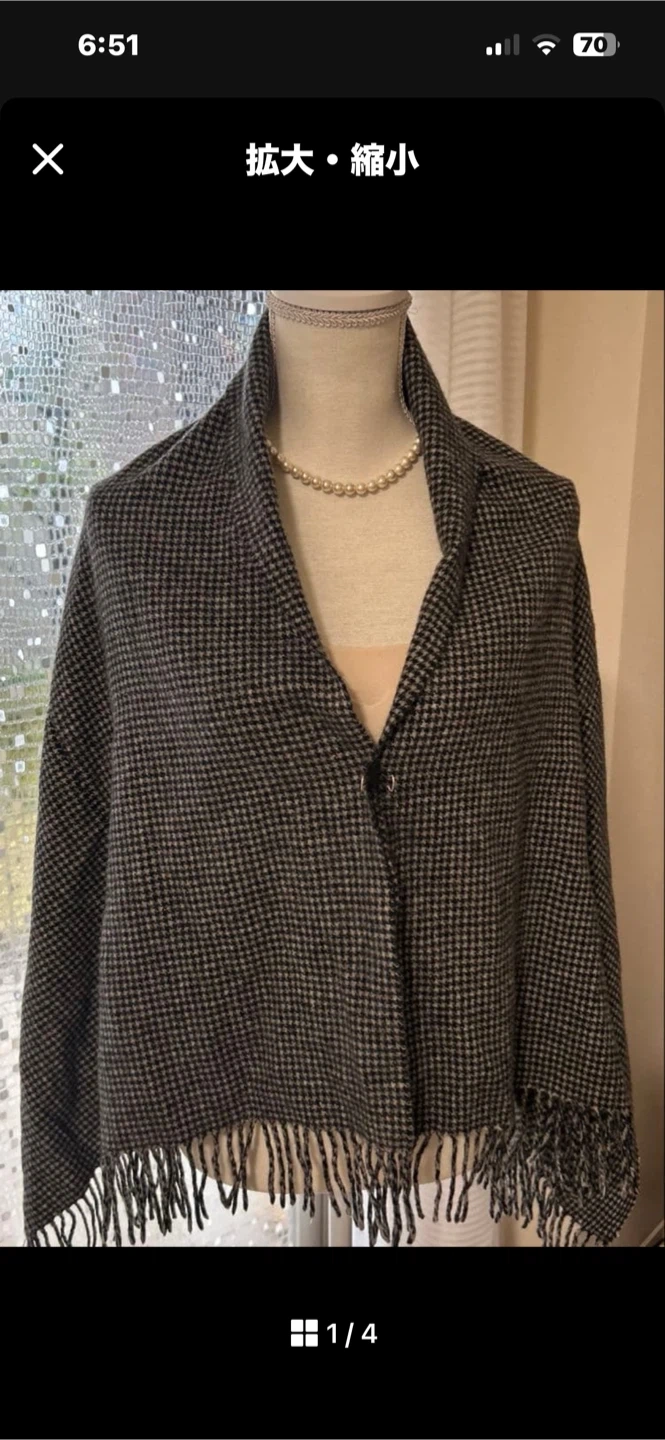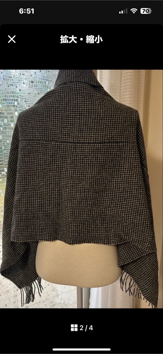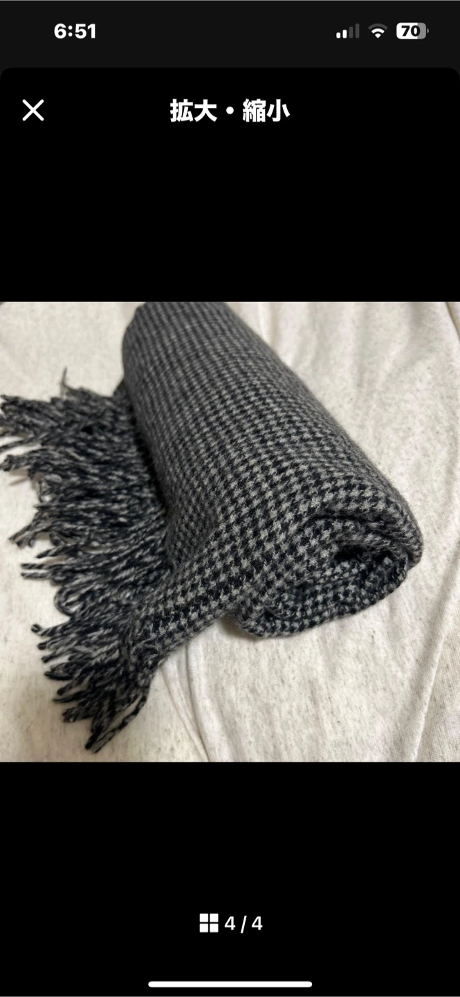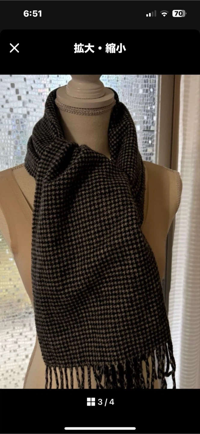 千鳥格子のマフラーストールです マフラーを2枚縫い合わせています ウール100%ストール 千鳥柄 幅63 長さ140+フリンジ7 カラー···グレー 素材···ウール ・色:グレー、黒 ・デザイン:千鳥格子 ・状態:使用感少なめ ご不明点があればお気軽にご連絡ください
