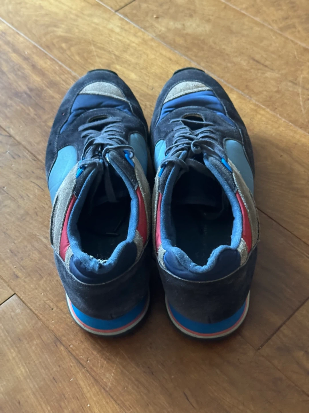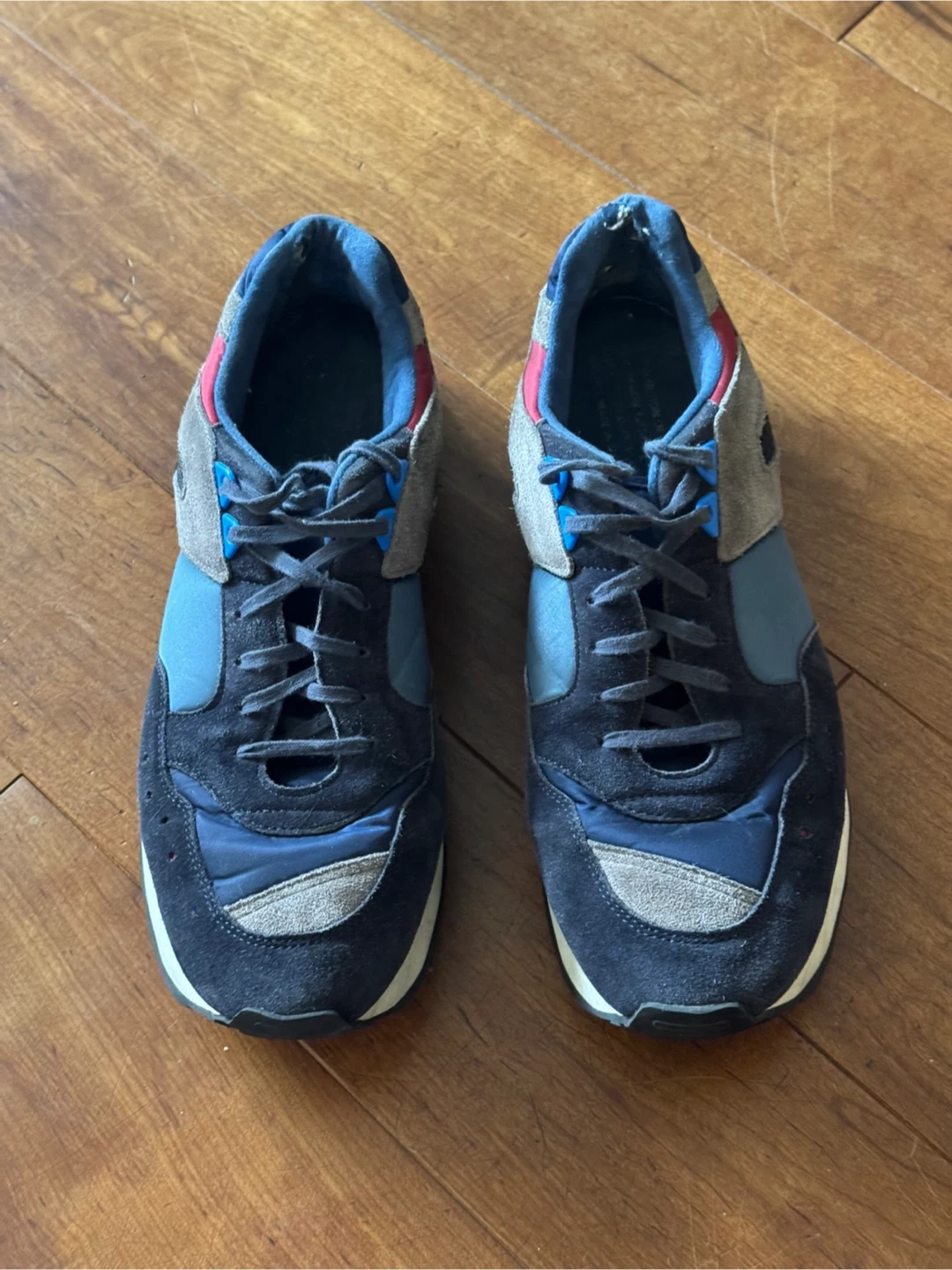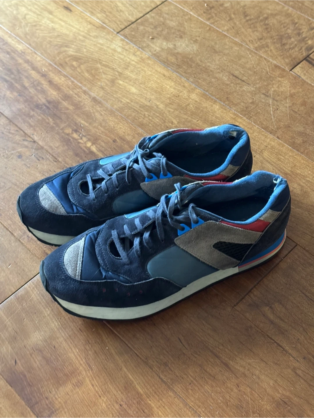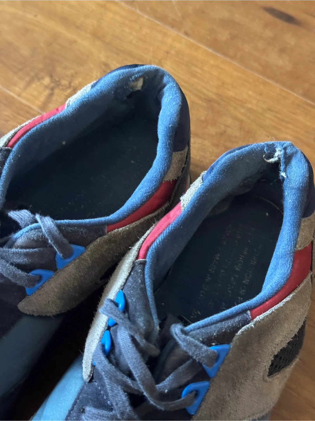 フランス軍物を復刻したスニーカーです。 [リプロダクション オブ ファウンド] フレンチトレーナー 【1300FS】 スニーカー スロバキア製 ミリタリー シューズ 靴 フランス軍 スエード ナイロン製です。サイズは、27.5cmです。 ・色:紺色、グレー、水色、赤色 ・使用感あり、踵のところがほつれてます。 中古品であることご了承ください