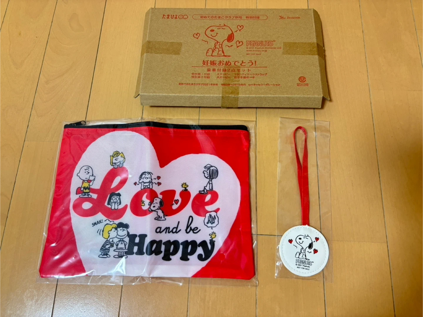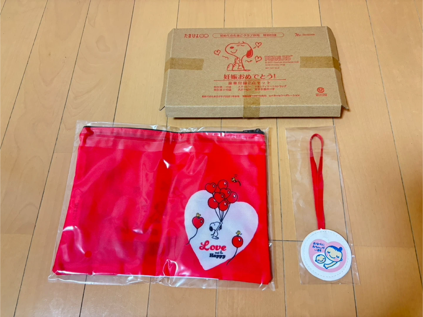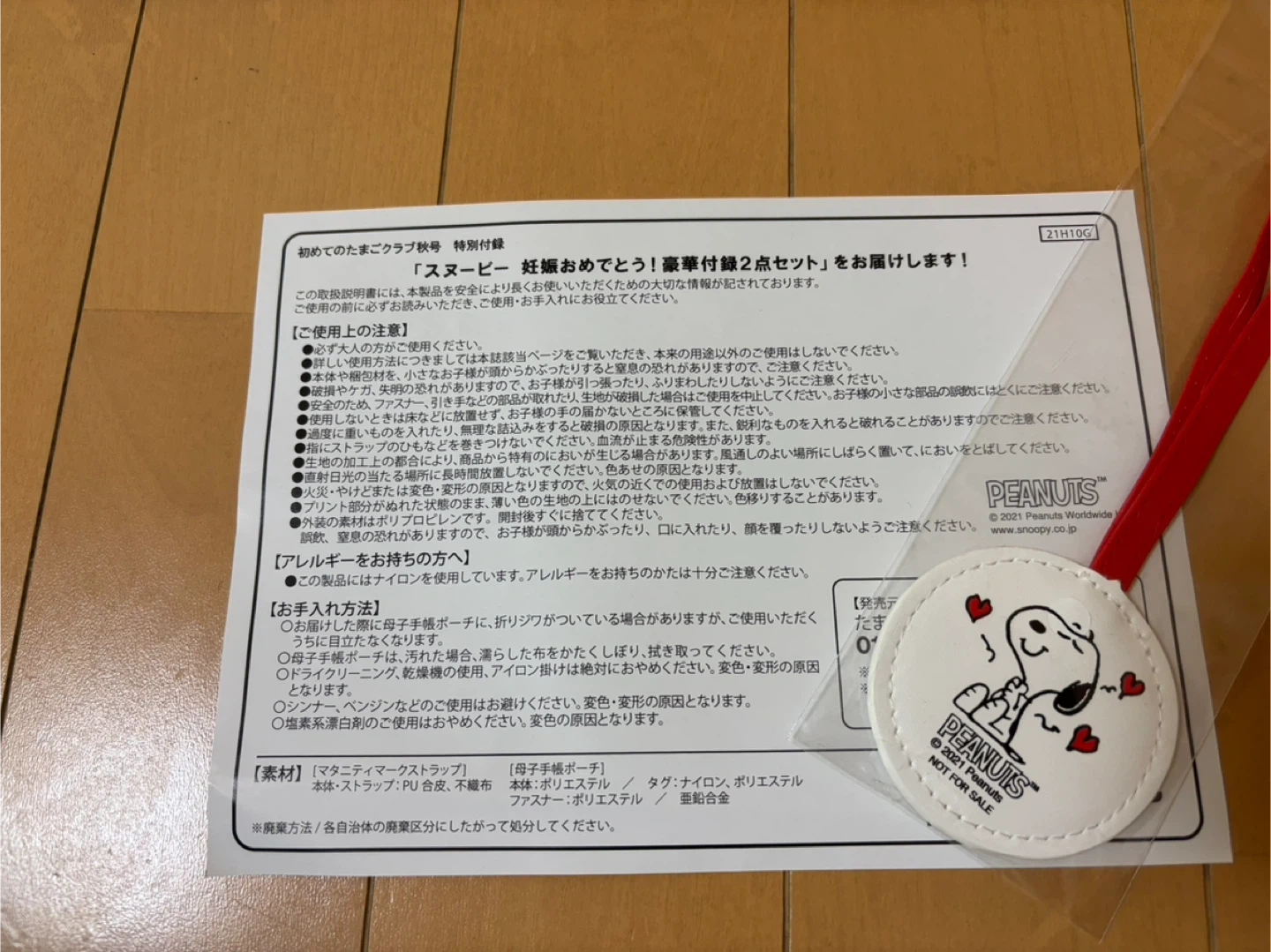 たまひよの付録です。マタニティマーク一つと手帳ケース。既にどちらも持っていたため、私は使用しませんでした。 マタニティマークは片面スヌーピー(写真1枚目)、もう片面がマタニティマーク(写真2枚目)です。 スヌーピー大好きな方にぜひ!