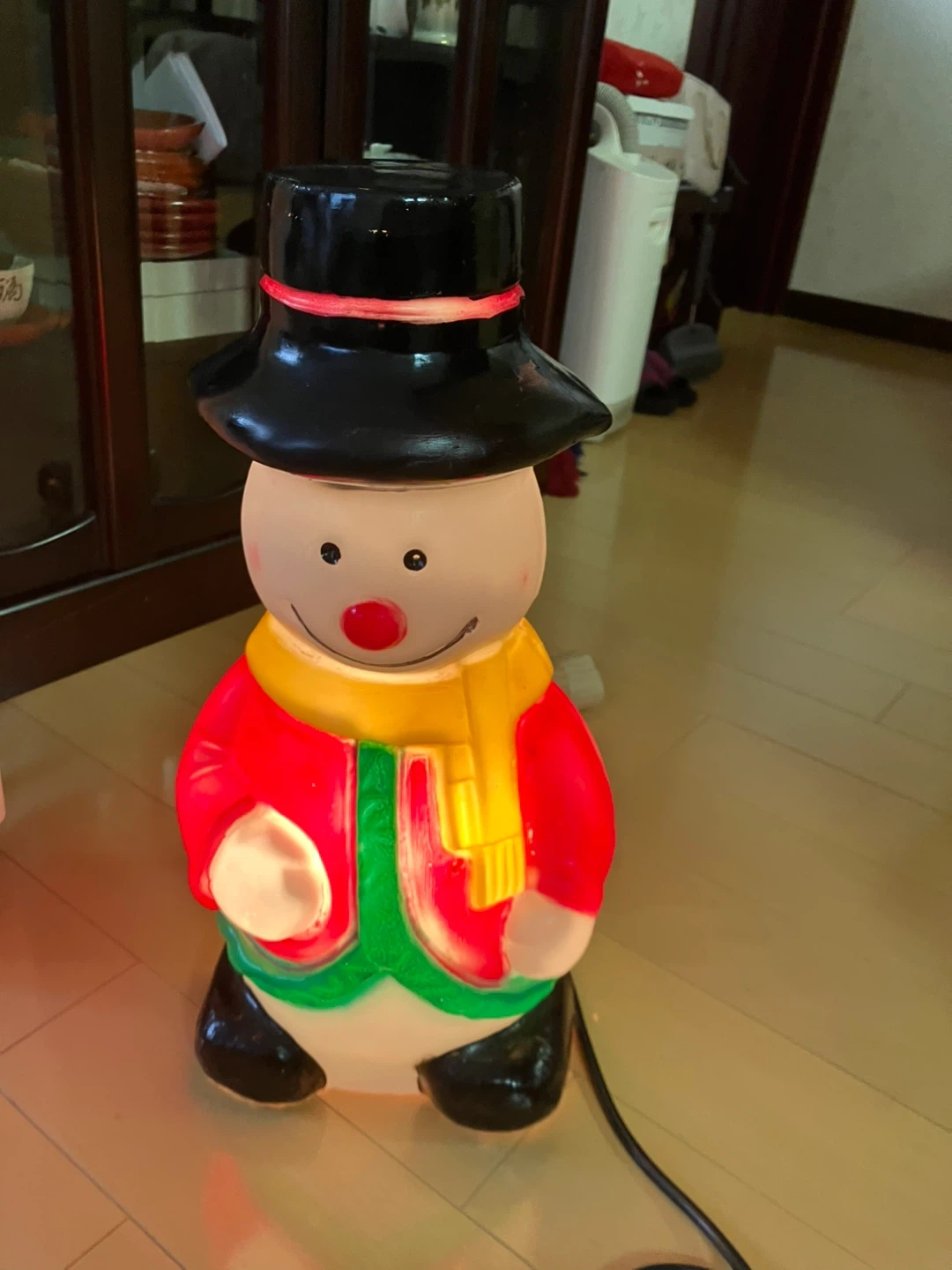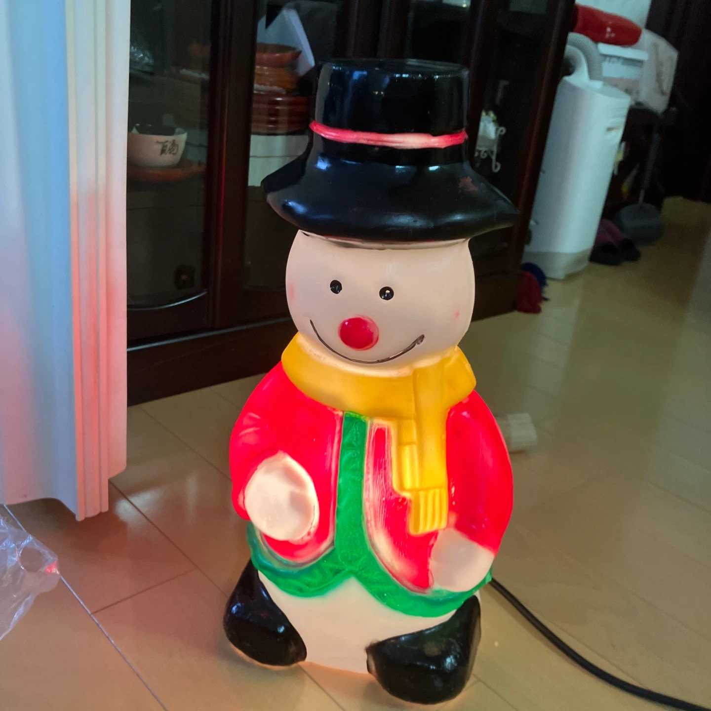スノーマンのライト置物です。 ・色:赤、白、黒、黄色、緑 ・クリスマス用 未使用 動作確認に電気つけました