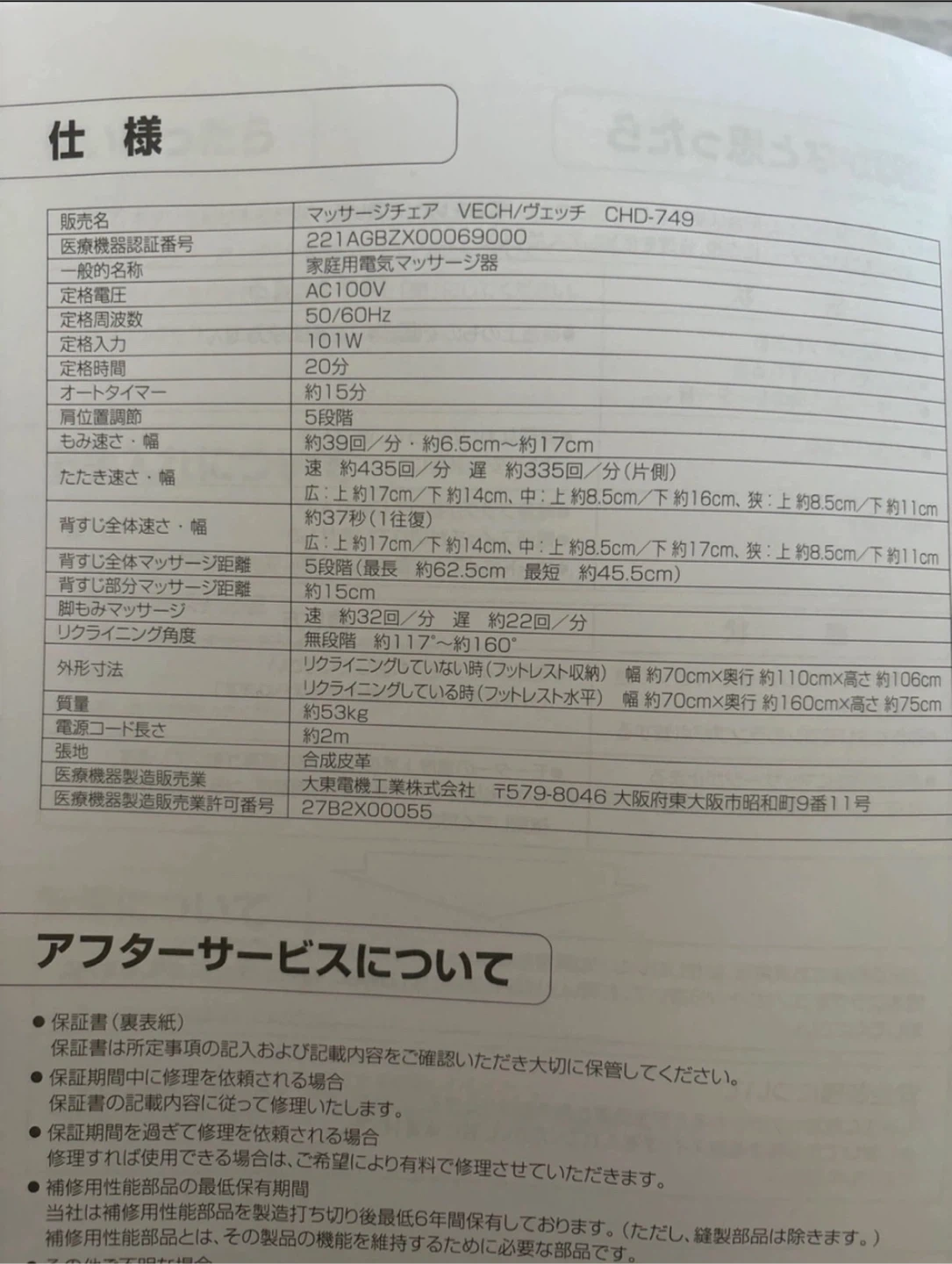 スライヴ VECH ヴェッチ 型番:CHD-749 マッサージチェア ☆動作確認済み ☆リクライニング可能 ☆フットマッサージ可能 ☆取扱説明書あり ♡もみ、たたき、背筋等、自分のお好みで選べる ♡幅調整や肩位置も選べます ♡足の部分も上がります 【仕様】 サイズ(フットレスト収納):幅70×奥行110×高さ106センチ サイズ(フットレスト水平):幅70×奥行160×高さ75センチ 重量:約53kg 張地:合成皮革 消費電力:101W(100V 50/60Hz) 定格時間:20分 オートタイマー:15分 肩位置調節:5段階 【商品説明】 THRIVE(スライヴ) マッサージチェア VECH/ヴェッチ CHD-749。 11種類の自由選択コースと3種類の自動コースで全身リラックス! フットレストはオットマンとしても利用できます。 ・座面に8個のエアバックが内蔵! ・内蔵のもみ玉角度の変更 ・全身マッサージ ・背筋マッサージ ・脚マッサージ ・エアマッサージ 経年劣化によりボロボロになってしまいましたが、動作に問題はありません。 10年以上前に購入し、ボロボロになってからはタオルケット等をかけて使用していましたが、いつのまにか使用せず置いたままだったので出品します。 かなりの大きさと重さがありますので、お車等で自宅まで取りに来られる方、よろしくお願いします!