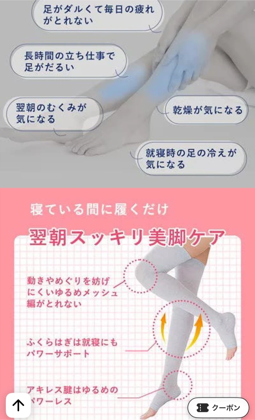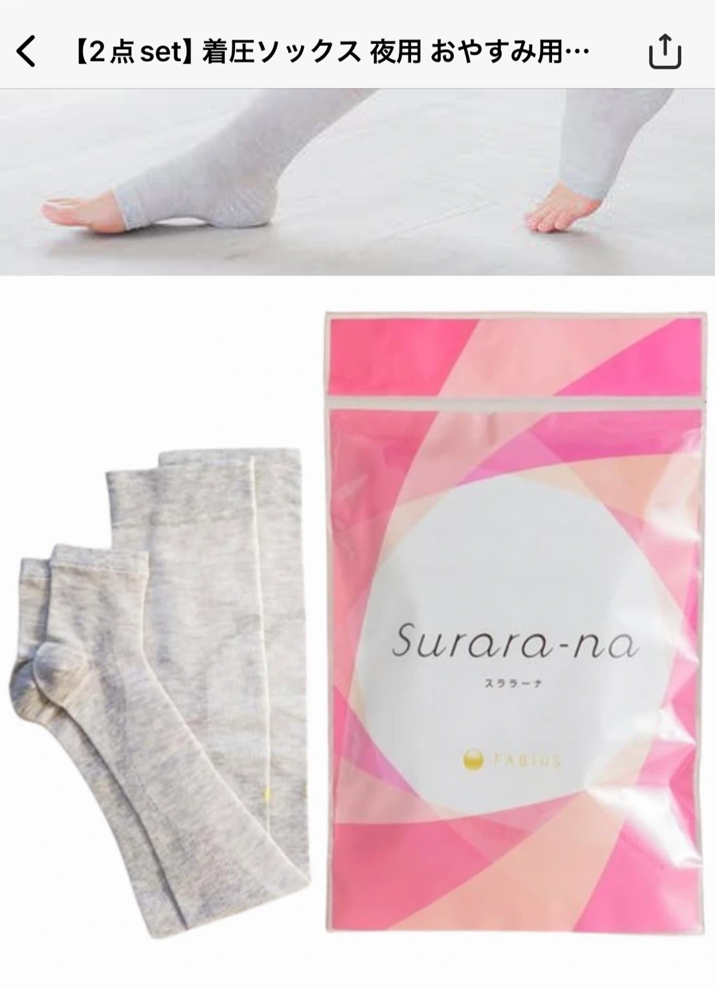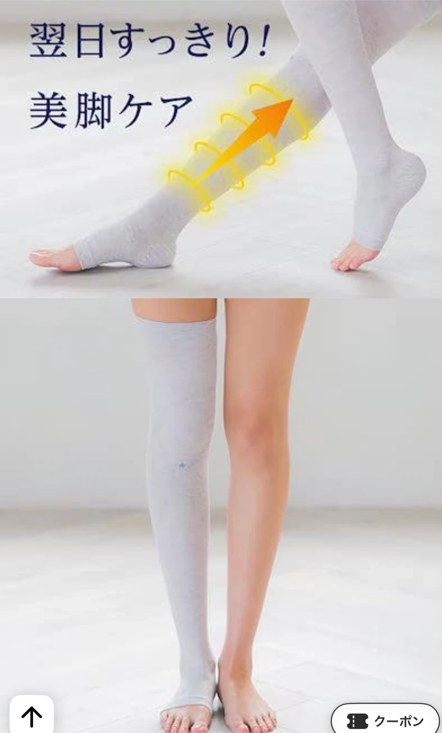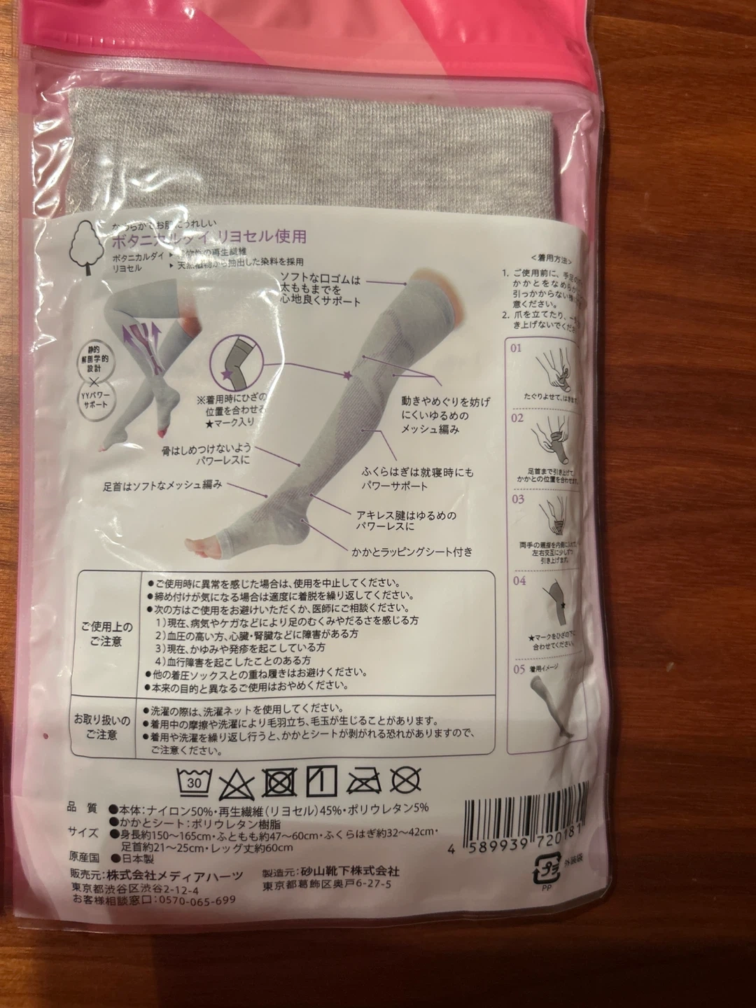 商品紹介 足首、ふくらはぎ、膝上まで部位ごとに適した段階圧力設計の夜用着圧ソックス ●段階圧力設計で無理ない締め付け感 ●メッシュ編みで引き締めをサポート 〇こんなお悩みはありませんか? ・長時間の立ち仕事やデスクワークによる脚の疲労が気になる ・出張、旅行などの長時間の乗り物移動による疲労を感じる ・脚がダルくて毎日の疲れがとれない ・翌朝のむくみが気になる ・冬の寒さ、夏の冷房による就寝時の冷えが気になる ・乾燥が気になる ・圧力が強すぎる着圧ソックスが苦手 〇サイズについて ・身長150~165cm ・ふともも47~60㎝ ・ふくらはぎ32~42㎝ ・足首21~25㎝、レッグ丈60㎝ 〇ご使用方法 (1) たぐりよせて、つま先が出るまで履きます。 (2) 足首まで引き上げ、かかとシートの位置にかかとを合わせます。 (3) 両手の親指を内側に入れて、左右交互に少しずつ引き上げます。 (4) ★マークを膝の下に合わせてください。 ※破れや伝線を防ぐためのご注意点 1. ご使用前に、手足のつめやかかとをなめらかにし、引っかからないようにご注意ください。 2. 爪を立てたり、一気に引き上げないでください。 〇ご使用上のご注意 ・ご使用時に異常を感じた場合は、使用を中止してください。 ・締め付けが気になる場合は適度に着脱を繰り返してください。 ・次の方はご使用をお避けいただくか、医師にご相談ください。 (1) 現在、病気やけがなどにより足のむくみやだるさを感じる方 (2) 血圧の高い方、心臓・腎臓などに障害のある方 (3) 現在、かゆみや発疹をおこしている方 (4) 血行障害を起こしたことのある方 ・他の着圧ソックスとの重ね履きはお避けください。 ・本来の目的と異なるご使用はおやめください。 〇お取り扱いのご注意 ・洗濯の際は、洗濯ネットを使用して下さい。 ・着用中の摩擦や選択により毛羽立ち、毛玉が生じる場合があります。 ・着用や洗濯を繰り返し行うと、かかとシートがはがれる恐れがあります。 材料/素材:ナイロン50% 再生繊維(リヨセル)40% ポリウレタン5%