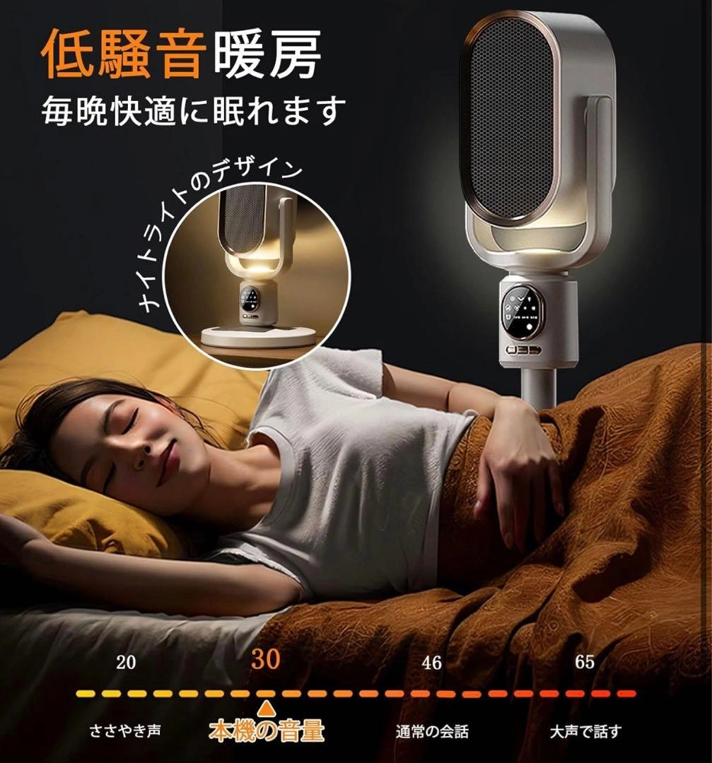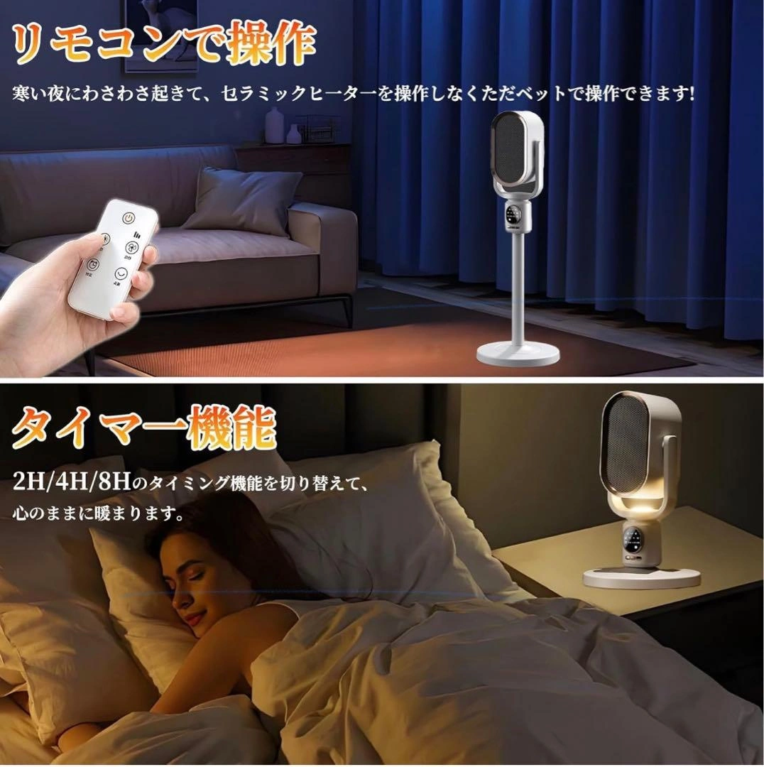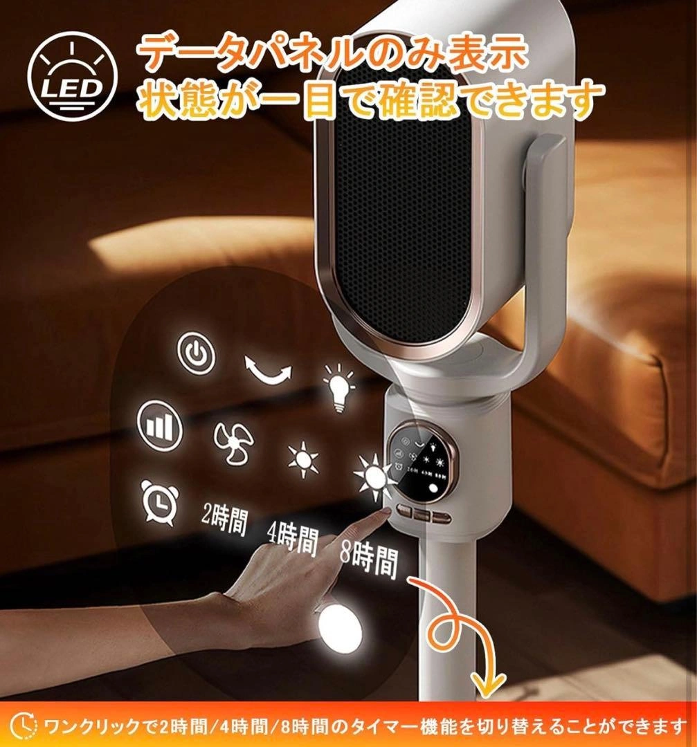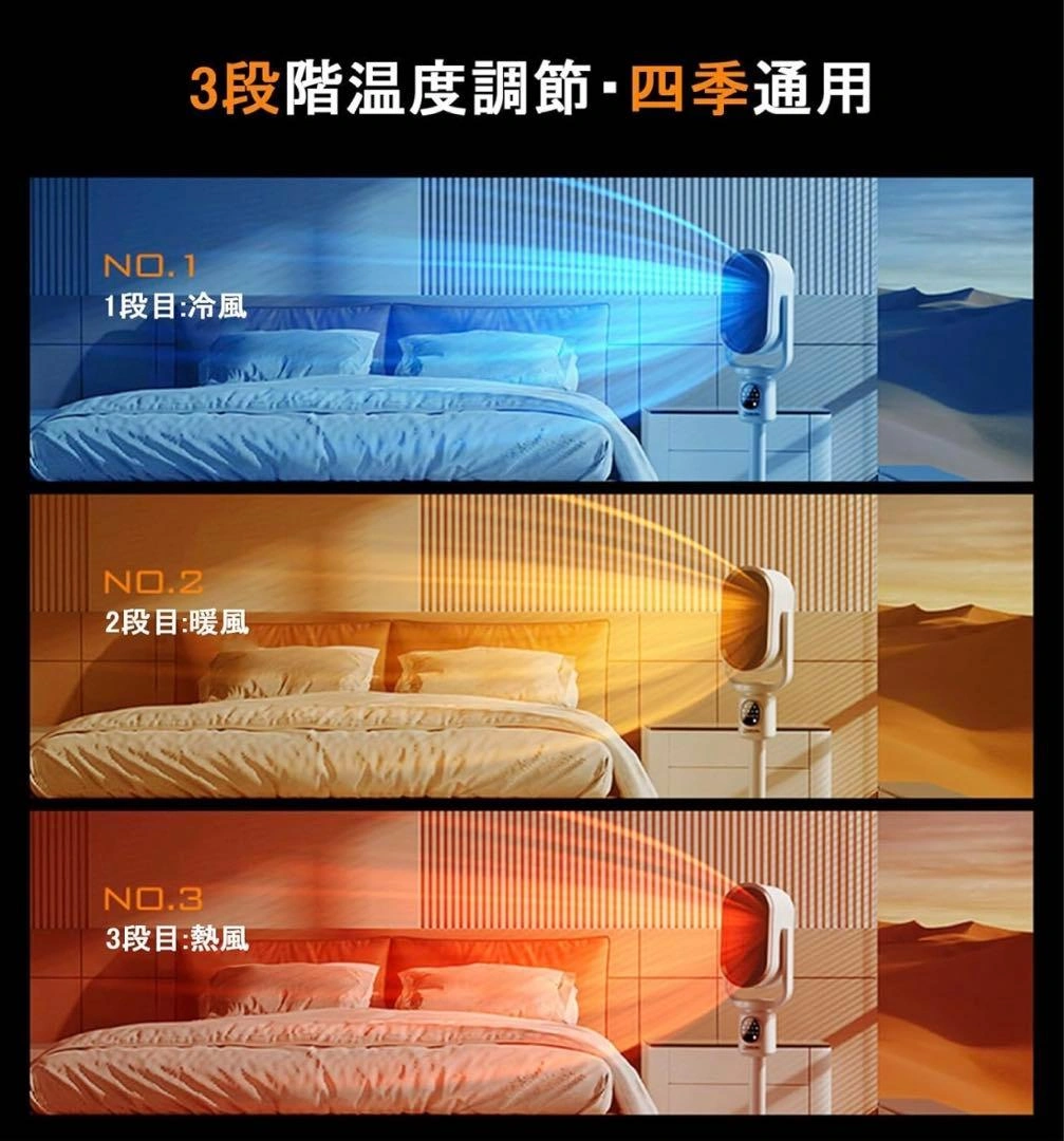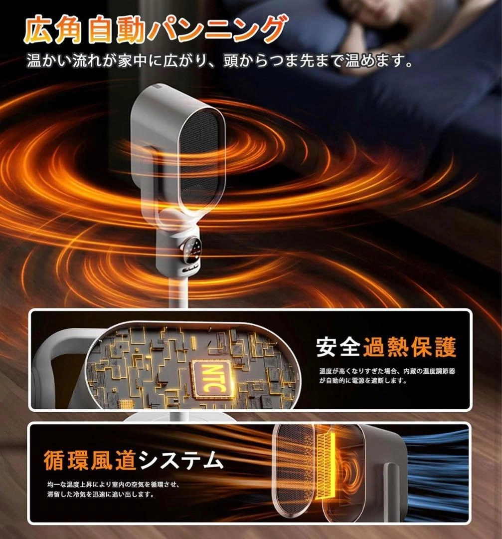 ご覧頂きありがとうございます。 最新PTCセラミックヒーター(1500W)搭載で、電源ONからわずか2秒で温風がお部屋全体に行き渡ります。冷風 暖風 熱風の3モード切替可能で、夏は涼風、冬はぽかぽか温風と季節を問わず活用できます。110°の自動左右首振り機能と110°の手動上下調節を組み合わせることで、足元から胸元までムラなく暖房。 国際安全基準V0等級の難燃材を使用し、転倒時即時OFF機能・過熱防止センサー・安全プラグを完備。特許取得のメッシュカバー設計で、高温部に誤って触れてもやけどを防止します。重心を低くした安定性抜群の土台で、強風時やペットがぶつかっても転倒しにくい構造です。 付属のリモコンで運転モード・首振り・タイマー設定を簡単操作。2時間/4時間/8時間の3段階タイマー機能付き。静かさを実現した特殊ファンデザインで、夜間の運転も睡眠を妨げません。 付属のアジャスタブルスタンドで、42cm/59cm/77cmの3段階高さ調節が可能。デスクワーク時の足元暖房から、リビングの広範囲暖房まで、シーンに合わせて最適な高さに調整できます。コンパクト設計(幅23×奥行き18cm)ながら、最大30畳(約50㎡)までの空間を効率的に暖房。軽量(3.2kg)で内蔵ハンドル付きです。 ご不明点はお気軽にお問い合わせください。