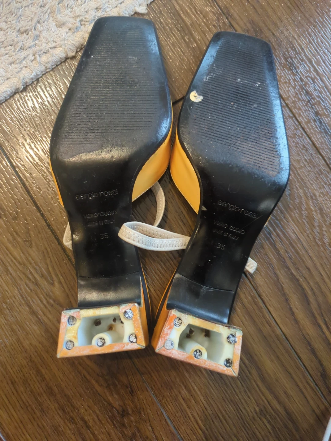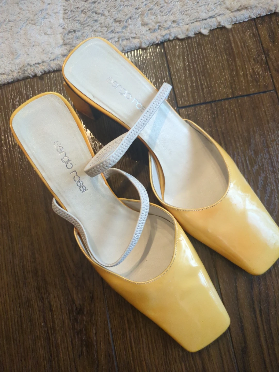 ※有料商品と同時購入の方にお譲りします。 セルジオロッシのミュールです。 ・ブランド:セルジオロッシ ・サイズ:35 ・色:黄色 ・状態:使用感あり、リフト交換が必要です。 履いた回数は少ないのですが、長年保管していたら変色した部分があります。 形も綺麗で、リフト交換すればまだまだお使いいただけます。購入当時4万くらいだったと記憶しています。 こちらは無料でお譲りしますが、恐れ入りますが他の有料商品と同時購入の方を優先させていただきます(トラブル防止のため) ご理解くださいませ!