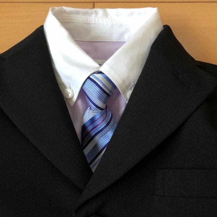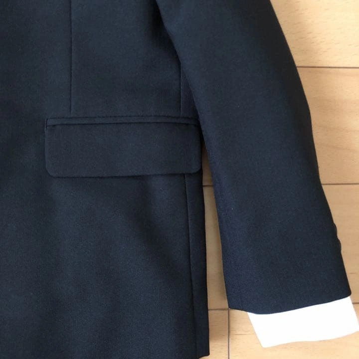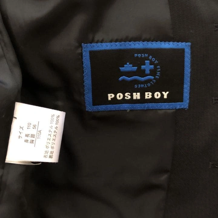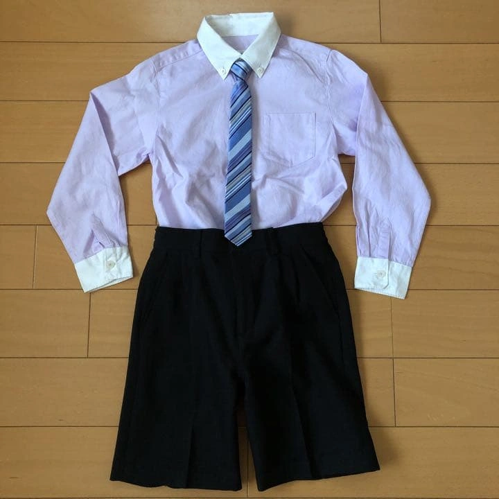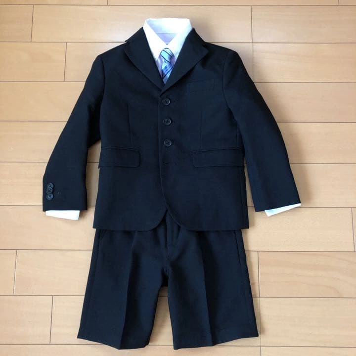 kids 男の子用スーツ、シャツ&ネクタイ一式 スーツ…POSH BOY【110cm】 シャツ&ネクタイ…COMME CA FILLE 【120cm】 ブラックにストライプの地模様が入っていて、シンプルなスーツです。(写真3枚目参照下さい) ブルーシャツでは無難にまとまってしまうので、シャツを薄紫色のボタンダウンシャツにしてブルーストライプのネクタイを合わせました。(写真5枚目下さい) 息子が2回着用、クリーニング店に出した後自宅保管していました。 ご質問があればコメントお願いします!