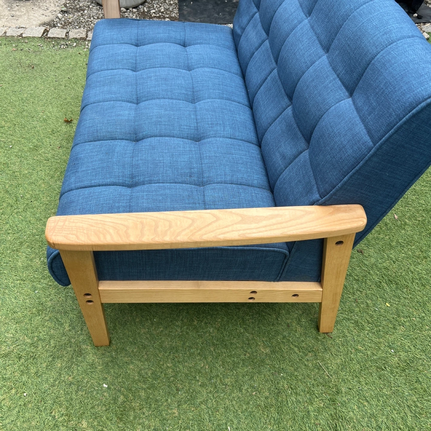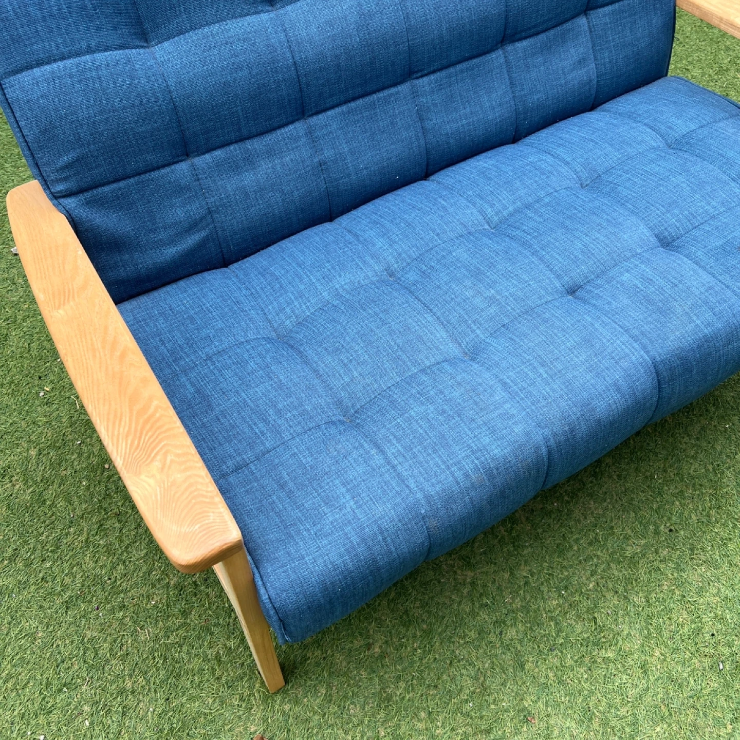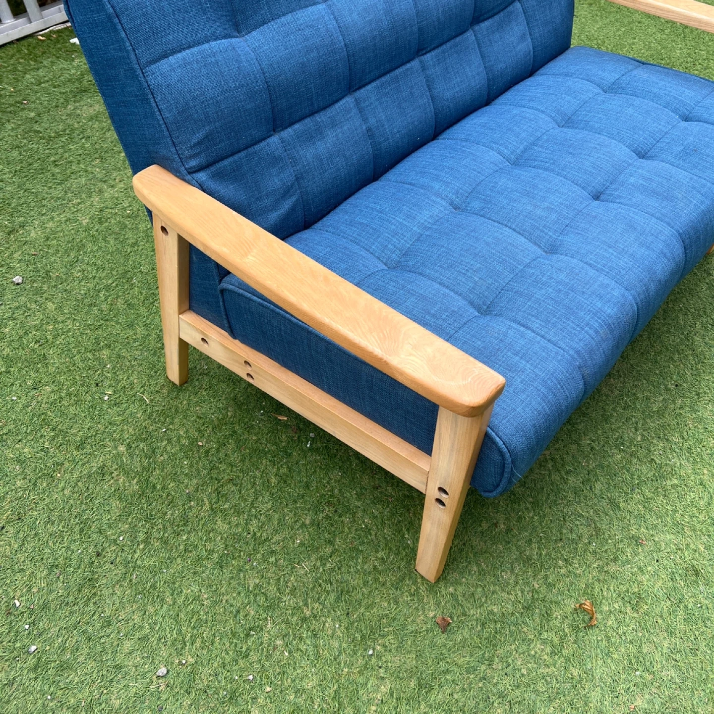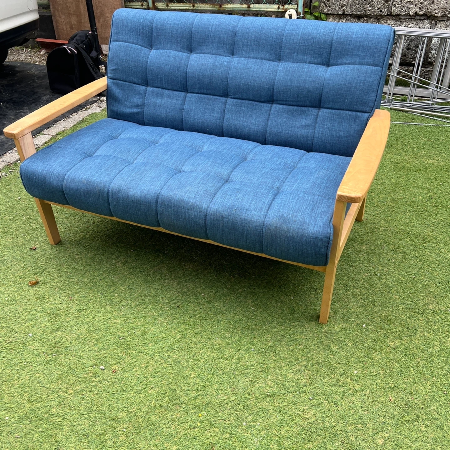 磯子区・南区・港南区・中区くらいであればプラス1,000円で配達可能です! ソファ 2人掛け ウッドフレーム 北欧風 幅125cm ( ソファー ソファ 2人掛け 二人掛け 2Pソファ ) 爽やかなブルーが日々の疲れをいやしてくれる、くつろぎのリビングにぴったりの2人掛けソファです。注目はトレンドの西海岸インテリアにぴったりの、デニム風生地を使ったマリンブルー。北欧テイスト溢れる鮮やかなデニムブルーもおススメです。ぬくもりのある天然木を使用したナチュラルフレームは、1点1点に木目が違う味のある仕上がりです。多重構造によるしっかりした座り心地で、心と体を優しく包み込むリラックス空間を演出してくれます。 【商品詳細】 サイズ/約幅125×奥行78×高さ76cm 座面高さ 約46cm 内容量/1台 材質/張地:布(綿、ポリエステル) クッション材:ウレタンフォーム、チップウレタン 主要部材:天然木、ウェービングベルト、Sバネ フレーム:天然木、塗装 生産国/中国製 型番/IW-79 使用に伴う、傷や汚れはあるかと思いますが、まだまだ使用可能です。 写真にてご確認くださいませ。 中古品をご理解の上ご検討下さいませ!