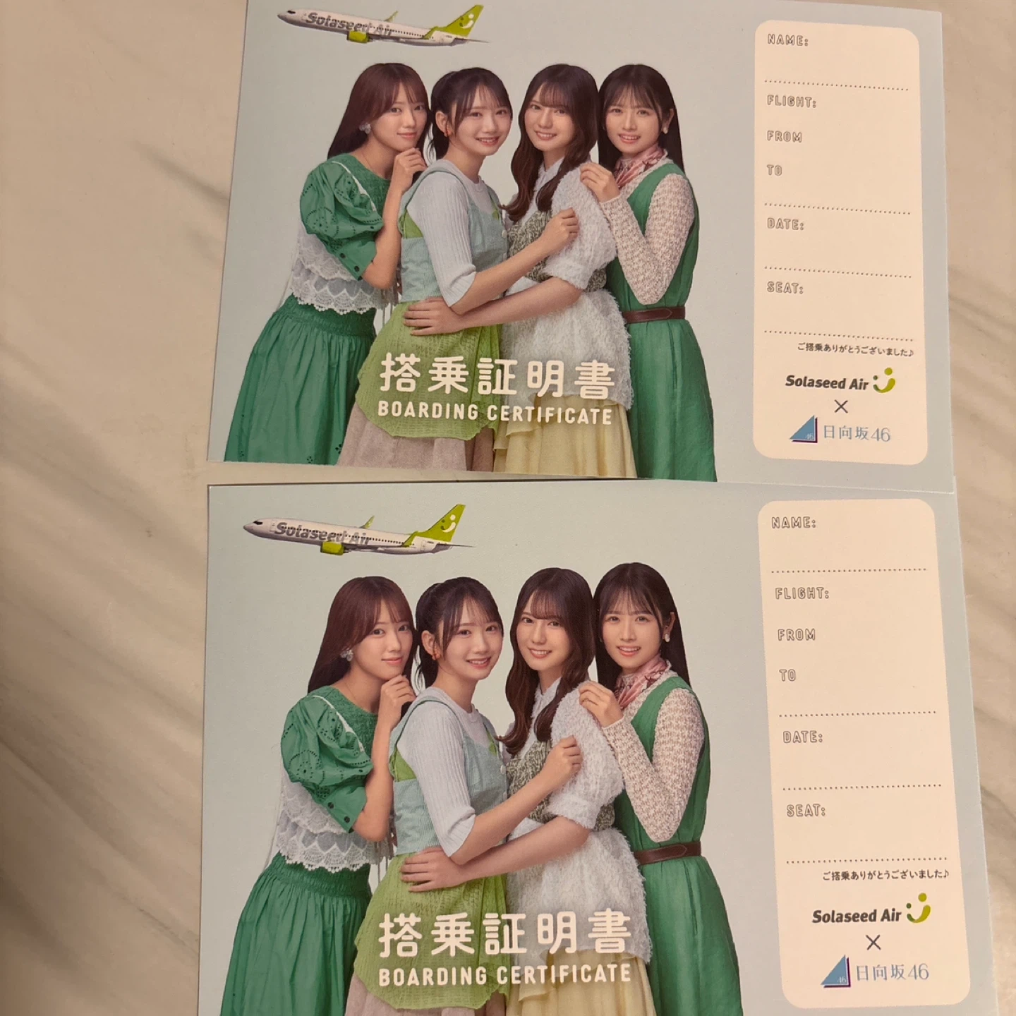ソラシードエアの搭乗証明書です。 ・ソラシードエアと日向坂46のコラボデザイン ・名前、フライト、出発地、目的地、日付、座席を記入できます ・2枚セット