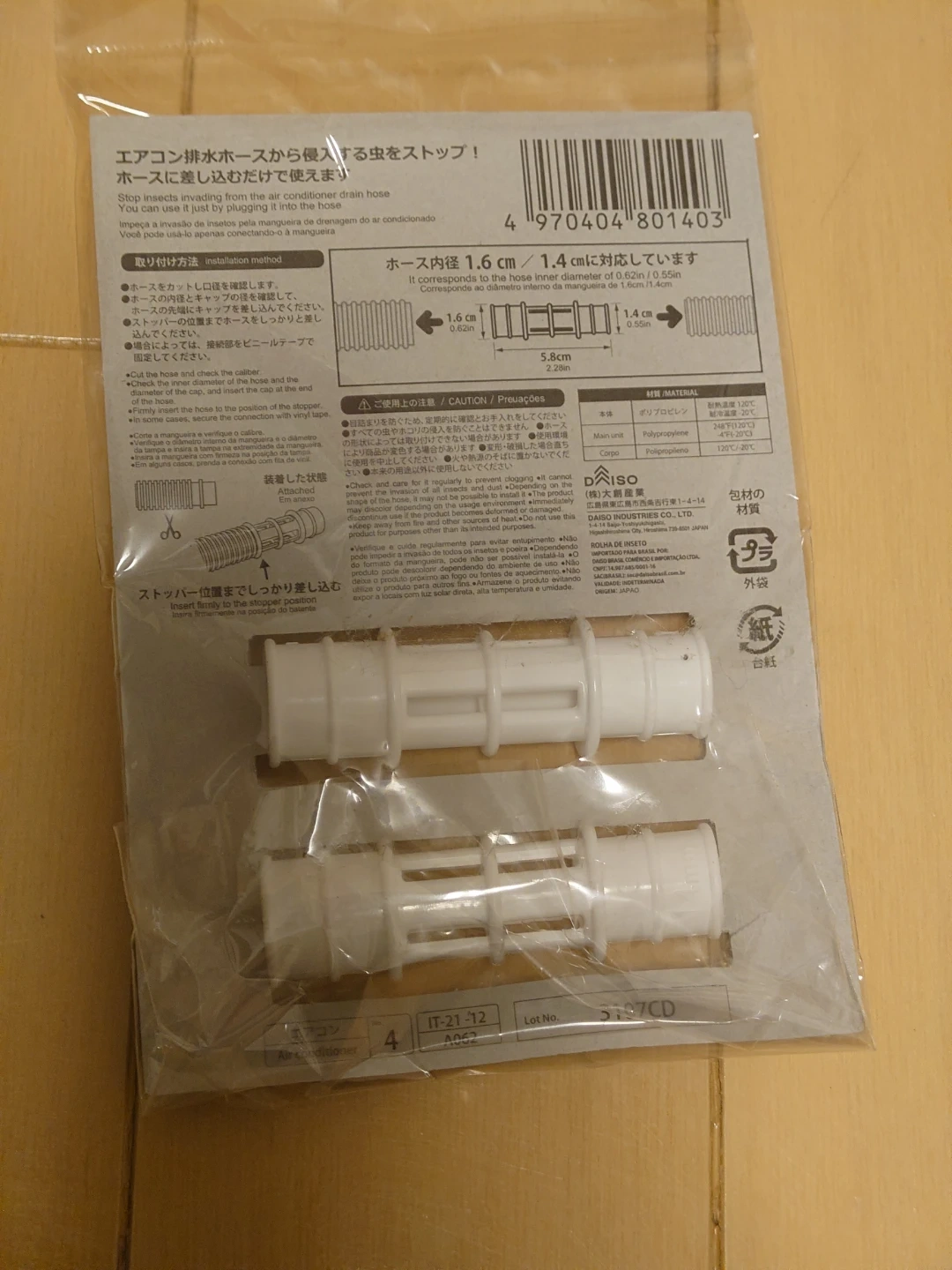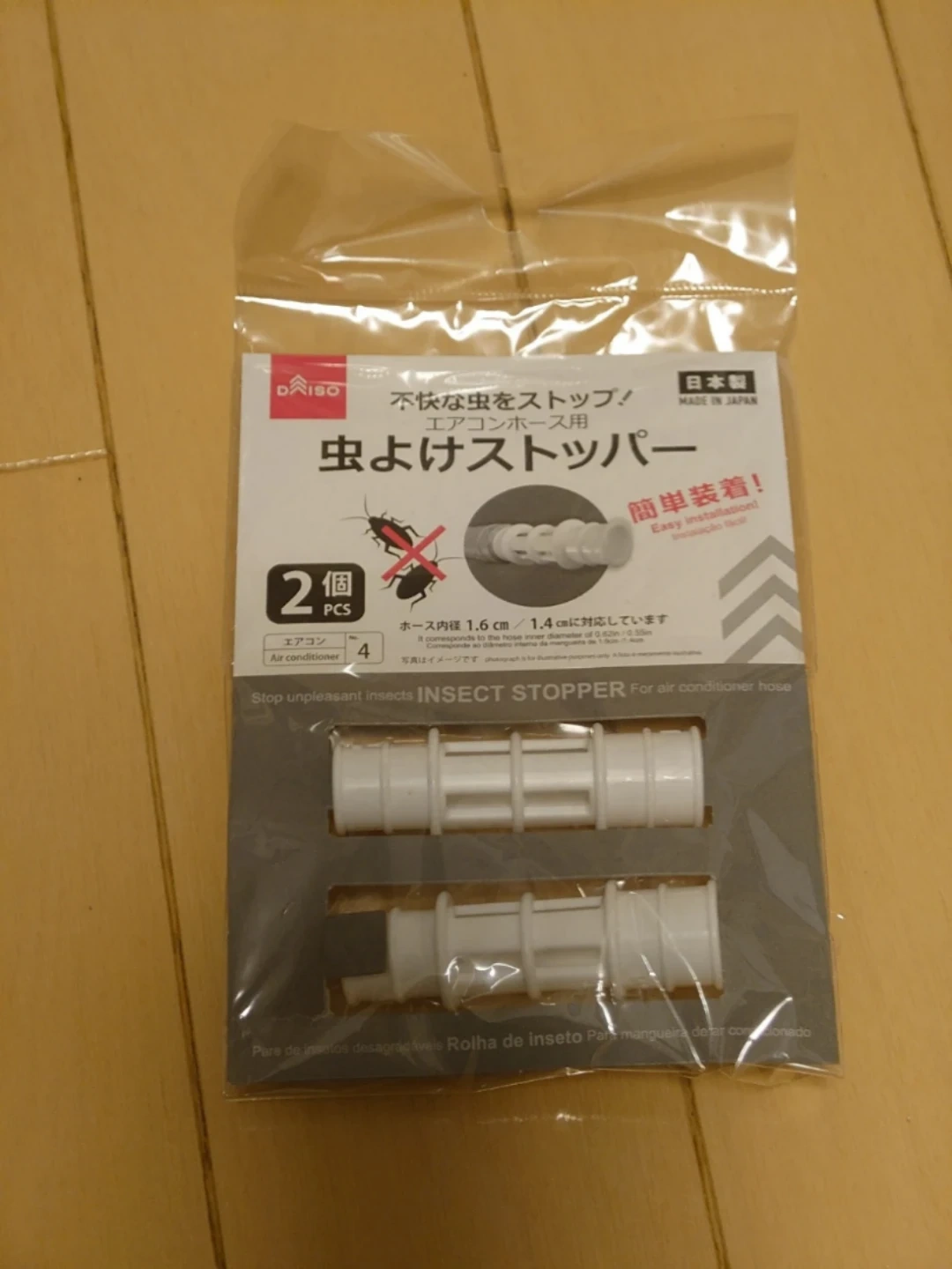 エアコン排水ホース用の虫よけストッパーです。 ・2個入り ・ホース内径1.6cm / 1.4cmに対応 ・開封済み、未使用品 開封して試してみたものの、サイズがあわなかったので未使用という状態です。ご了承ください。