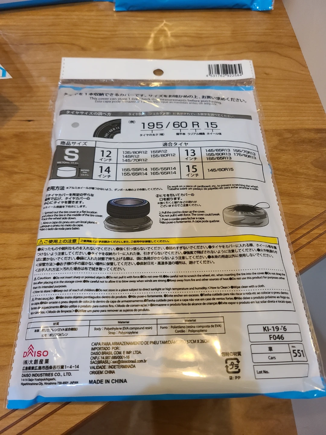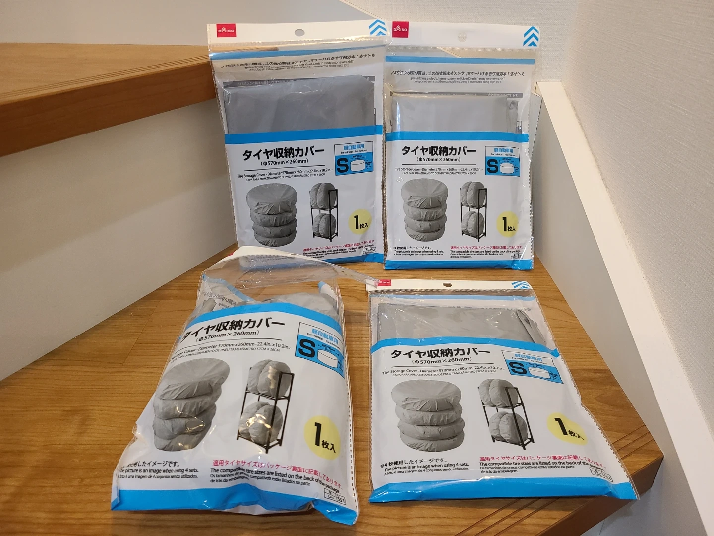 ダイソーのタイヤ収納カバーです。 ・サイズ:S(Φ570mm×260mm) ・状態:未使用品(1枚は使用して少し破れています) ・数量:4枚 ご不明点があればお気軽にご連絡ください。