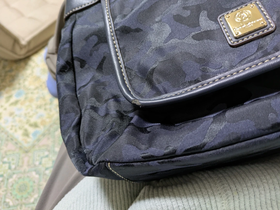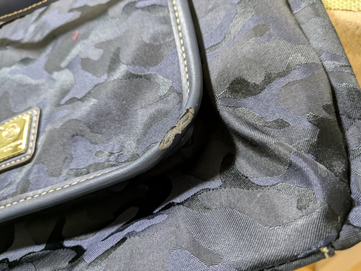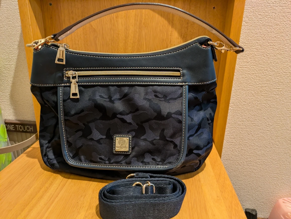 ダコタのハンドバッグです。 ・ブランド:ダコタ ・カラー:ネイビー系のカモフラージュ柄 ・素材:ナイロン、レザー ・内側にポケットあり ・ショルダーベルト付き ・角にスレあり 中古品であることをご了承ください。