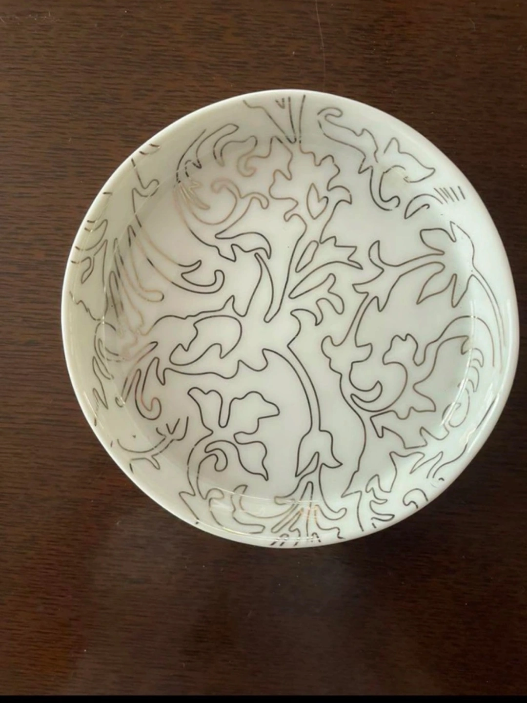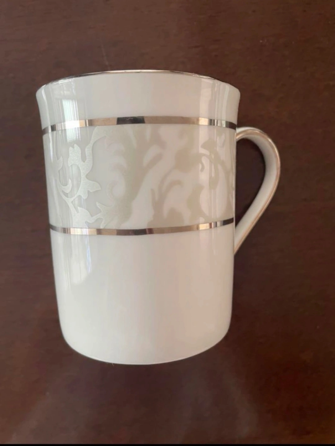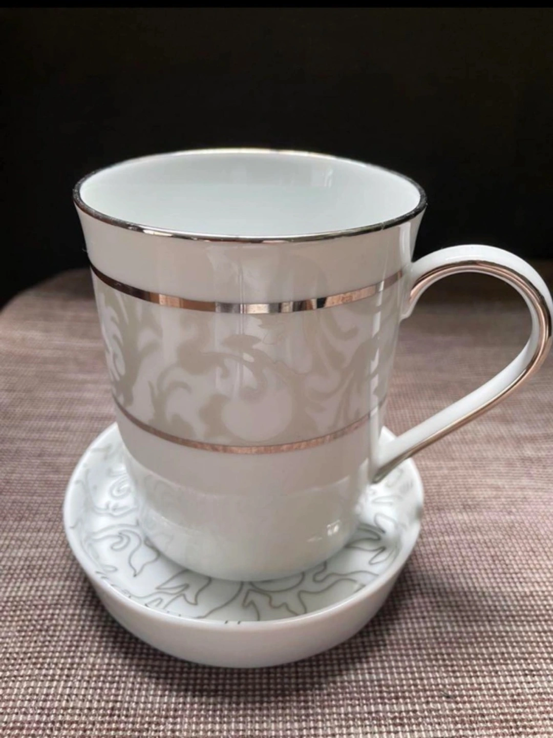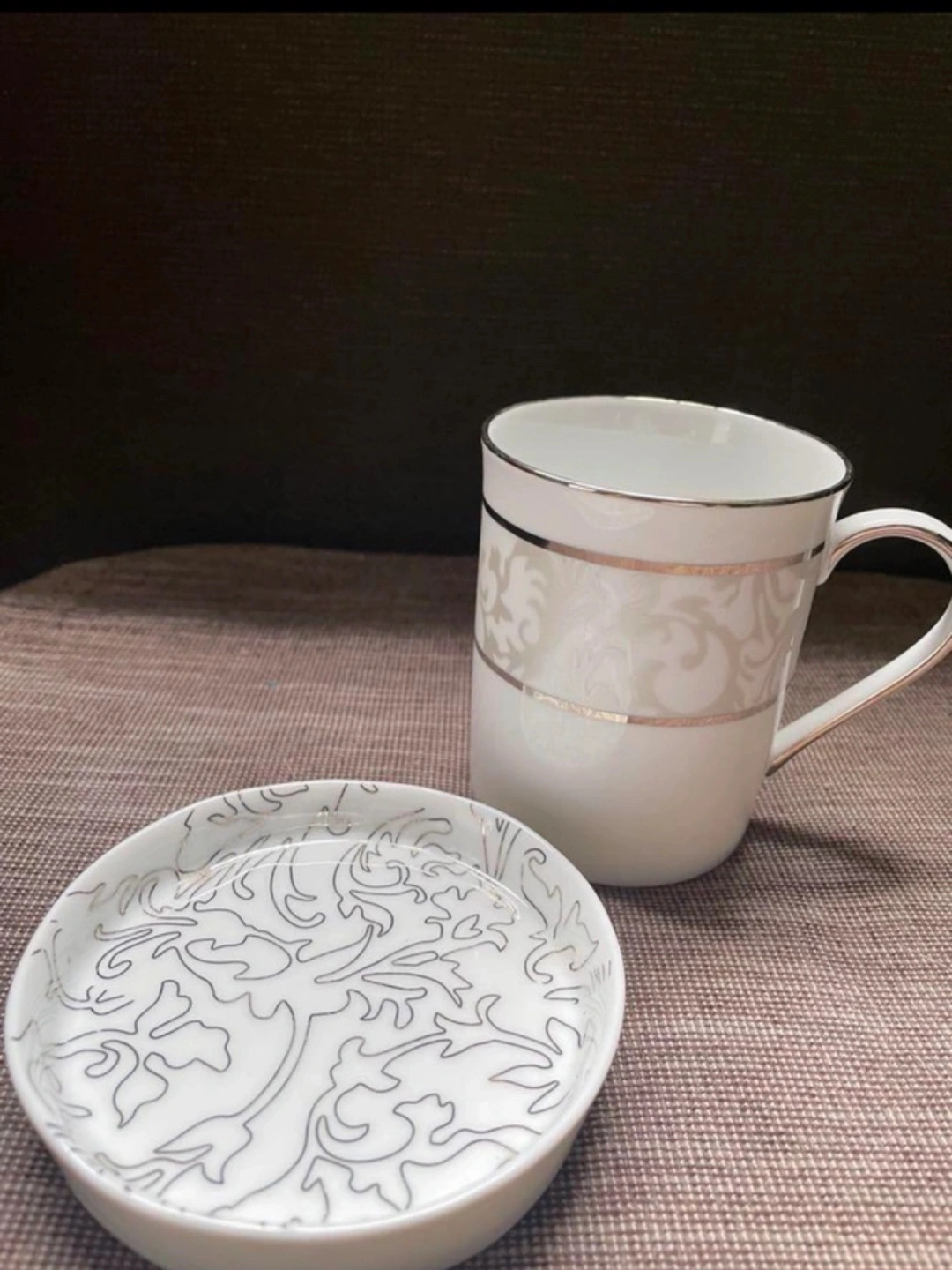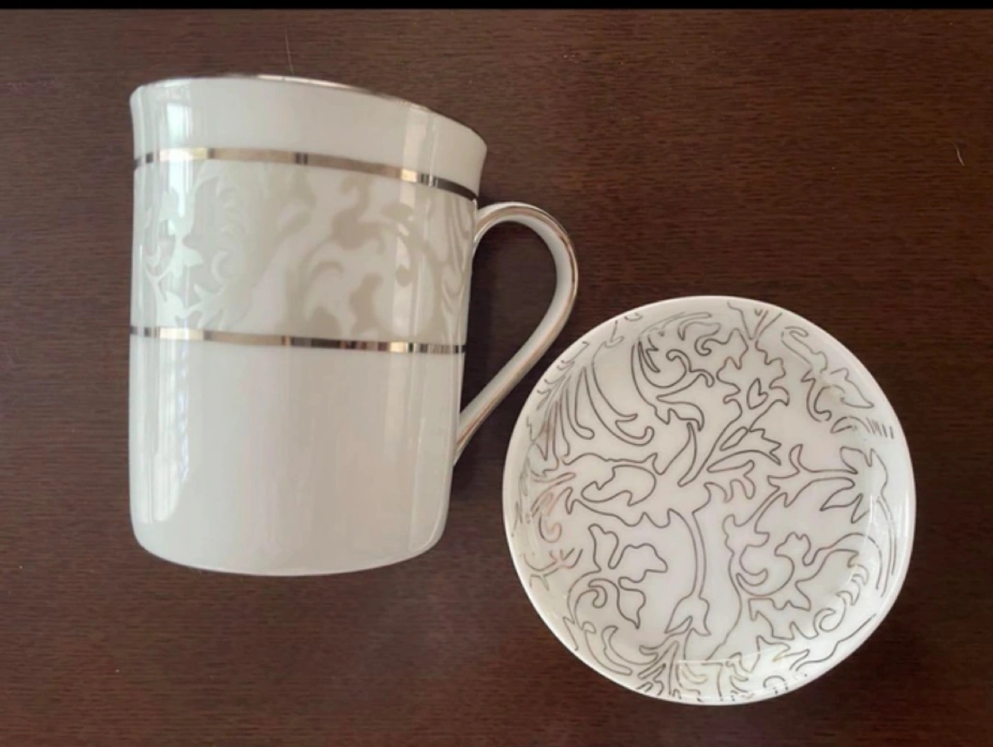 モダンな柄のマグカップとトレイのセット マグカップを小皿に置いてコースターのようにしたり、小皿にはおやつを、マグカップにはコーヒーを入れたり、ティータイムのお供に。 シルバーでカッコいい色合いです。 オフィスにも。 電子レンジ不可 サイズ マグカップ 高さ約9cm 直径約7.5cm 小皿 直径約10cm バラ売り不可 プロフ一読お願いします。 引き渡し場所も、良くご確認ください。 三軒茶屋駅より距離があり、徒歩かバスになります。