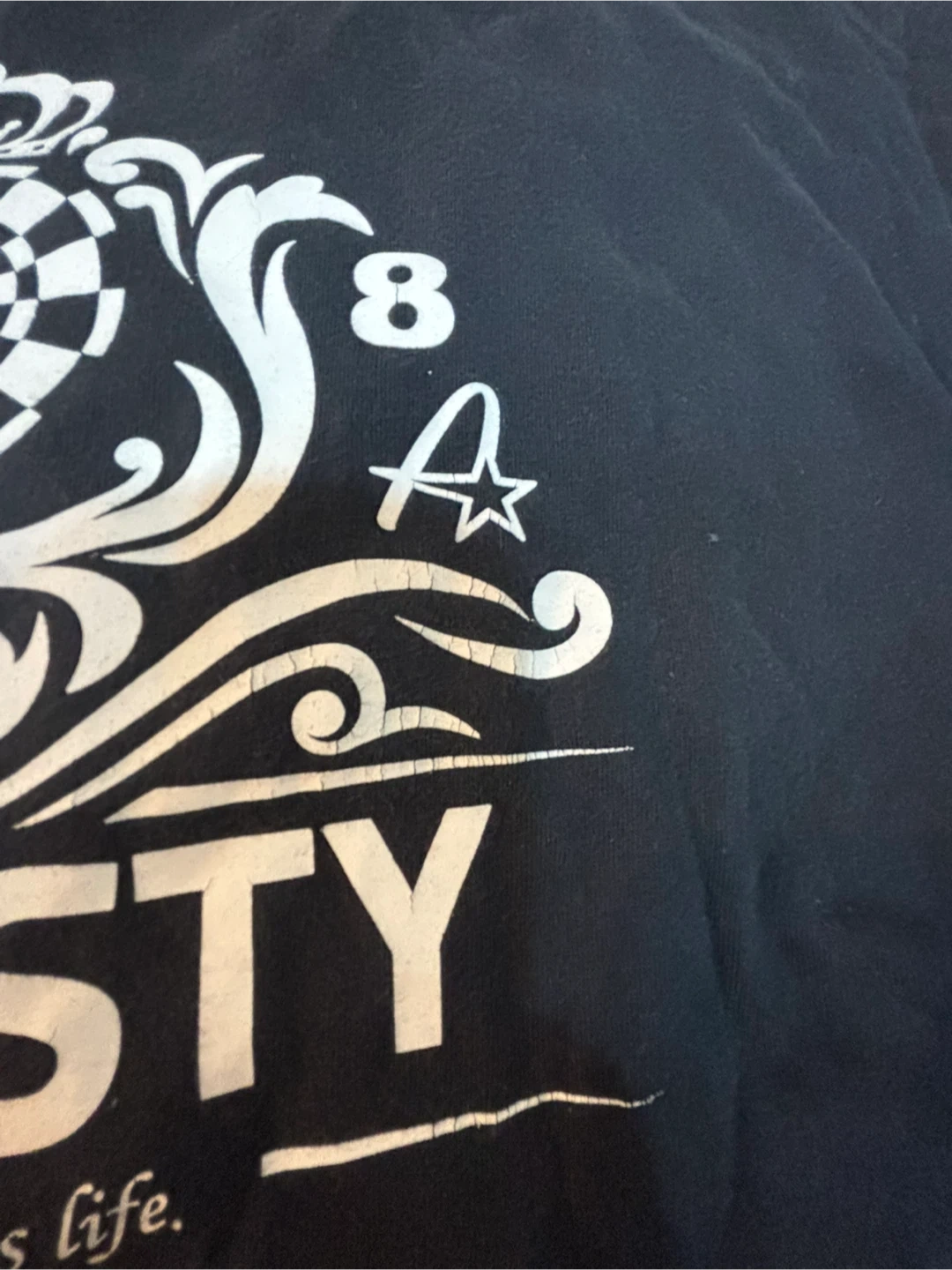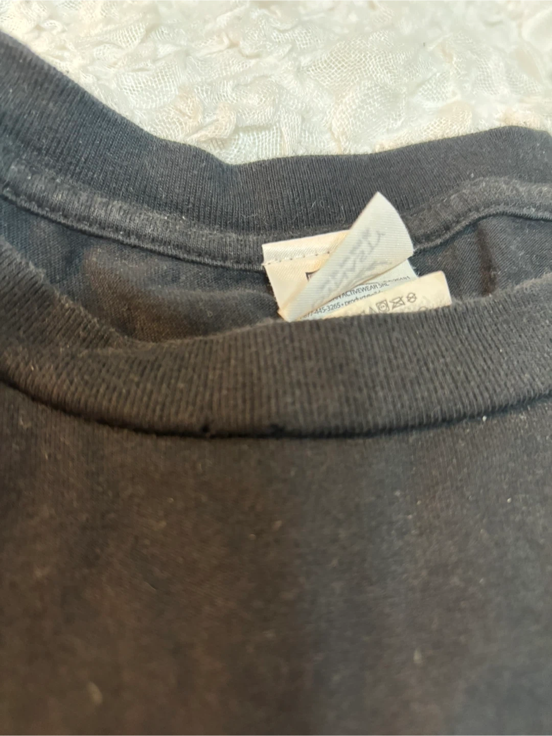 Tシャツ ブラック Lサイズ 襟ぐりに小さな解れ穴が2ヶ所あります(画像あり)。 プリントにひび割れがあります(画像あり)。 色褪せ若干。毛羽立ち若干。首周りのヨレ若干。 ミニトート 開口、底面角、ハンドルの縁などところどころ若干色褪せあり。穴などのダメージなし。 一般的な古着です。神経質なかたはご遠慮下さい。