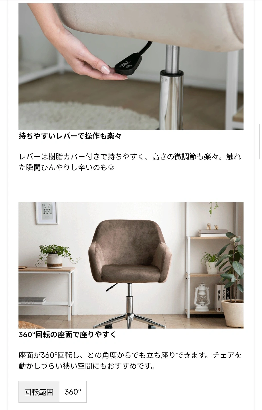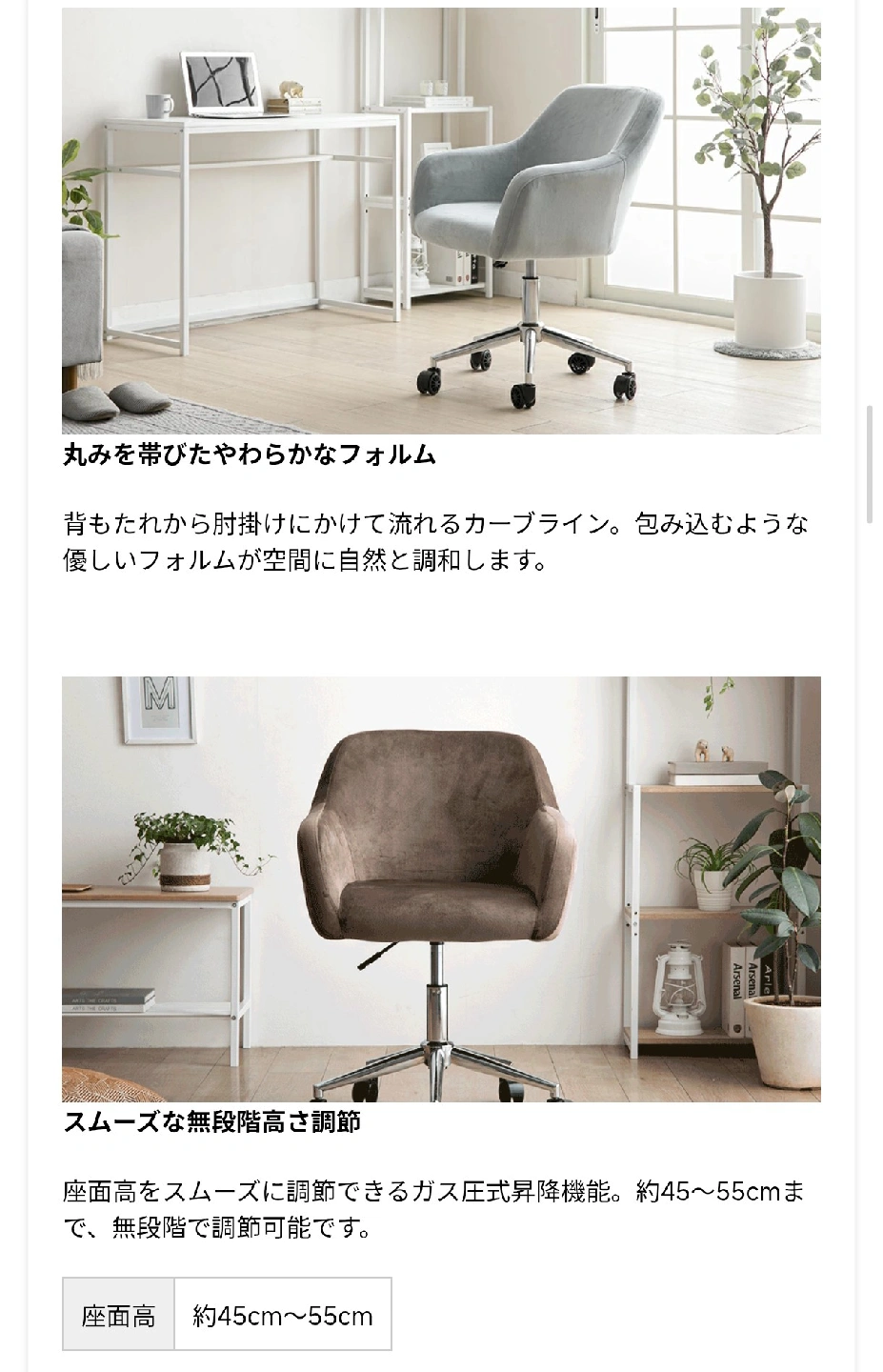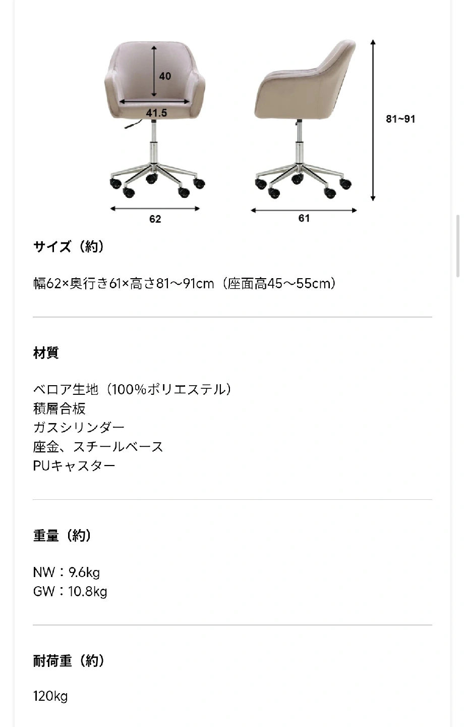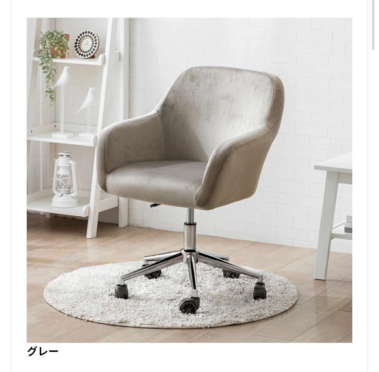 チェアです 現地付近まで引き取り限定で売却したいです。 宜しくお願い致します。 【情報】 サイズ:幅62×奥行き61×高さ81〜91cm(座面高45〜55cm) 素材:ベロア生地(100%ポリエステル)、積層合板、ガスシリンダー、座金、スチールベース、PUキャスター 耐荷重:約120kg 【状態】 目立つキズなし 中古品であることご了承ください