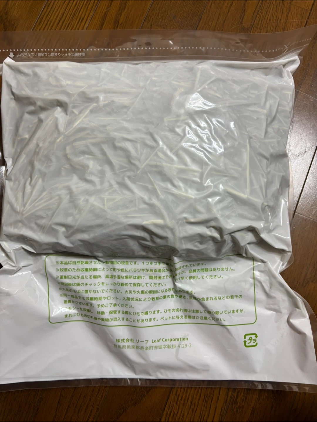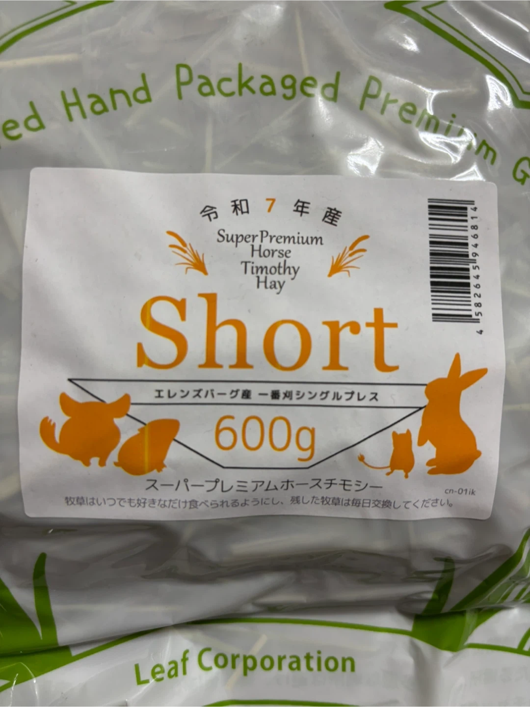 小動物用チモシーです。 ・ブランド:リーフ ・商品名:スーパープレミアムホースチモシー Short ・内容量:600g 1ヶ月前に購入し、自宅で保管していました。 ご自宅近くまでお届けすることも可能です。