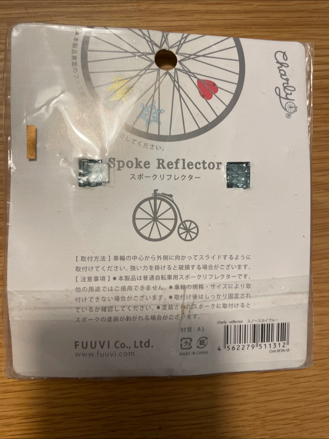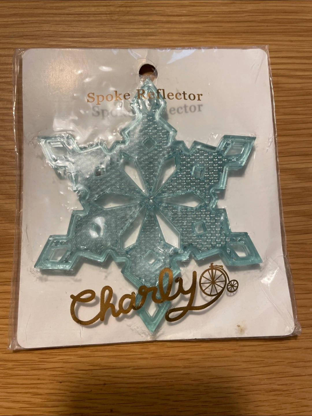 チャーリーのスポークリフレクターです 自転車のスポークにつけて使用 暗い夜道で車のライトに当たった時に光るので安全対策にも ・デザイン:雪の結晶 ・カラー:水色 ・状態:未使用   未使用ですが外袋に汚れあります ご不明点があればお気軽にご連絡ください 三軒茶屋2キロ程度であれば&日時合えばご自宅付近にもお届け可能です