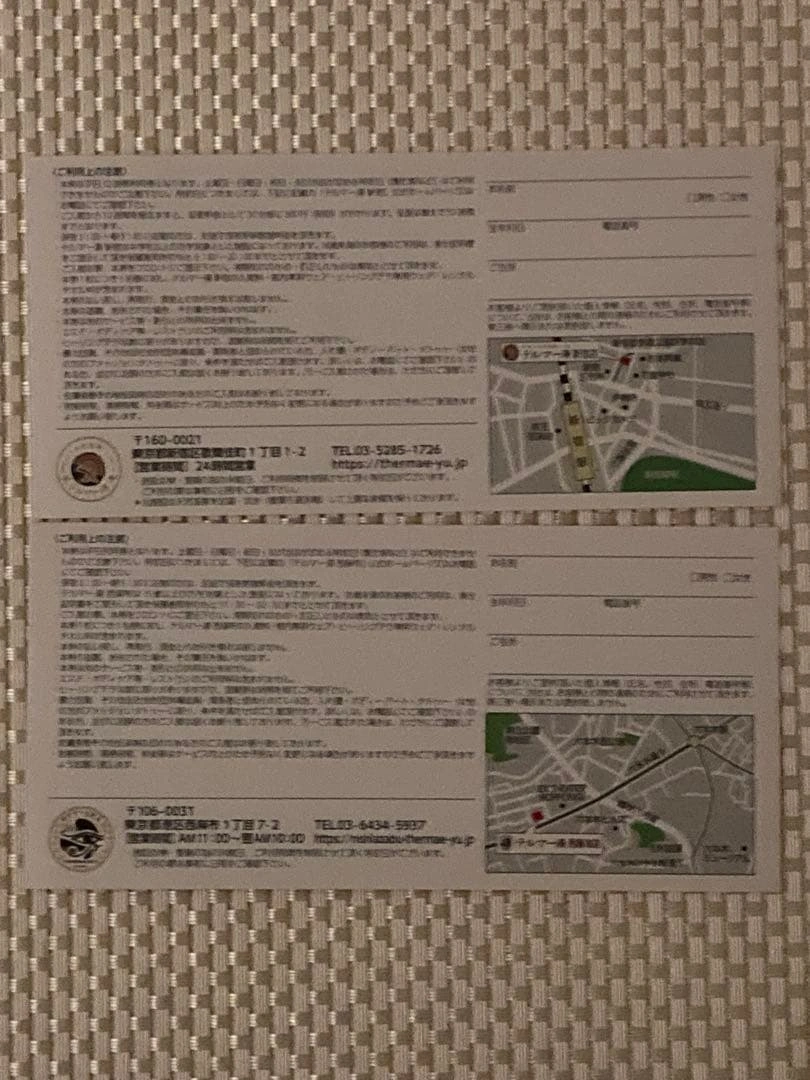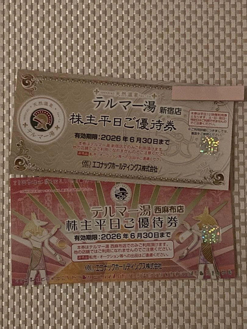 テルマー湯 西麻布 新宿 平日 各1枚 エコナック 株主優待券 2026.6.30期限 出品者は使用したことがありません。 詳細は公式サイトや画像裏面、店舗などでご確認ください。 新宿店のみ希望の場合は2690円、麻布店のみ希望の場合は2200円可能です。 ご希望の方はお気軽にご連絡ください。