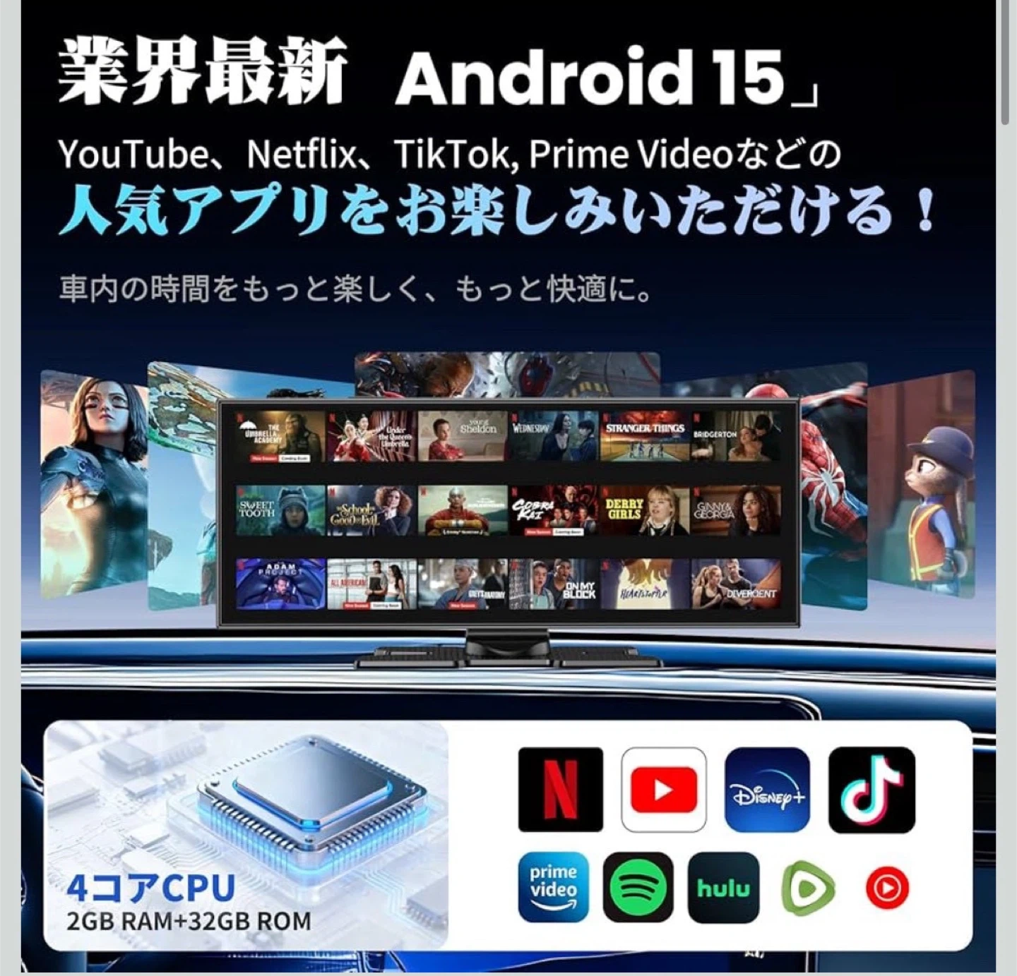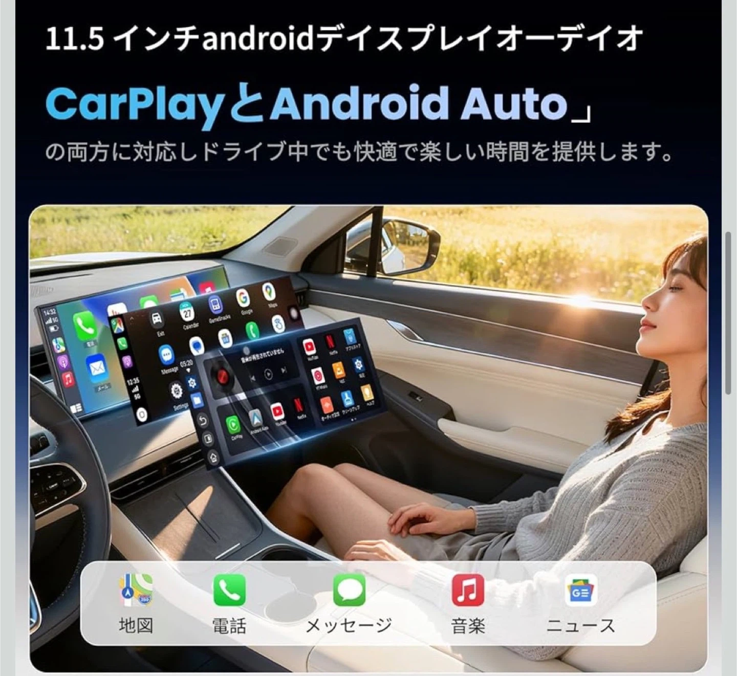 数ある中からご覧頂きありがとうございます(^○^) ◎値下げ交渉◎ ◎コメントなし、即購入大歓迎 ◎送料無料!安心の匿名配送 *。*。 \1品限り!!早い者勝ち!!/ ★商品説明★ 【11.5インチ超ワイド・大画面化 Androidディスプレイオーディオ登場!】 11.5インチの超ワイド大画面を搭載し、ドライブ体験を劇的に向上させます。高精細1920×720のワイドHD液晶ディスプレイは、鮮やかな色彩とクリアな映像を提供し、カーナ動画視聴、音楽再生をより快適にします。広視野角のIPSパネルにより、どの角度からでも見やすい。 【最新のAndroid 15システム内蔵・動画視聴可能】4コアCPU・2GB RAM・32GBストレージを備えた高性能Android搭載ポータブルディスプレイオーディオです。最新のAndroid 15のAndroidシステムを搭載しており、スマホのテザリングや車載Wi-Fiと連携することで、YouTubeやNetflix、Prime Videoなどのアプリをシームレスに利用できます。 【ワイヤレスApple CarPlay/Android Auto】 ドライブをよりシームレスで快適な体験に。ワイヤレスApple CarPlayとAndroid Autoに対応しており、スマートフォンとの接続が簡単に行えます。Bluetooth、AUX、FMトランスミッターなど、さまざまな接続オプションを提供し、あなたの車内環境にぴったりと調和します。 【便利かつ効率化の2画面表示】 タブレットのように2つのアプリを並べて同時に操作できる優れた機能を備えています。お気に入りの動画を視聴しながら、友人や家族とメッセージのやり取りをしたり、天気予報をチェックしたり、カレンダーの予定を確認したりと、さまざまな使い方が可能です。これにより、車内での時間をより効率的に活用できます。ただし、一部のアプリは2画面表示に対応していない場合があります。 【ミラーリンクとオーディオ出力】 ミラー投影をサポートし、カーシアターの雰囲気を実現します。 内蔵スピーカーは、立体的でリアルなダブルDINステレオ体験を提供します。 4つのオーディオ出力、スピーカー、Carplay/auto、FM、AUXから選択できます。