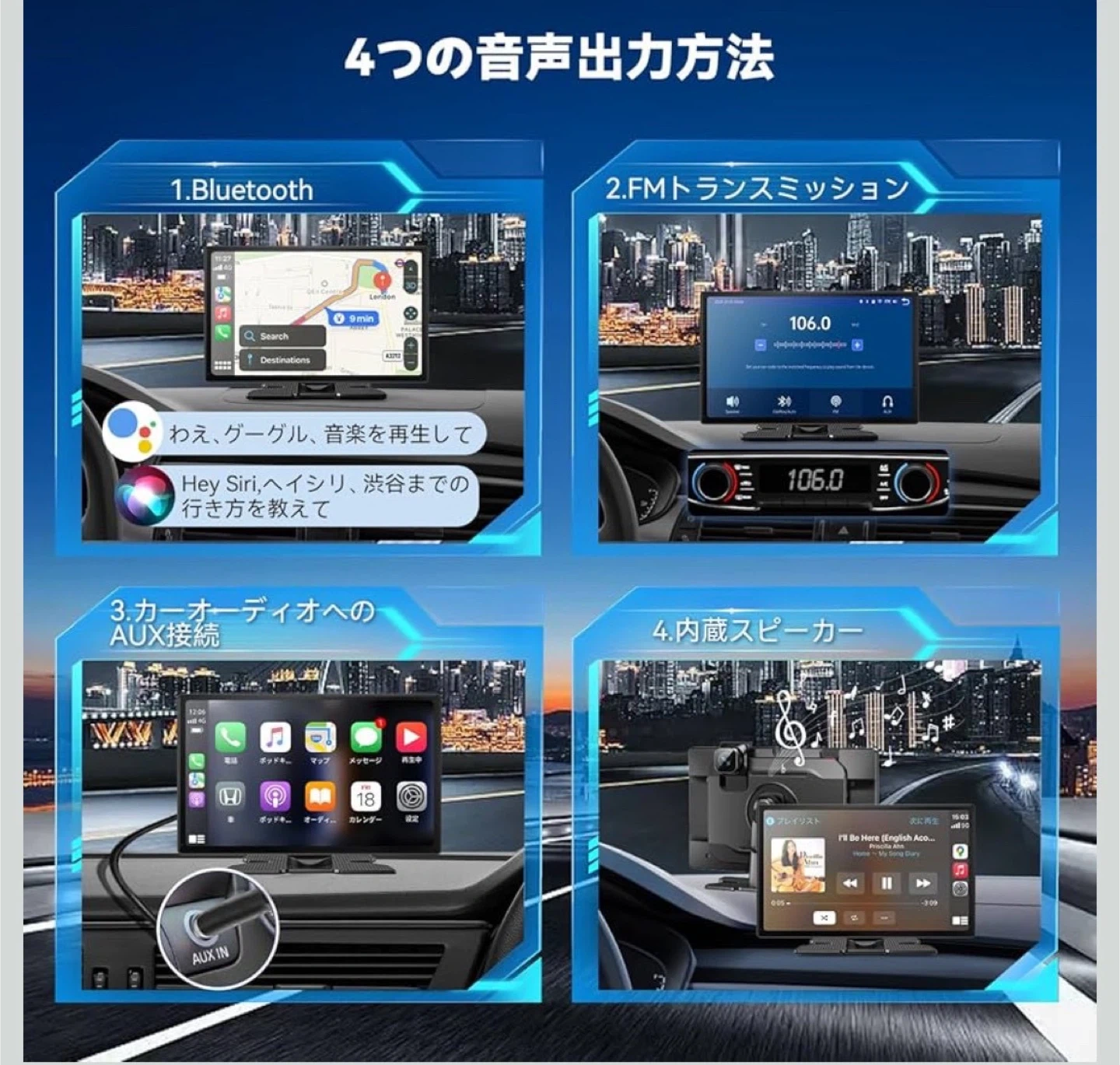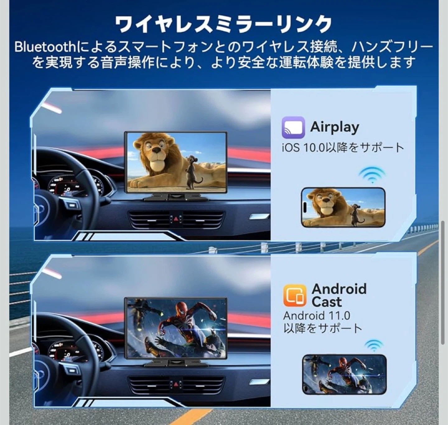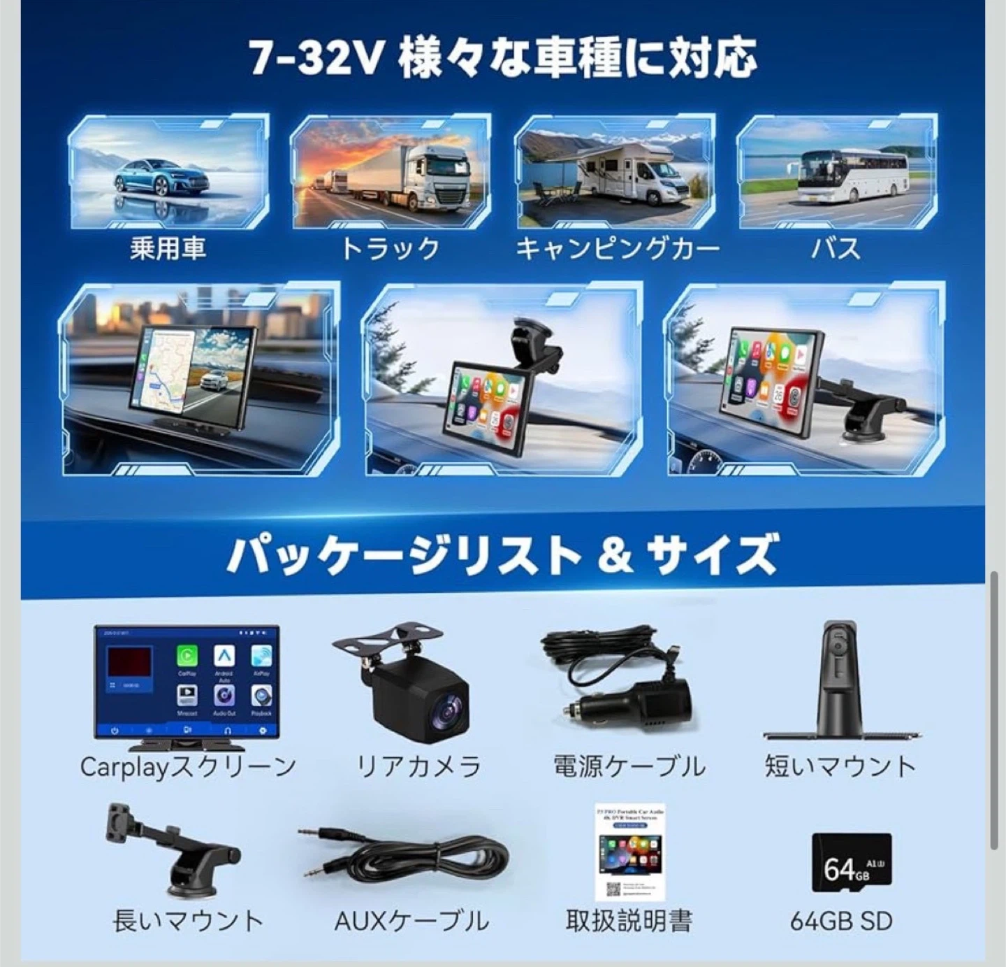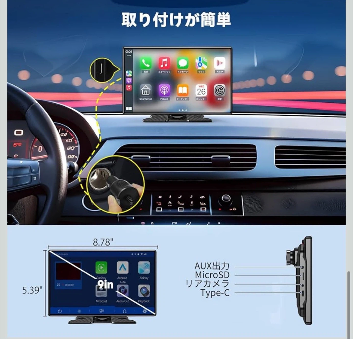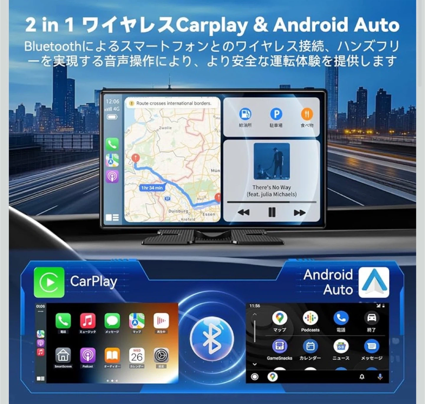 数ある中からご覧頂きありがとうございます(^○^) ◎✨️値下げ交渉◎✨️ ◎コメントなし、即購入大歓迎✧ ◎送料無料!安心の匿名配送 *。┈┈┈┈┈┈┈┈┈┈┈┈┈┈┈*。 ✨️\1品限り!!早い者勝ち!!/✨ ★商品説明★ 【ワイヤレス操作で便利】このポータブルカーナビゲーションシステムはApple CarPlayとAndroid Autoに対応し、スマートフォンのアプリをワイヤレスで操作可能。音楽再生、ナビゲーション、通話などを高解像度タッチスクリーンで快適に利用できます。運転中でも安全かつ簡単にスマートフォン機能を活用可能です 【取り付け簡単で幅広い互換性】 専門知識不要で簡単に取り付け可能。シガーライターソケットに差し込むだけで使用できます。12-32Vに対応し、ほとんどの車両で使用可能。吸盤式ホルダーやバックモニターカメラなどの付属品も充実しており、駐車時の安全性を向上させます。 【音声コントロールで安全運転】 SiriやGoogle Assistantの音声コマンドを利用し、道案内、通話、メッセージ送受信が可能。運転中に手を使わずに操作でき、安全性を大幅に向上。高精度な音声認識と多言語対応で快適に使用できます。 【高品質オーディオ体験】 Bluetoothオーディオ出力を改善し、CarPlayやAndroid Autoの音声を車のスピーカーで再生可能。AUX接続やFM送信機能、内蔵スピーカーも対応し、多様な音楽ソースに対応可能。音質調整機能付きで、好みのサウンドを楽しめます。 【注意事項】 本製品にはカーナビ機能が内蔵されていません。スマートフォンをBluetoothで接続し、CarPlay や Android Auto を使ってナビ機能をご利用いただく必要があります。(Android 11以上のスマートフォンのみサポートしています。)