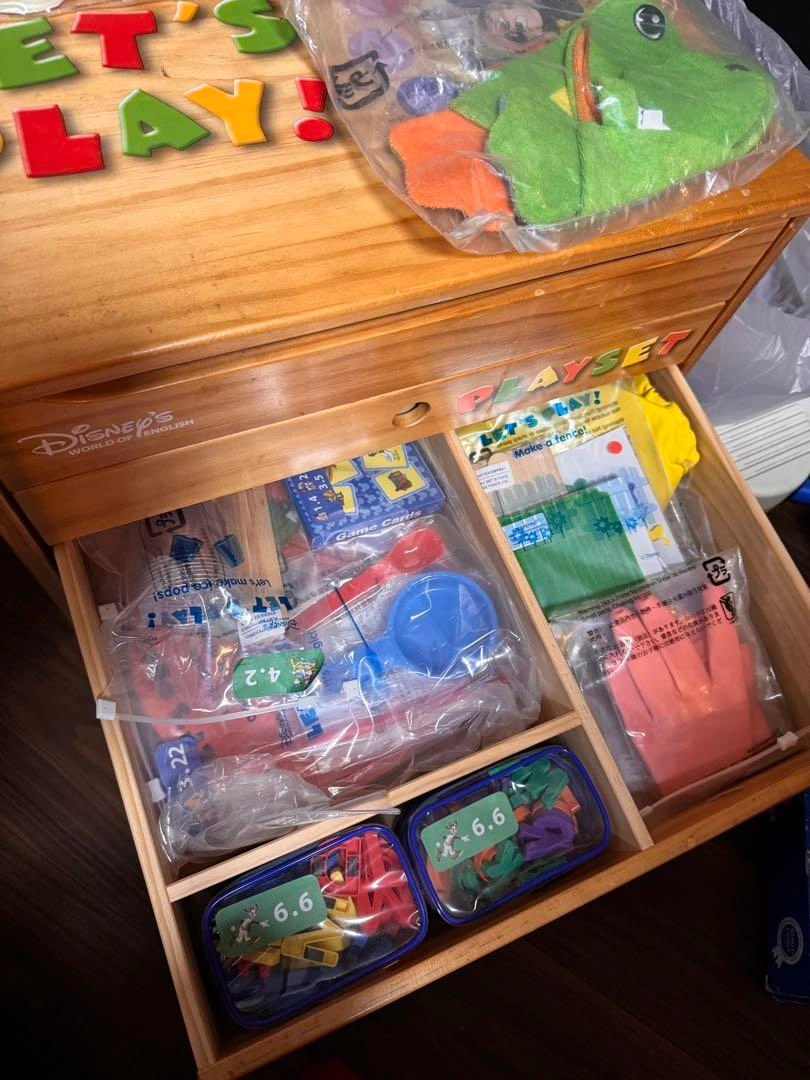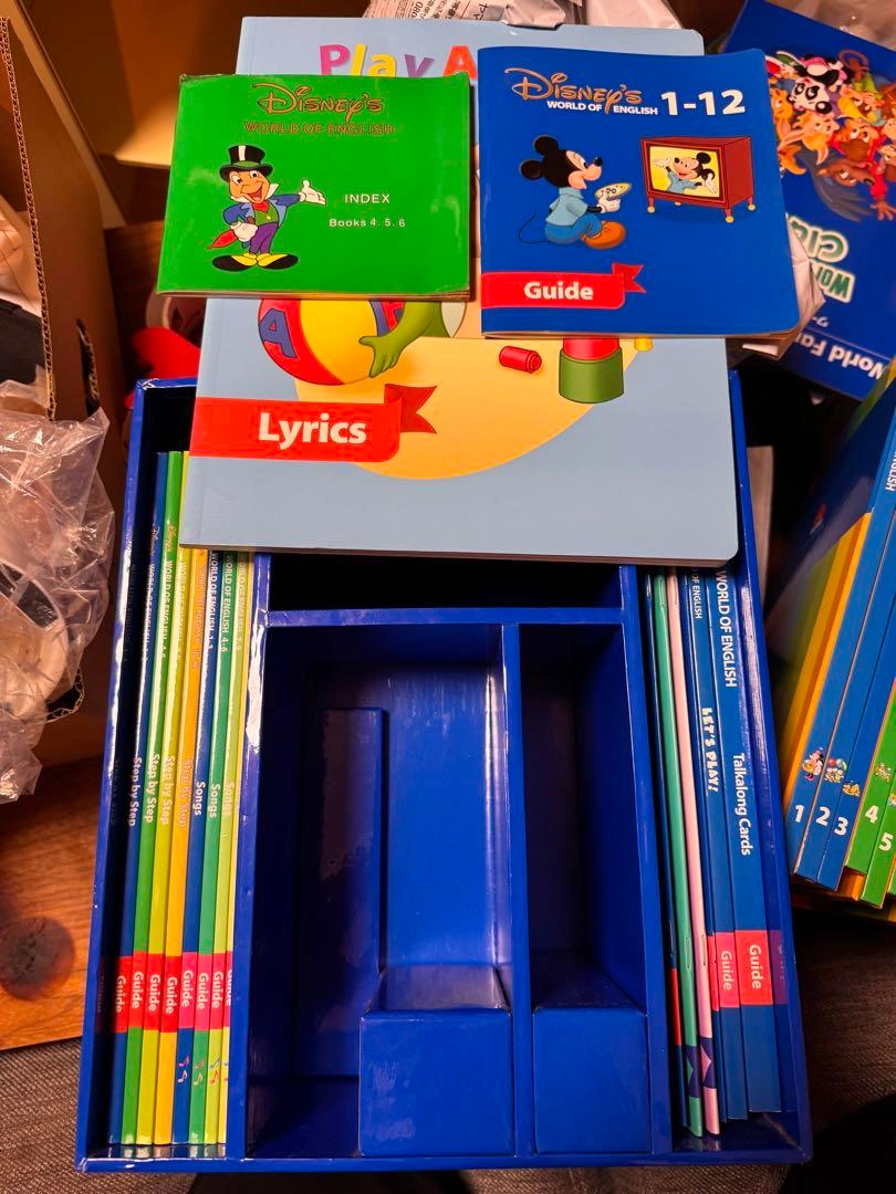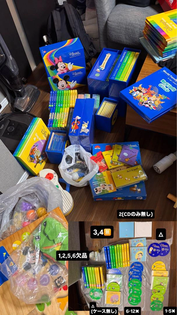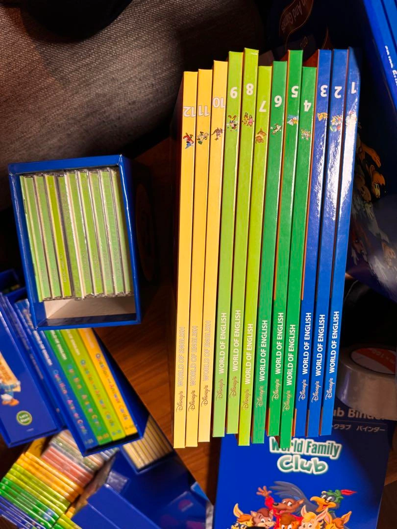 2013年5月に購入されたものです(前オーナーの保証書あり)。 全体的に状態は良く、未開封のものも多数あります。リニューアル前の正規購入品です。 一部CD入れに埃等ある点にご注意ください。 渋谷駅近辺から10キロ範囲でしたら直接配達いたします(送料無し)。ご自宅内に運ぶのをお手伝いいただけると助かります。 範囲外の地域は、追加料金で配送できる場合がありますのでご相談ください。 大きい棚は有り無しどちらでもお値段は変わりません。 5枚目に載っている真ん中の本類が欠品しています。2枚目にも欠品の詳細があります。 マジックペンも欠品しています。 カード類は8割が未開封、CDも一部開封済みですが、大部分は未開封です。 DWE World Family 英語教材 英会話 スクール ネイティブ World of English キャラクター···ディズニー ご希望の方はお気軽にご連絡ください。