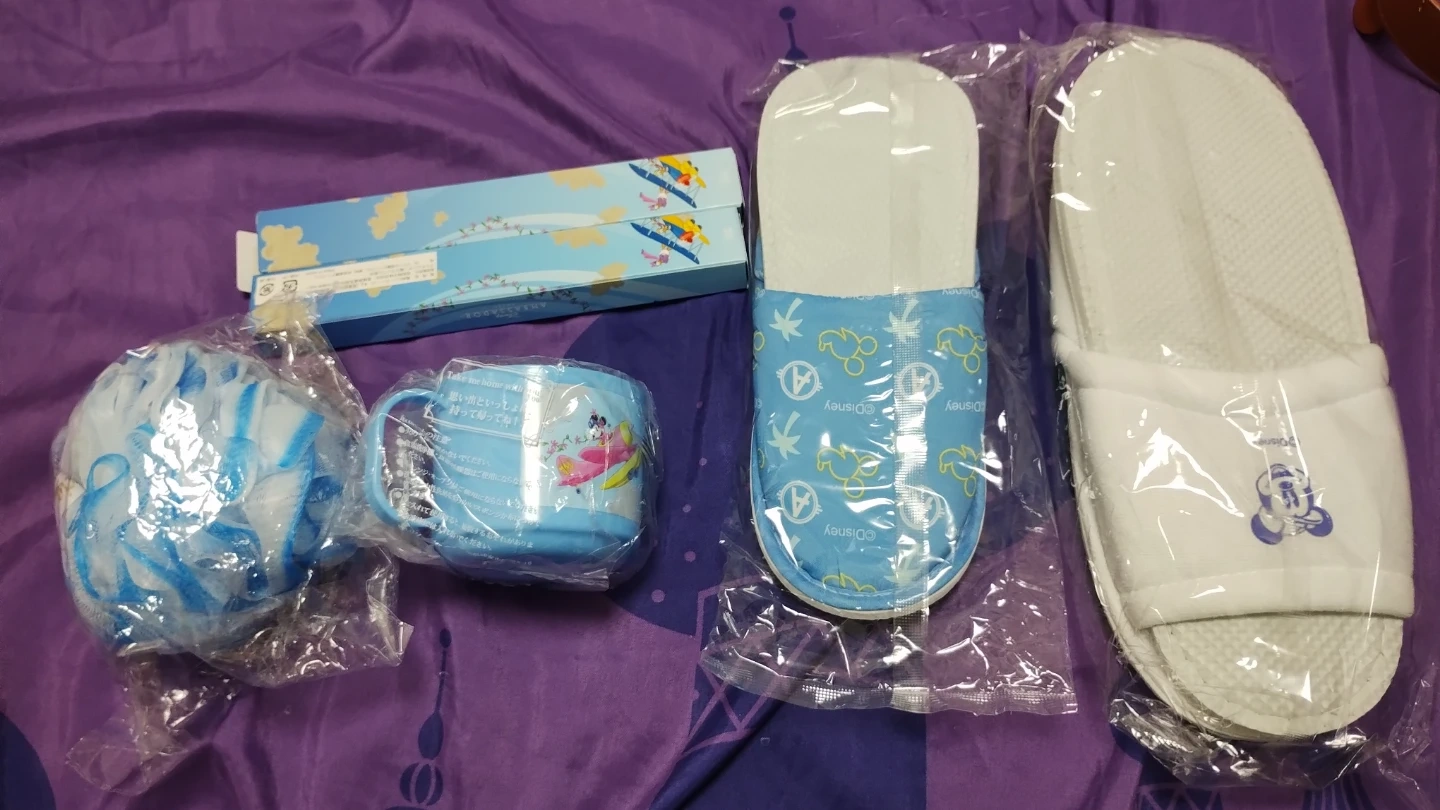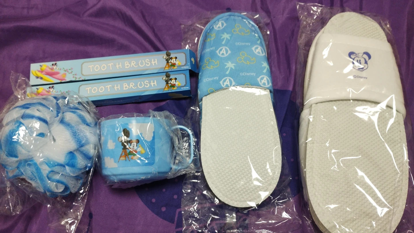 ディズニーのアメニティセットです。 ・ミッキー歯ブラシ2本 ・ミッキーミニー柄のプラコップ ・ボディスポンジ ・スリッパ2足(青色子供用、白色大人用) ・全て未使用品 すべてまとめてお譲り致します🙇