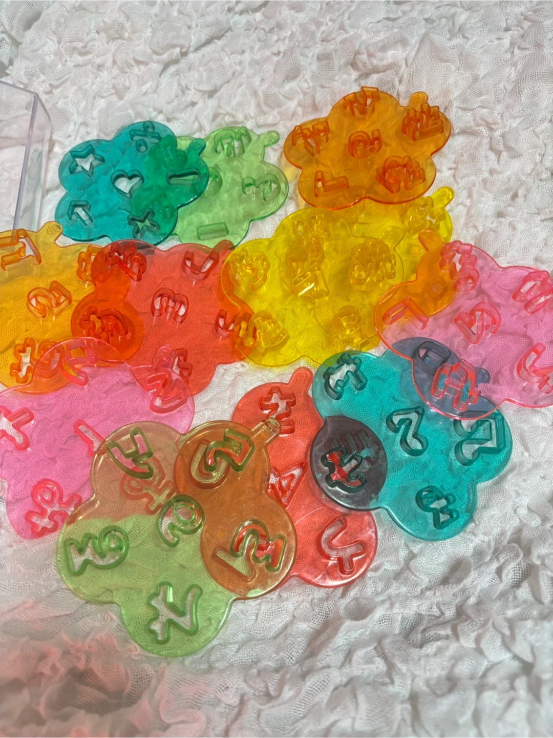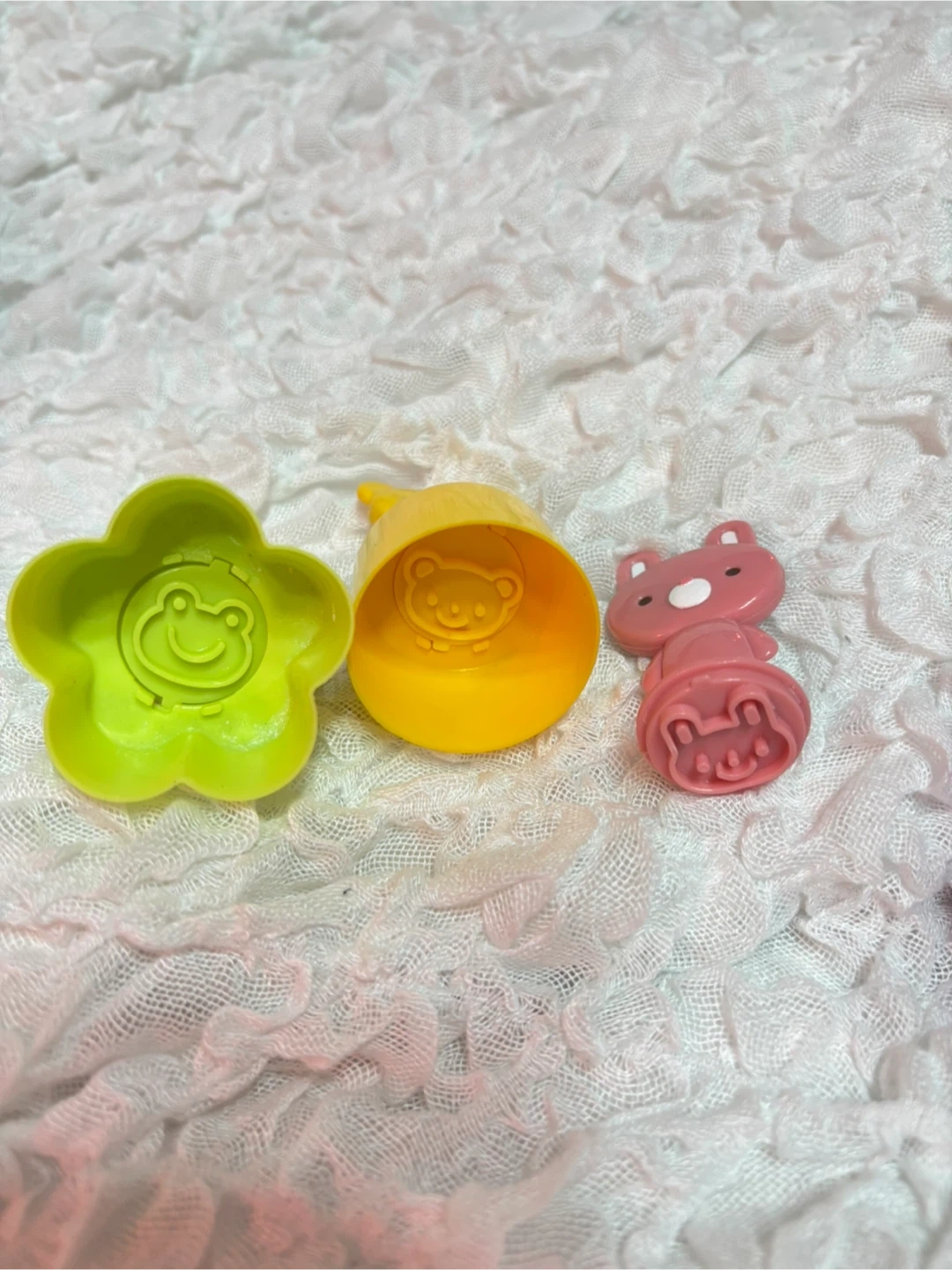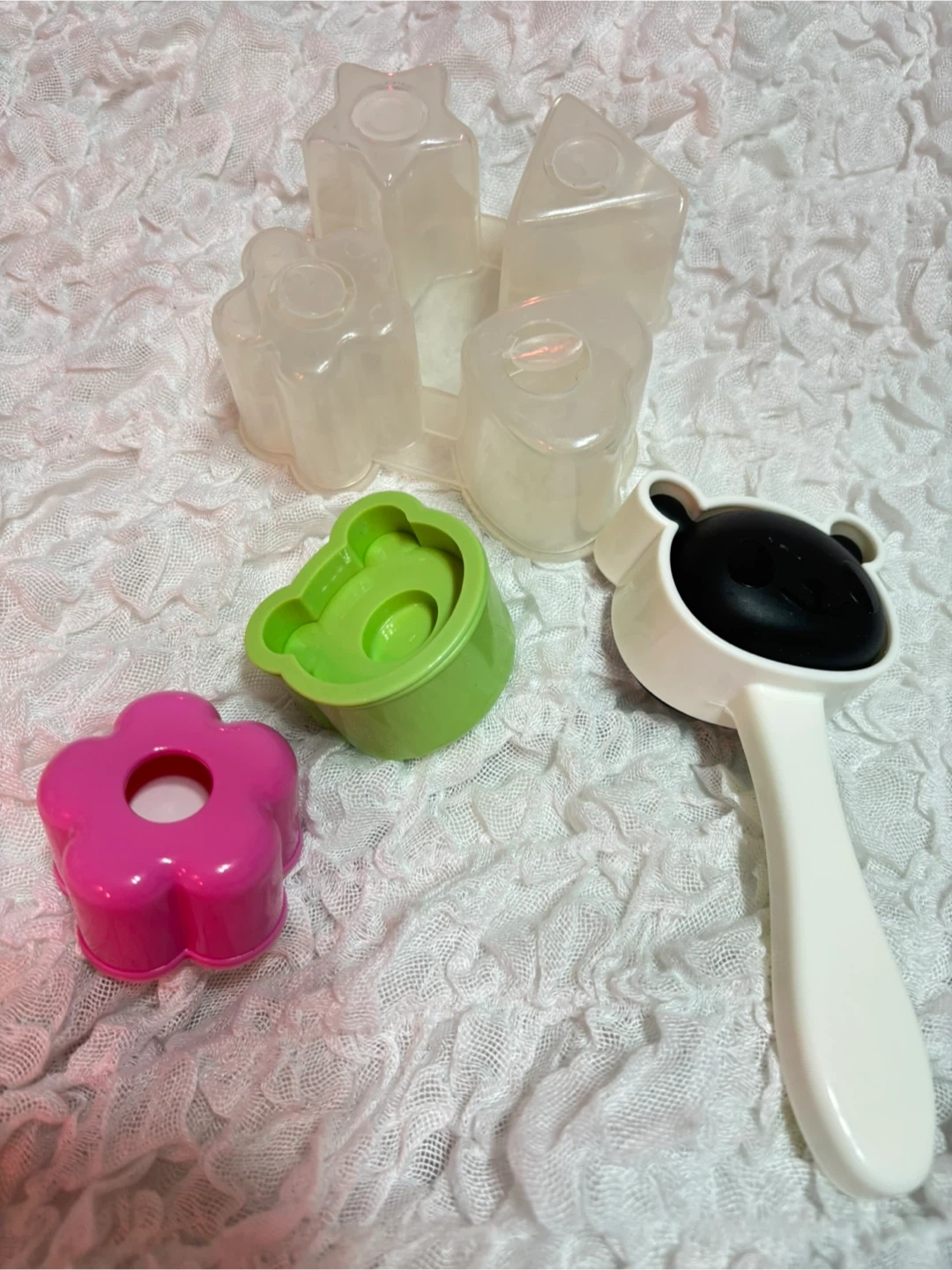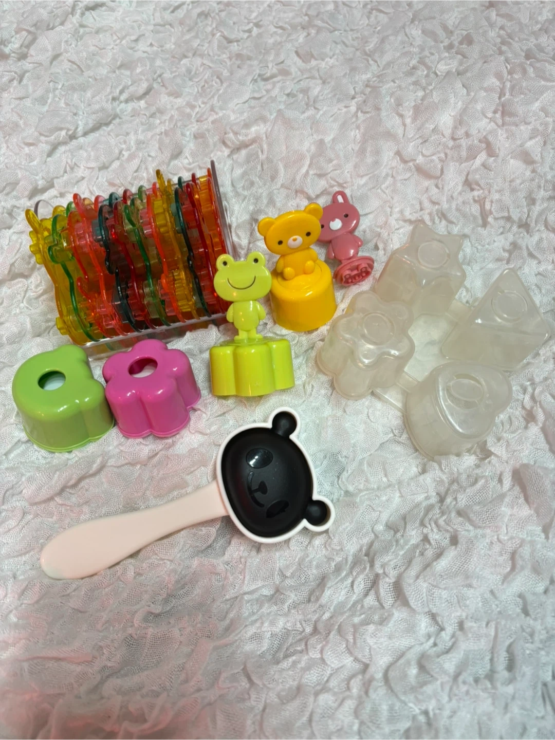 平仮名、数字、モチーフなどの型抜きプレー ト12枚組 (スライスチーズや薄切りハム、クッキー作り等に使えます) ミニサンドイッチ用型抜きスタンプ3種(ウサギだけスタンプのみ) スタンプはトースト前に使います。 おにぎり型4つ クマ(パンダ)、花、星、ハート、三角 お弁当作り卒業で必要なくなりました。 お弁当とお菓子作りにしか使用しませんでしたが、粘土工作、砂場遊びなどで使えると思いますよ。 個人宅で使用、保管していた中古品であることをご了承下さい。 神経質なかたはご遠慮下さい。