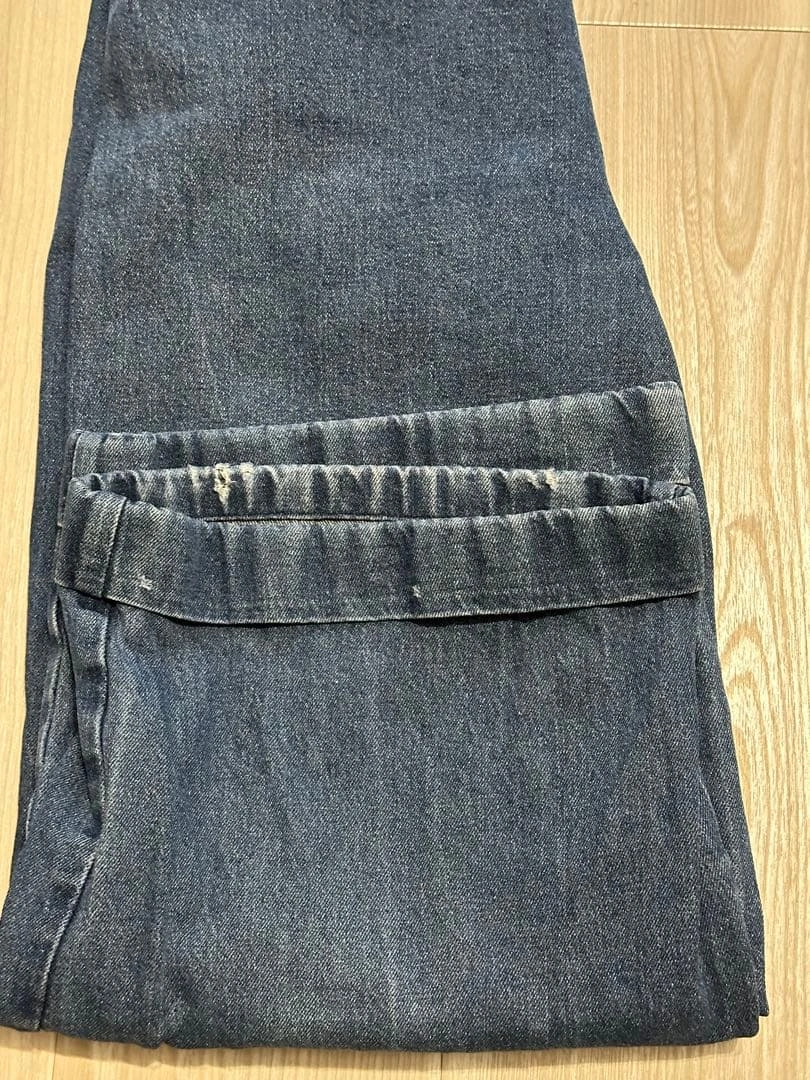 ややワイドなデニムです。 裾野あたりはややダメージがあります。 綿 …100% 丈 …約83cm 股上…約31cm ウエスト周り…約68cm 素人採寸ですので、ご容赦ください。 何度か着用し、クローゼットにしまっていました。 色落ちはもうしないと思います。 中古品のため、ご理解いただける方のみご検討をお願い致します。