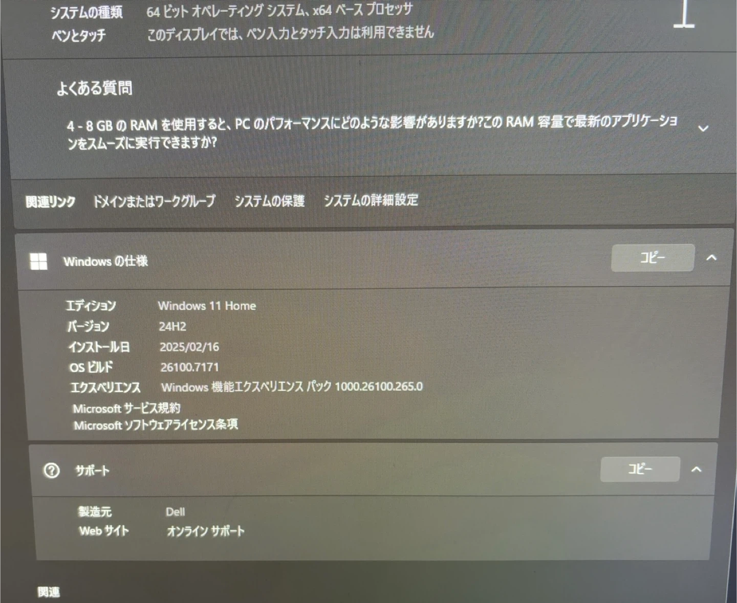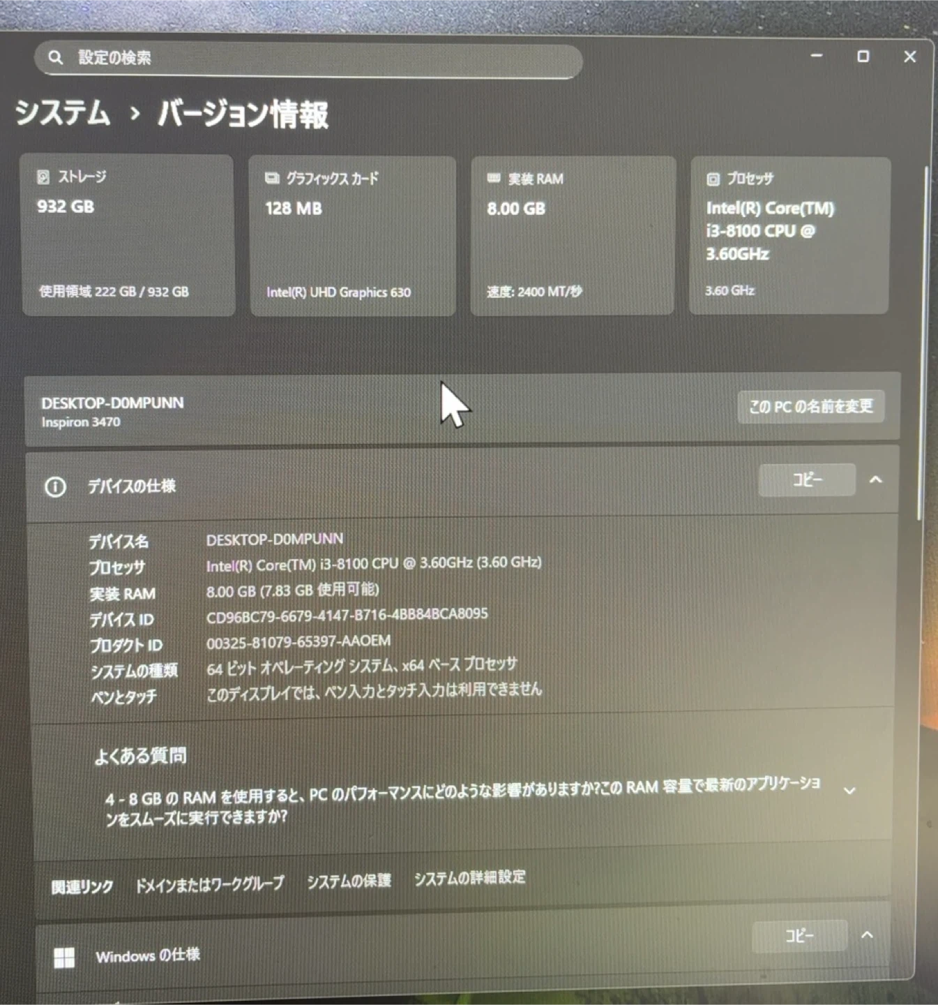 デルのデスクトップPCです。 メモリを4→8に増設してます 正面は保護フィルム貼ったままです(画像参照) 外観は目立つ傷無し、落札まで使いますので動作確認済み、取りに来て欲しいです 【情報】 ブランド:デル 商品名:Inspiron 3470 CPU:Intel Core i3 8100 メモリ:8GB ストレージ:932GB OS:Windows 11 Home ドライブ:DVD RWドライブ 中古品であることをご了承ください。