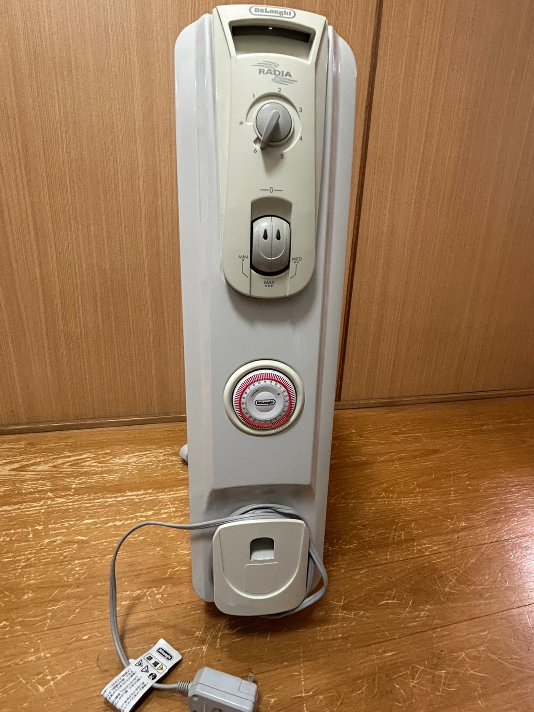 デロンギのオイルヒーターです。 ・メーカー:デロンギ ・状態:使用感あり (カバー付き) ・型番 : R731015EFS このモデルは、L字型フラットフィンを10枚備えています。 適用畳数は4~10畳で、消費電力は最大1500Wです。 24時間ON/OFFタイマーと転倒時自動電源遮断装置が搭載されています。 空気を汚さず、音も静かなため、小さなお子様やペットがいる家庭に適しています 子供が産まれた時に知人から譲り受け自宅保管してましたが使わなかったので使っていただける方にお譲りしたいと思います。 説明書は無いです。ダウンロードしてご確認お願いします。 中古品であることをご了承ください。