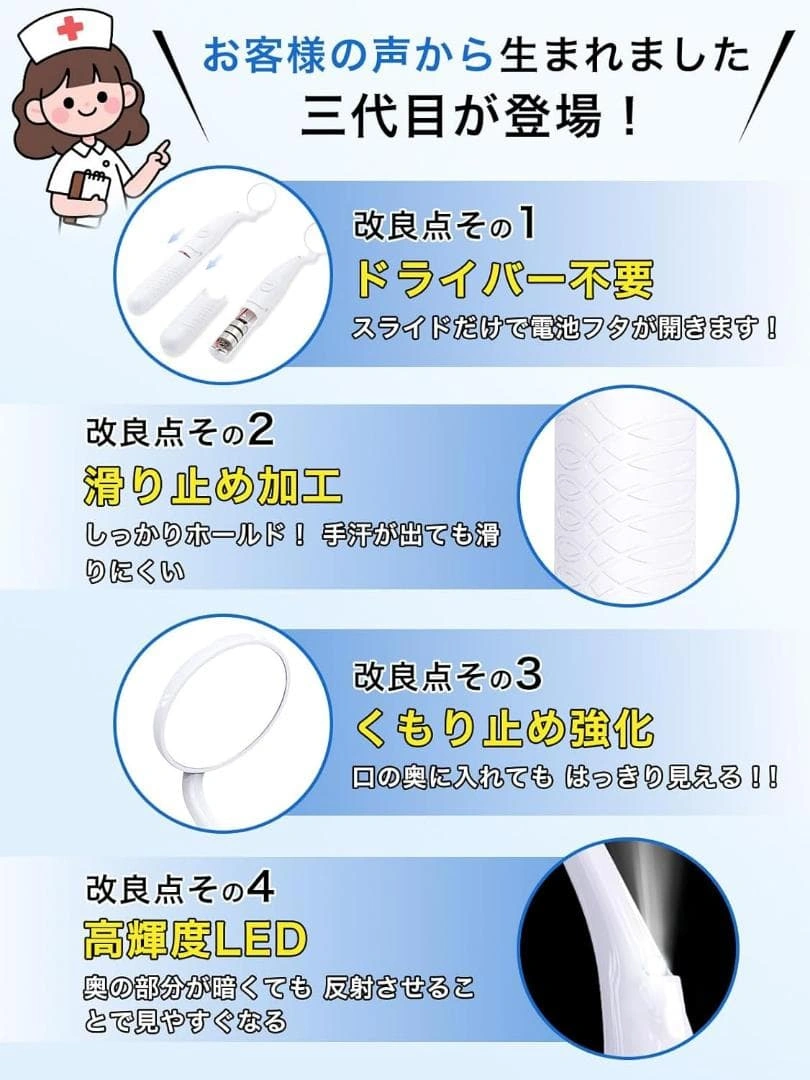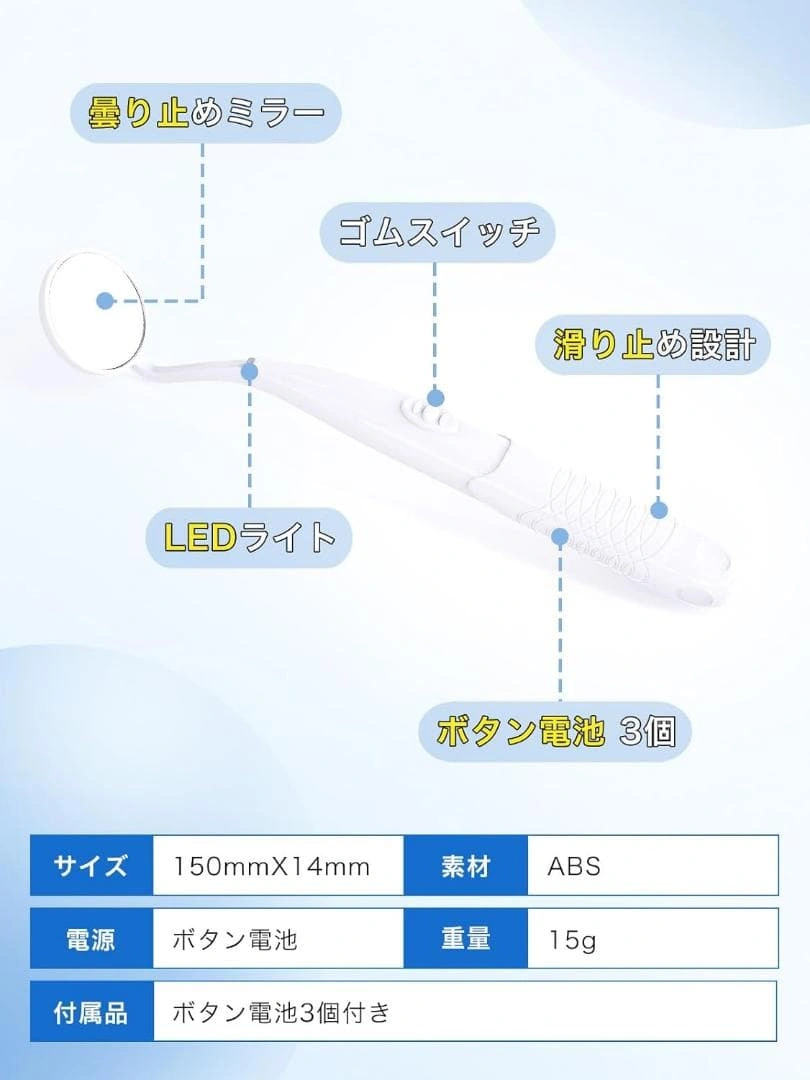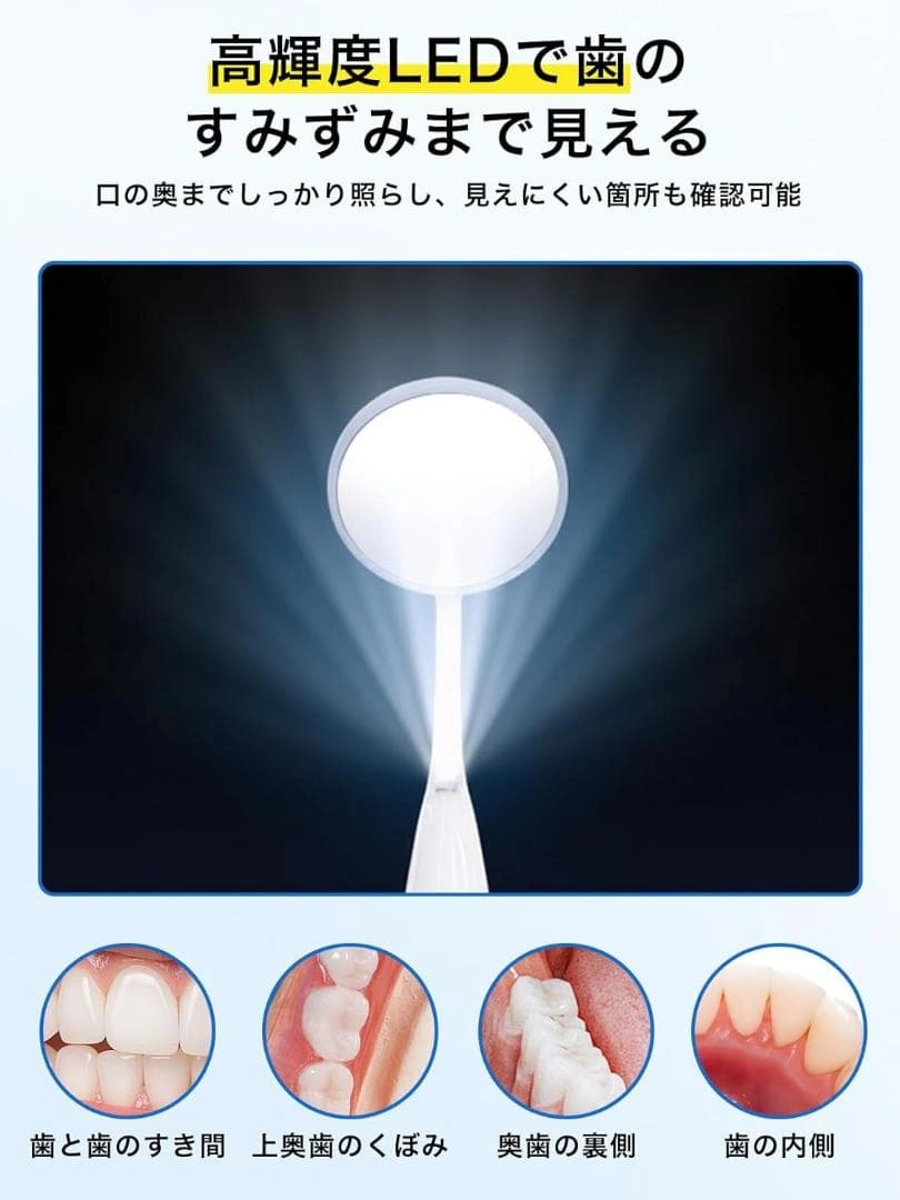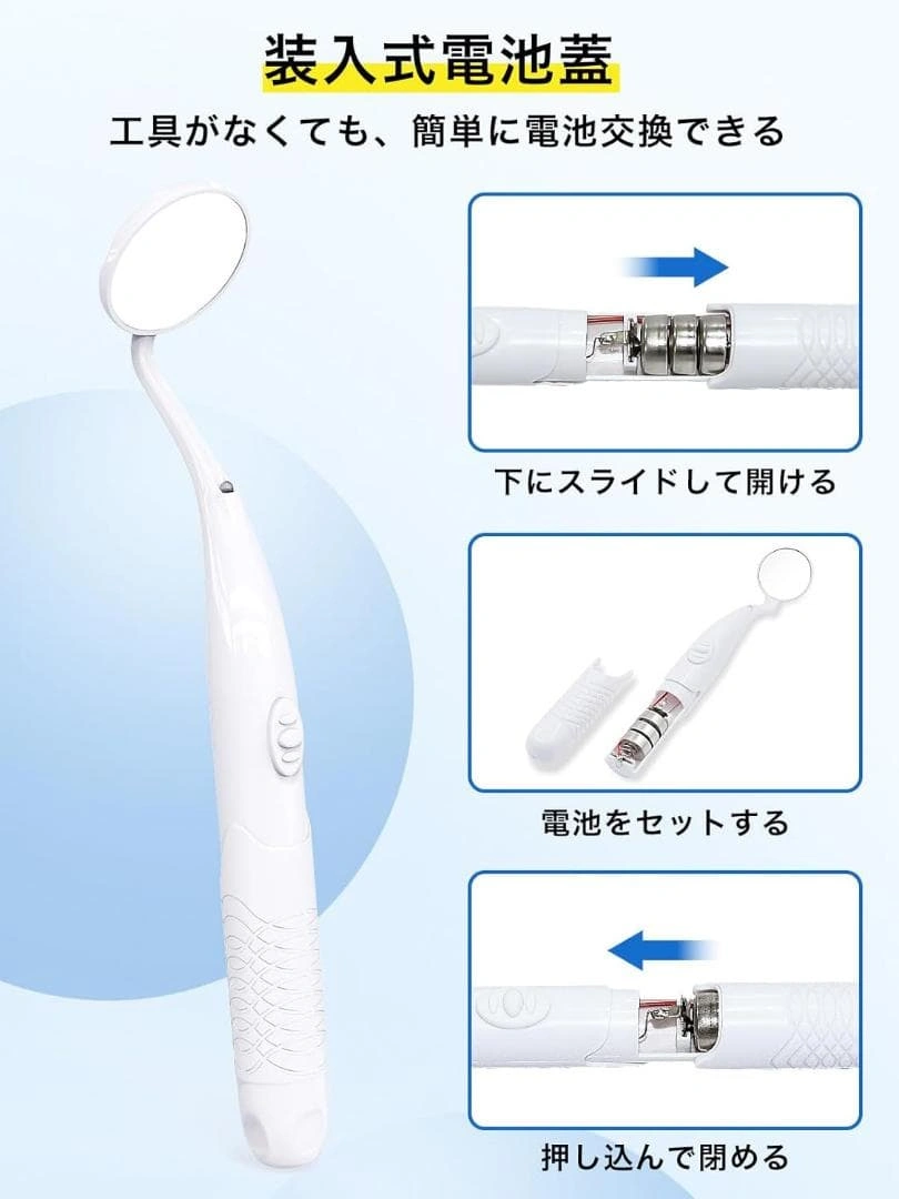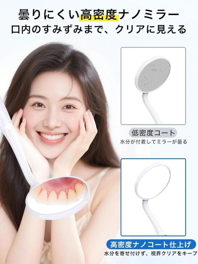 あたたかさLEDライト付きのデンタルミラーです。 奥歯や歯の裏側まで明るく照らし、歯垢や歯石の確認をサポートします。 ミラー表面には曇り止めナノコーティングが施されています。 滑り止め加工、電池交換も簡単に行えます。 ご使用前には鏡面の保護フィルムを剥がしてください。お手入れの際は、レンズ部分のみを軽く水ですすぎ、LEDライトやそれより上の部分には水がかからないようご注意ください。 ご希望の方はお気軽にご連絡ください。