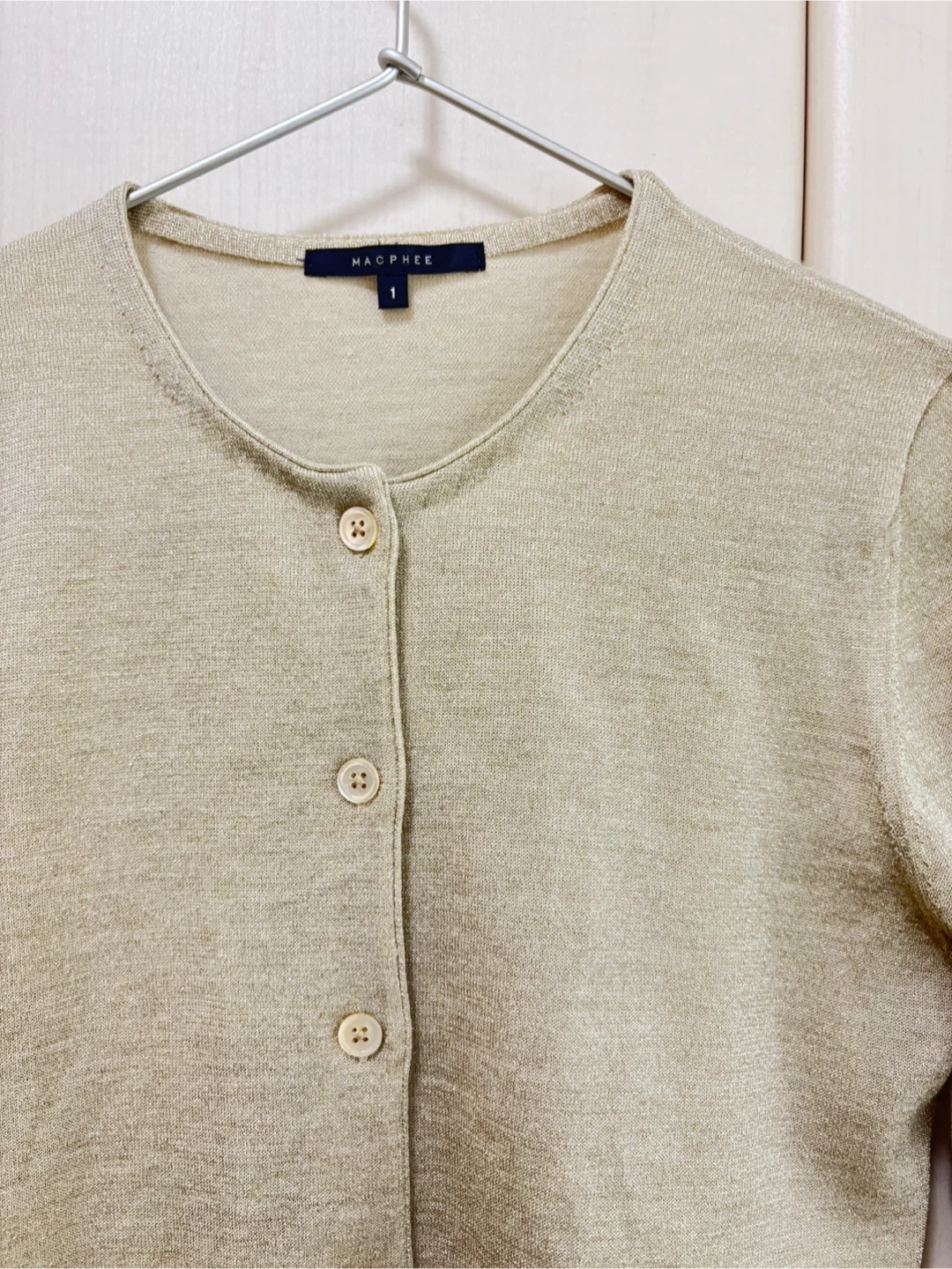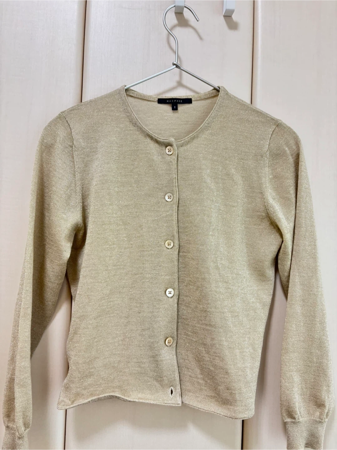 トゥモローランドウィメンズのオリジナルブランド〈MACPHEE(マカフィー)〉 のページュカーディガン ワンピにも便利、ラメ入りで、パーティなどにも使えそうです。 もちろんオフィスにも。 合わせやすいゴールドベージュです。 ・ブランド:マカフィー ・カラー:ゴールドベージュ ・サイズ:1 (Sサイズ、36サイズくらい) ・素材:ウール、ナイロン、アクリル ・状態:使用感少なめ、全体的にきれい✨ ・定価だと1万円以上 某大手フリマだと5千円弱で違うサイズがあるようです ウール入りで、春先まで使えそうです(^^) ご不明点があればお気軽にご連絡ください
