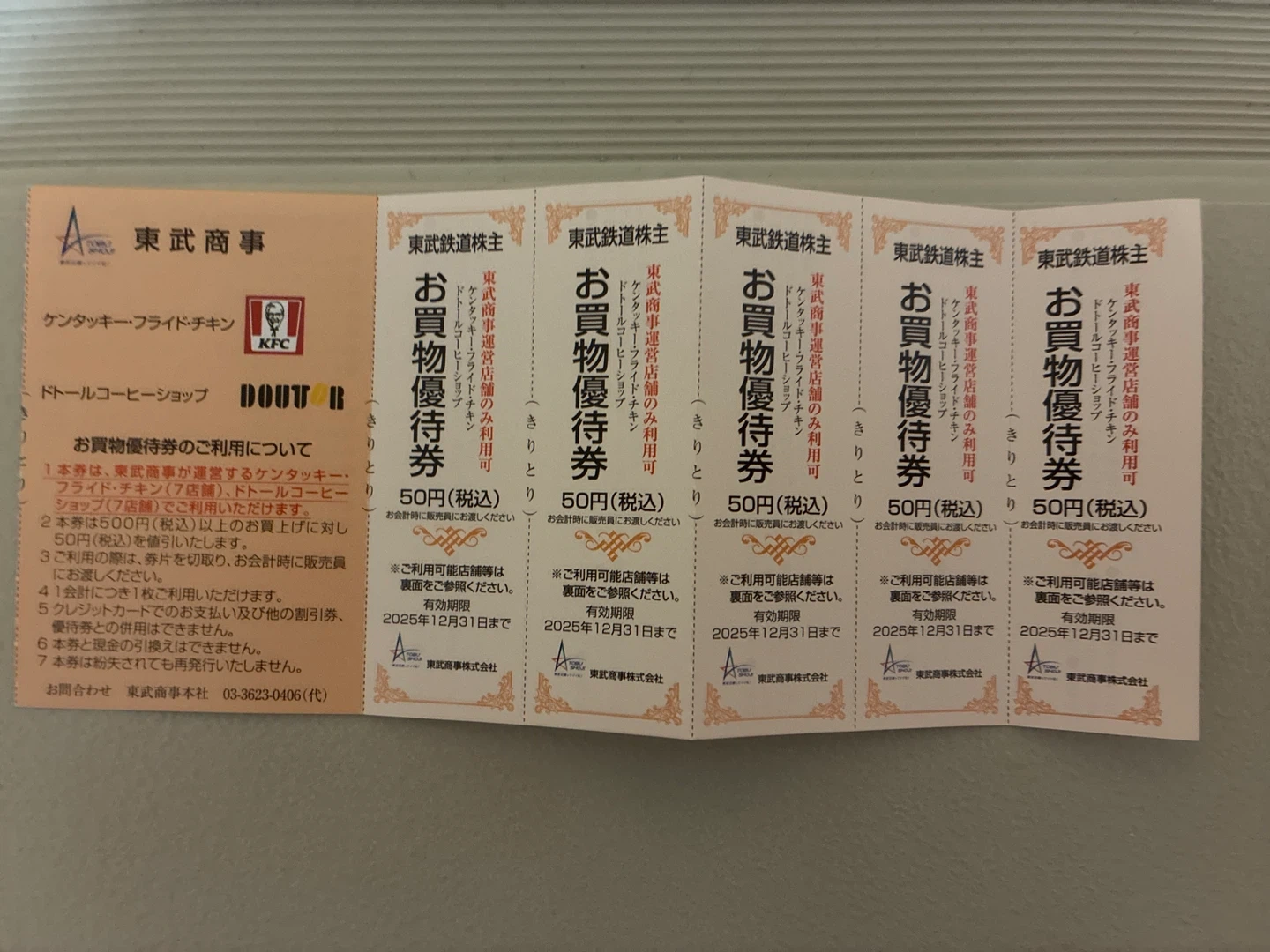 東武商事のお買物優待券です ・50円券 ・有効期限:2025年12月31日まで ・東武商事運営店舗(ケンタッキーフライドチキン、ドトールコーヒーショップ)のみ利用可 中古品であることご了承ください