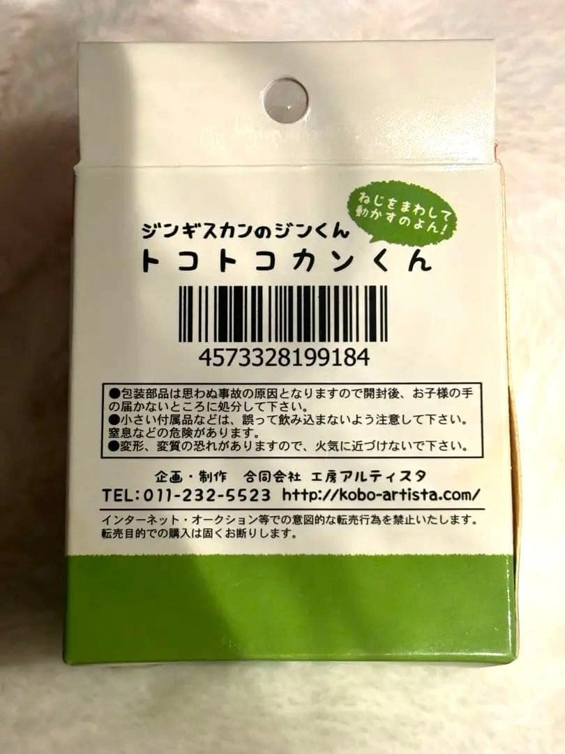 ジンギスカンのジンくんの、ねじ巻きでトコトコ歩くカンくんのおもちゃです。 頂き物で、当時一度だけ出したあとすぐに箱にしまって暗所にしまっておきました。 5年以上前のもののため箱の前面のプラ板が箱と離れていたりといった劣化はありますが、おもちゃ自体は劣化なく美品かと思います。 レトロおもちゃ、北海道土産。 ぬいぐるみ、ポップアップストア ご希望の方はお気軽にご連絡ください。