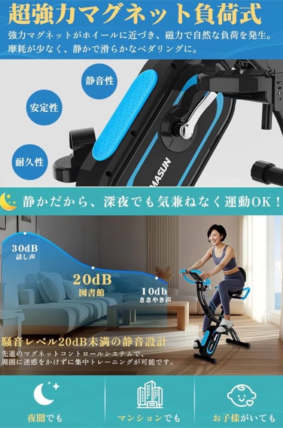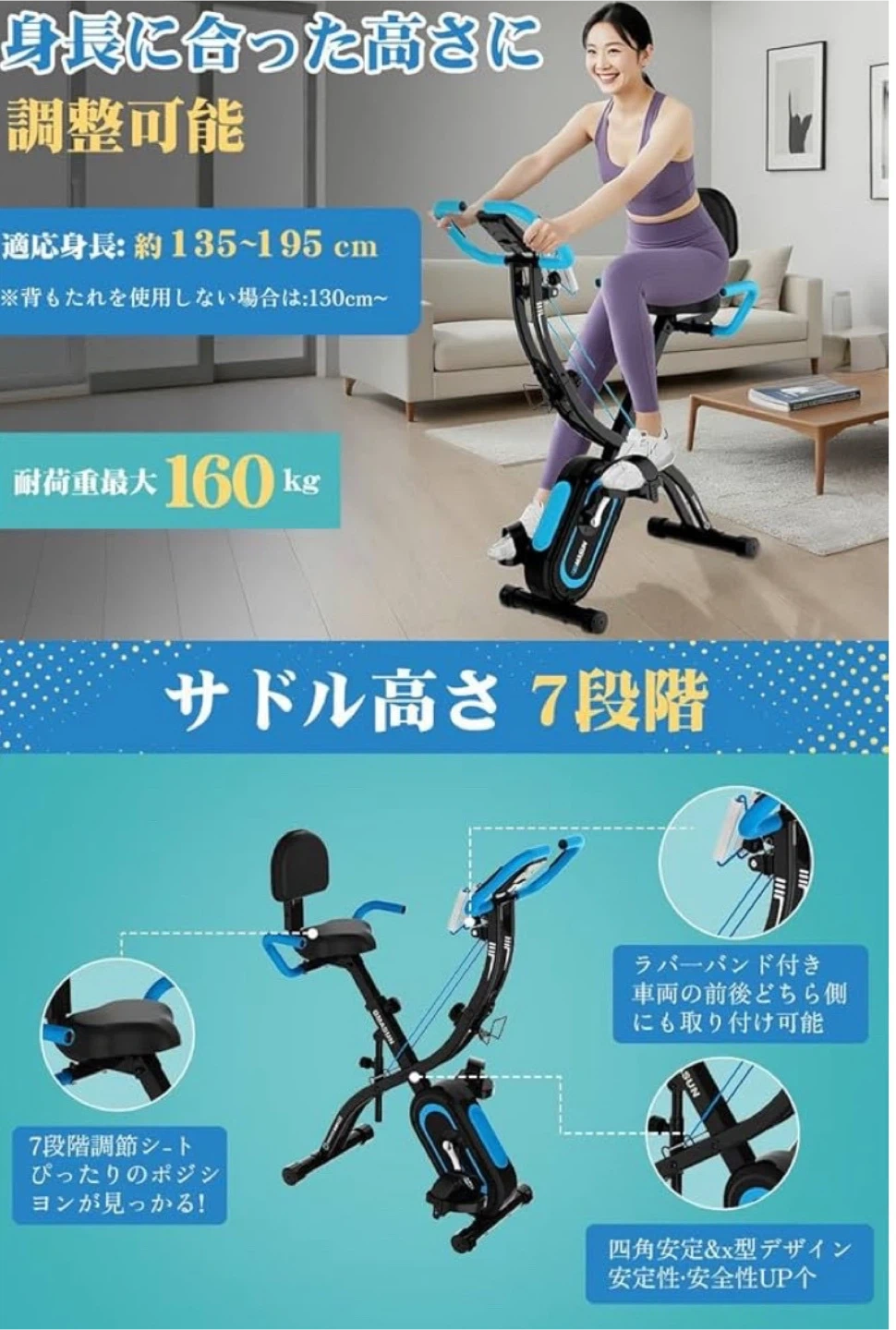数ある中からご覧頂きありがとうございます(^○^) ◎値下げ交渉◎ ◎コメントなし、即購入大歓迎 ◎送料無料!安心の匿名配送 *。*。 \1品限り!!早い者勝ち!!/ ★商品説明★ 従来の高い安定性・静音性・多段階負荷調整といった特長を受け継ぎながら、さらに革新的な進化を遂げました。本体はより軽く、よりコンパクトに。折りたたみ式デザインにより、使わないときはスッキリ収納可能。 寝室・バルコニー・書斎など、ちょっとした空きスペースさえあれば出来る。 今回の新製品は、「軽量化×機能性」の完璧なバランスを実現した新たなブレイクスルーです。 安定感のあるX型構造を採用。折りたたみ後はサイズが大幅に縮小され、キャスター付きで移動もスムーズ。「使いたいときにサッと出して、使い終わったらすぐ収納」が可能で、フィットネスがスペースに制限されることはありません。 ダブルエクササイズバンドを新搭載。有酸素運動と筋力トレーニングの両方を同時に実現!前側バンド:腕・肩・背中・胸筋にアプローチ。後側バンド:太もも・ふくらはぎ・ヒップに効果的。「有酸素運動×筋トレ」が同時にでき、ダイエット効率が2倍以上!ダンベルやチューブを別途購入する必要もありません。また、角度調整可能な多機能ハンドル付きで、以下のようなポジション変更も可能:アスリート姿勢:心肺強化・高脂肪燃焼。直立姿勢:日常の軽い運動に最適。 従来の摩擦式ではなく、非接触式のマグネット負荷調整システムを採用。ハンドルでスムーズに回せるダイヤル式で、スピードや負荷の変更もスムーズです。負荷は16段階で調整可能。初心者から上級者まで、自分に合ったレベルでトレーニングが可能。非接触構造なので摩耗ゼロ、メンテナンス不要、長寿命。 トレーニング状況をリアルタイムで確認できるディスプレイを搭載。心拍数、消費カロリー、 距離、時間など。さらに、スマホやタブレットを置けるスタンドも完備。フィットネスアプリと連携して効率よく運動できます。 厚さ3mmのスチールパイプを使用し、最大耐荷重160kgの頑丈設計。底部は滑り止め付きで安定感抜群、どんな体格でも安心して使用できます。座面は7段階調整可能(一般的な5段階よりも細かく調整できる!)。長時間のトレーニングでも腰や股関節への負担が少ない
