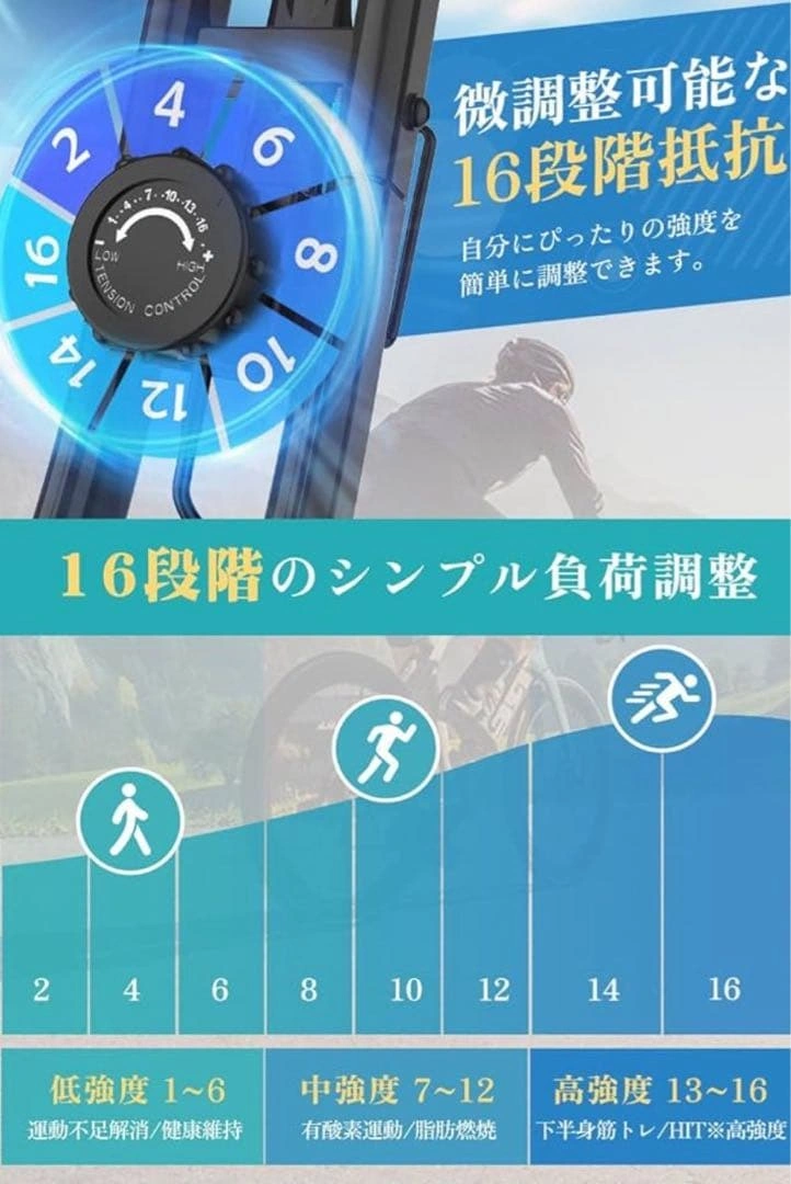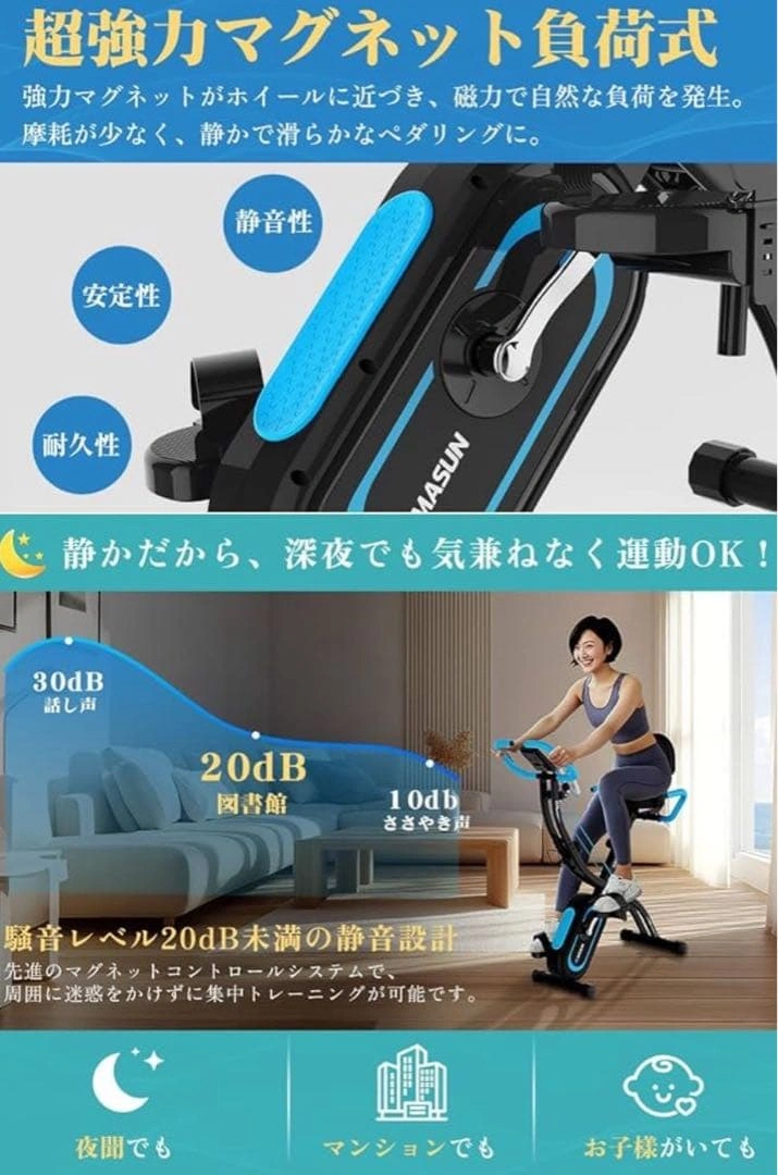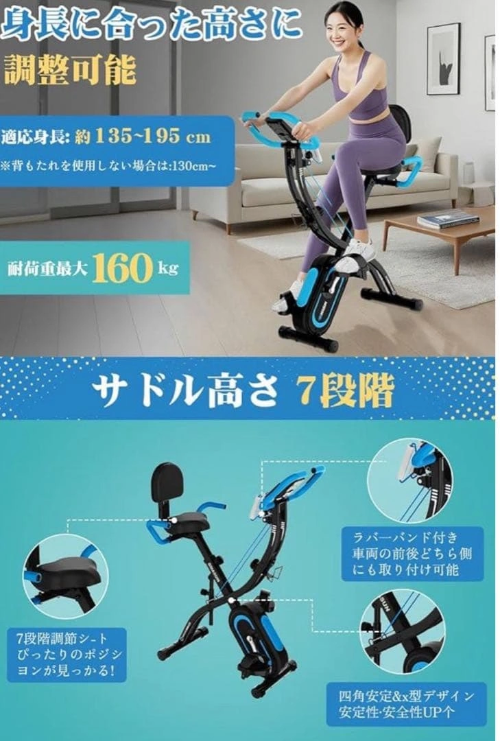 数ある中からご覧頂きありがとうございます(^○^) 従来の高い安定性・静音性・多段階負荷調整といった特長を受け継ぎながら、さらに革新的な進化を遂げました。本体はより軽く、よりコンパクトに。折りたたみ式デザインにより、使わないときはスッキリ収納可能。 寝室・バルコニー・書斎など、ちょっとした空きスペースさえあれば出来る。 今回の新製品は、「軽量化×機能性」の完璧なバランスを実現した新たなブレイクスルーです。 安定感のあるX型構造を採用。折りたたみ後はサイズが大幅に縮小され、キャスター付きで移動もスムーズ。「使いたいときにサッと出して、使い終わったらすぐ収納」が可能で、フィットネスがスペースに制限されることはありません。 ダブルエクササイズバンドを新搭載。有酸素運動と筋力トレーニングの両方を同時に実現!前側バンド:腕・肩・背中・胸筋にアプローチ。後側バンド:太もも・ふくらはぎ・ヒップに効果的。「有酸素運動×筋トレ」が同時にでき、ダイエット効率が2倍以上!ダンベルやチューブを別途購入する必要もありません。また、角度調整可能な多機能ハンドル付きで、以下のようなポジション変更も可能:アスリート姿勢:心肺強化・高脂肪燃焼。直立姿勢:日常の軽い運動に最適。 従来の摩擦式ではなく、非接触式のマグネット負荷調整システムを採用。ハンドルでスムーズに回せるダイヤル式で、スピードや負荷の変更もスムーズです。負荷は16段階で調整可能。初心者から上級者まで、自分に合ったレベルでトレーニングが可能。非接触構造なので摩耗ゼロ、メンテナンス不要、長寿命。 トレーニング状況をリアルタイムで確認できるディスプレイを搭載。心拍数、消費カロリー、 距離、時間など。さらに、スマホやタブレットを置けるスタンドも完備。フィットネスアプリと連携して効率よく運動できます。 厚さ3mmのスチールパイプを使用し、最大耐荷重160kgの頑丈設計。底部は滑り止め付きで安定感抜群、どんな体格でも安心して使用できます。座面は7段階調整可能(一般的な5段階よりも細かく調整できる!)。長時間のトレーニングでも腰や股関節への負担が少ない ご希望の方はお気軽にご連絡ください。
