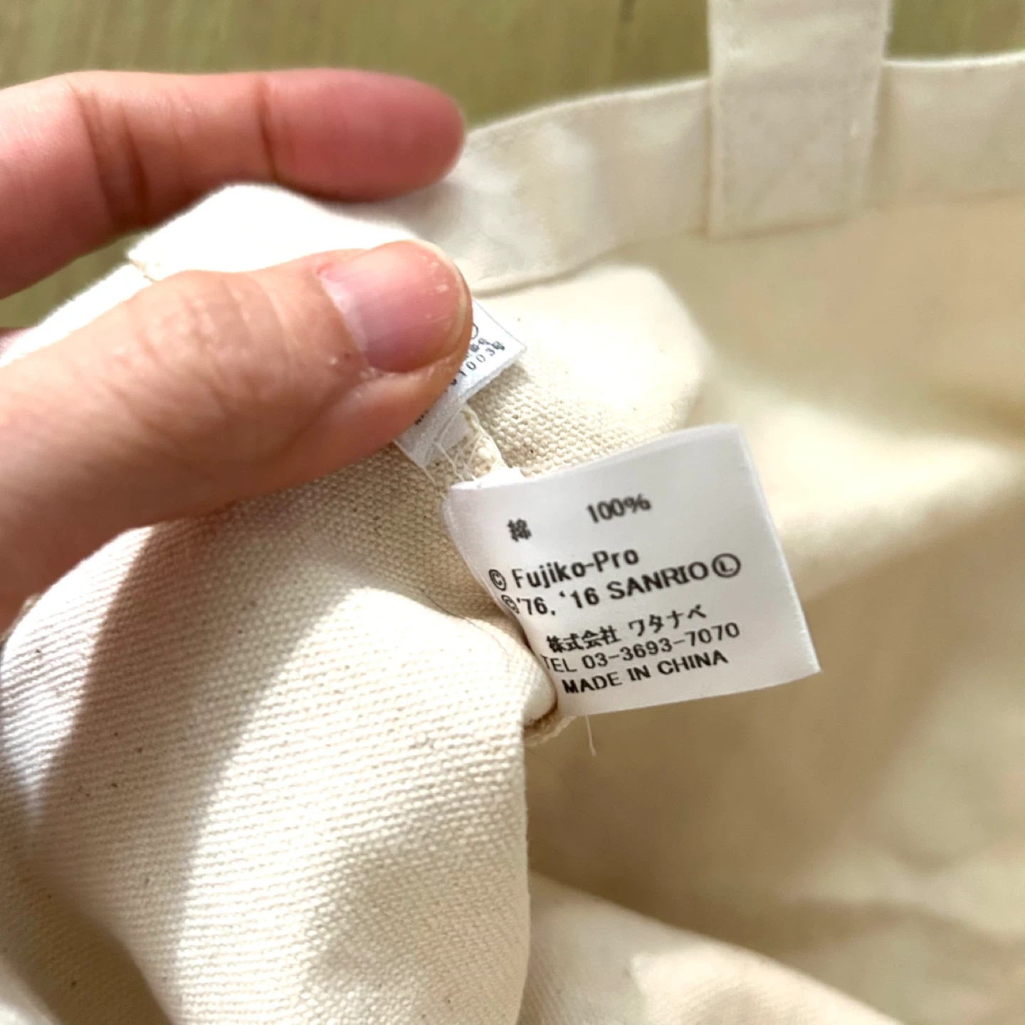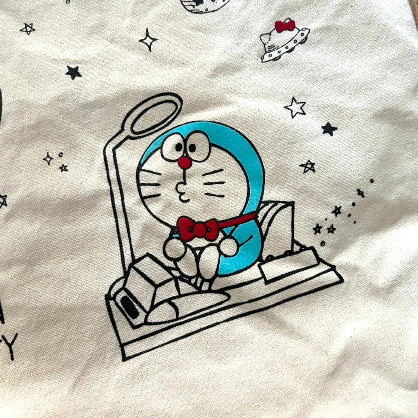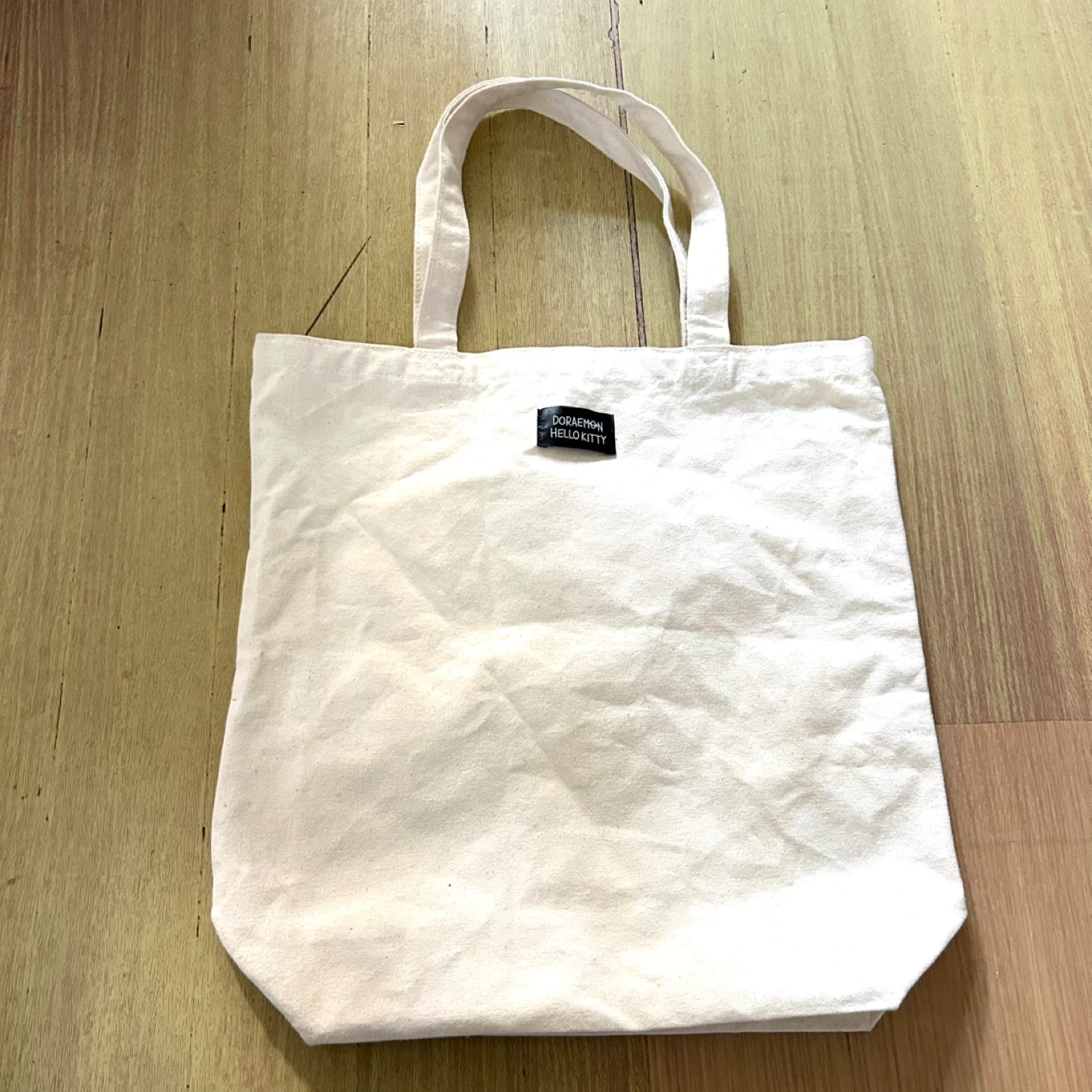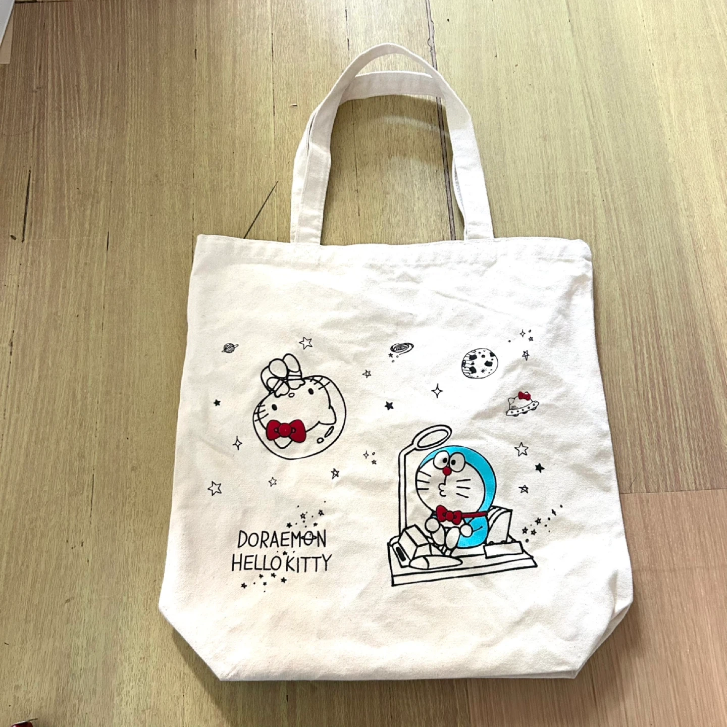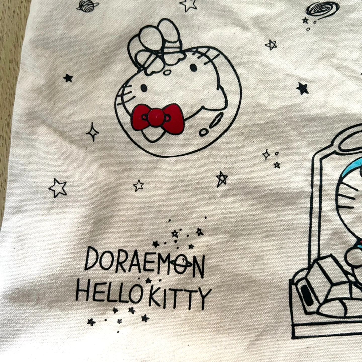 ハローキティーとドラエモンコラボのトートバッグです。一度使用しました。 大きさは約36×36cm、マチは10cmほど 取手は45cmくらいです。 結構しっかりしたコットンバッグになります。