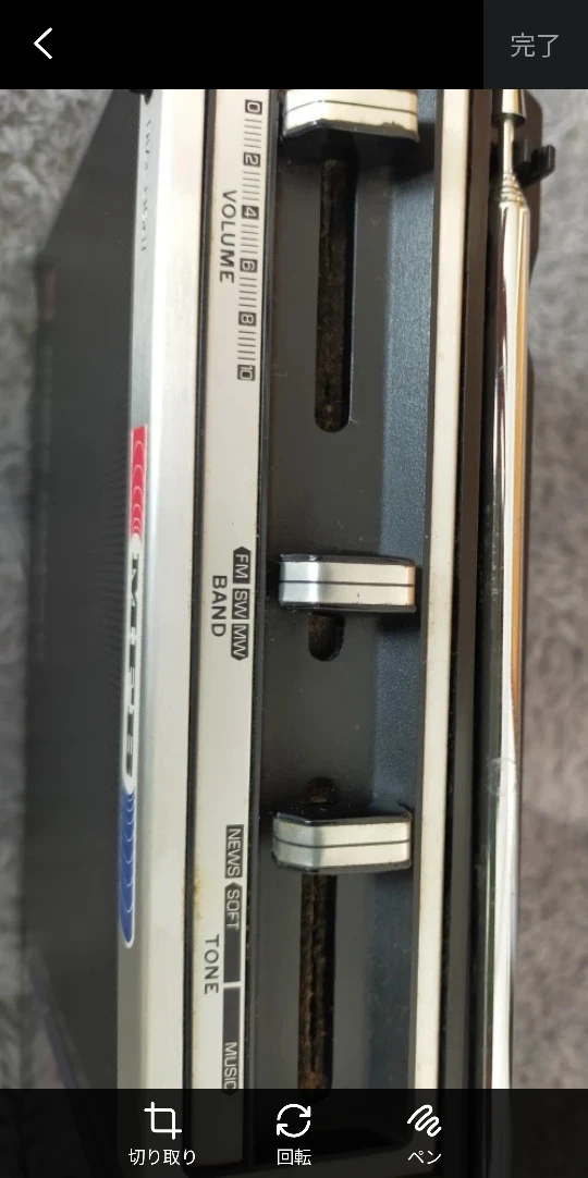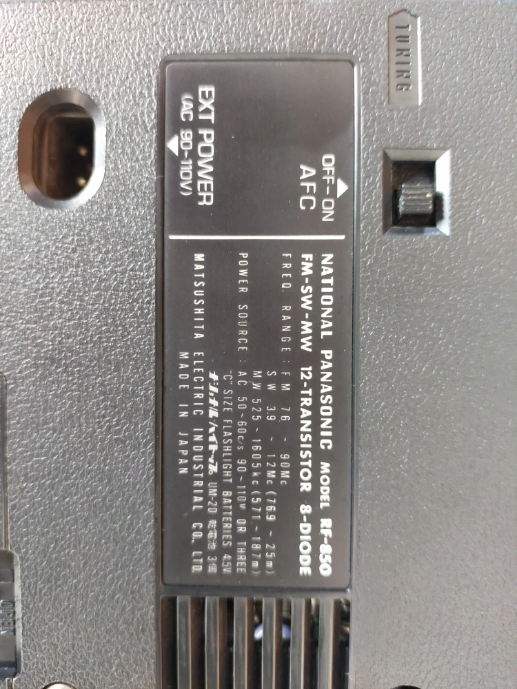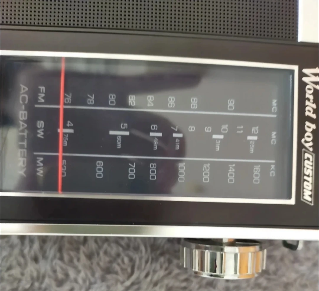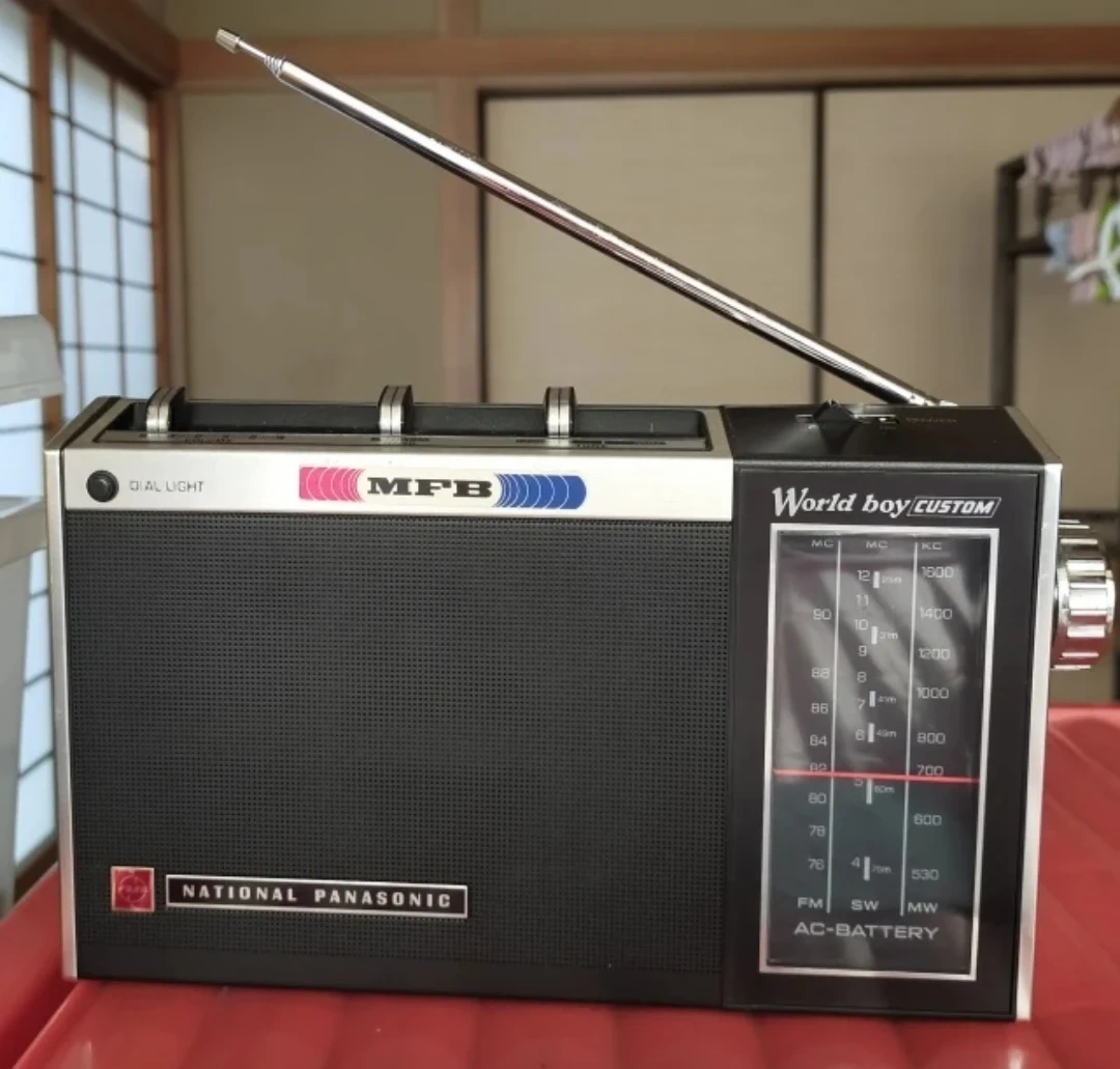 ワールドボーイカスタム(MFB音響) 型番:RF-850 1969年に14.500円で発売。 1968年は周波数の単位がC(サイクル)からHz(ヘルツ)に変わった年で、このRF-850は旧単位のKC、MC表示です。 FM、SW(短波)、MW(中波=AM)が受信できます。 ダイヤルライトは点灯しません。 TONE調節はNEWS・SOFT・MUSICの3段階スライド式。 ボリューム調節もスライド式です。 電源スイッチはシーソ型です。 アンテナは90cmまで伸びます。 左右に紐などを引っ掛ける小さな金属部分があり少し錆があります。 各種スライド、アンテナ、スイッチは 滑らかに動きます。 スピーカーや周波数のパネルにへこみや傷はありません。 動作確認済みです。 イヤフォンもつかえます。 単一の乾電池3本を使用します。 付属品はありませんので、本体に乾電池を入れてお渡し致します。 三軒茶屋駅周辺や数駅先まででしたら、 お近くまでお持ち致します。