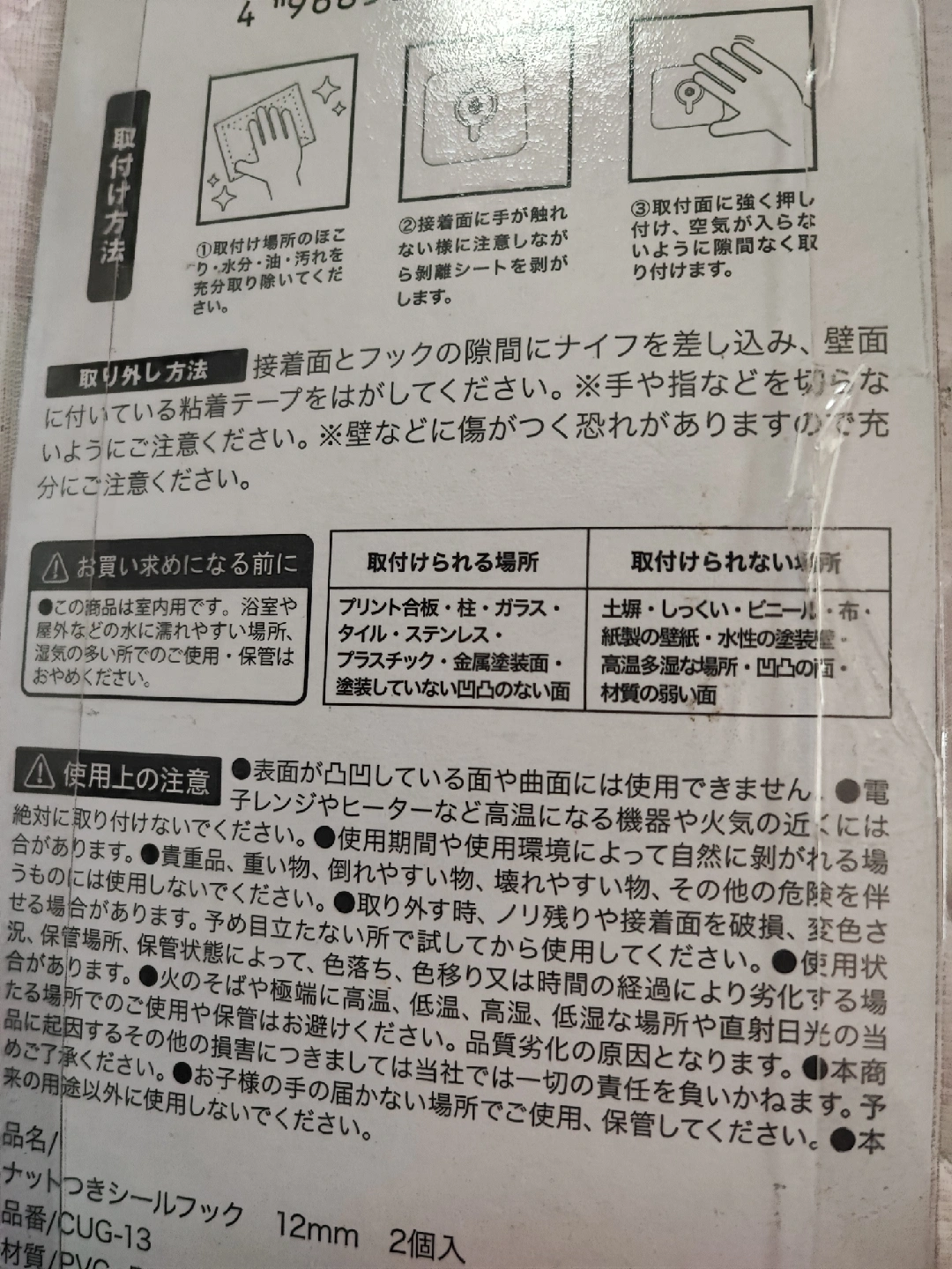 穴を開けずに壁掛けを付けるためのシールフックです。 取り付けられる場所であれば、とても便利だと思います。 場所を確認できるよう画像を付けておりますので、こちらでご確認ください。 お取引希望の方は、当方のプロフィールをお読みいただき、確認された上でご連絡ください。宜しくお願いします。