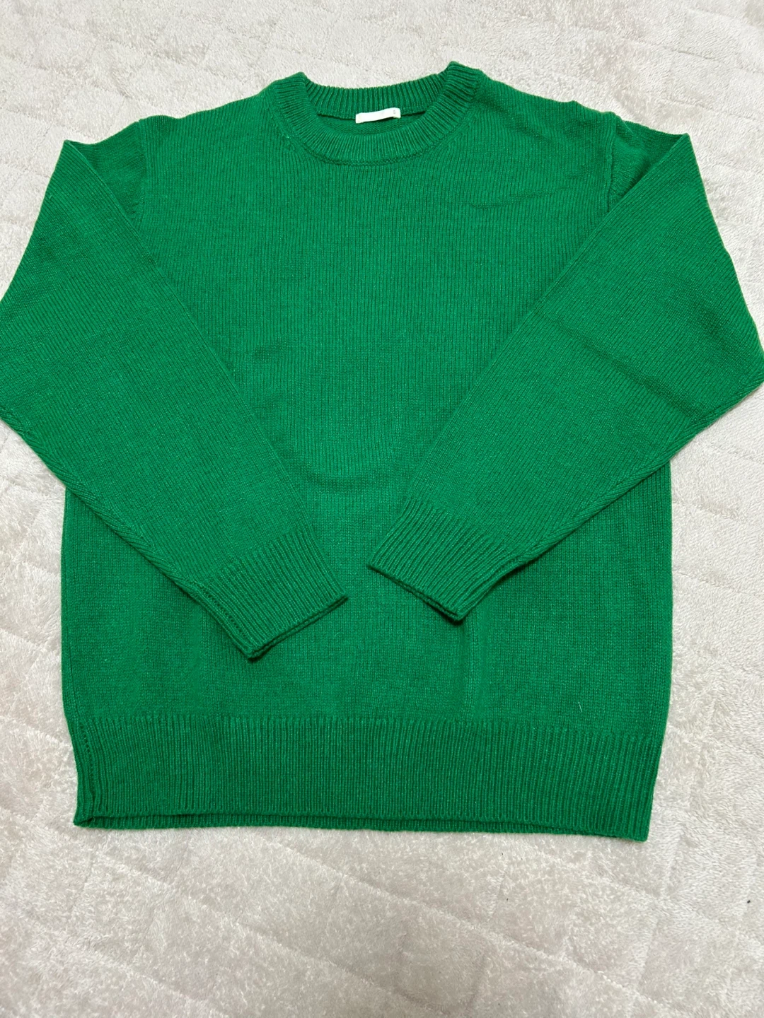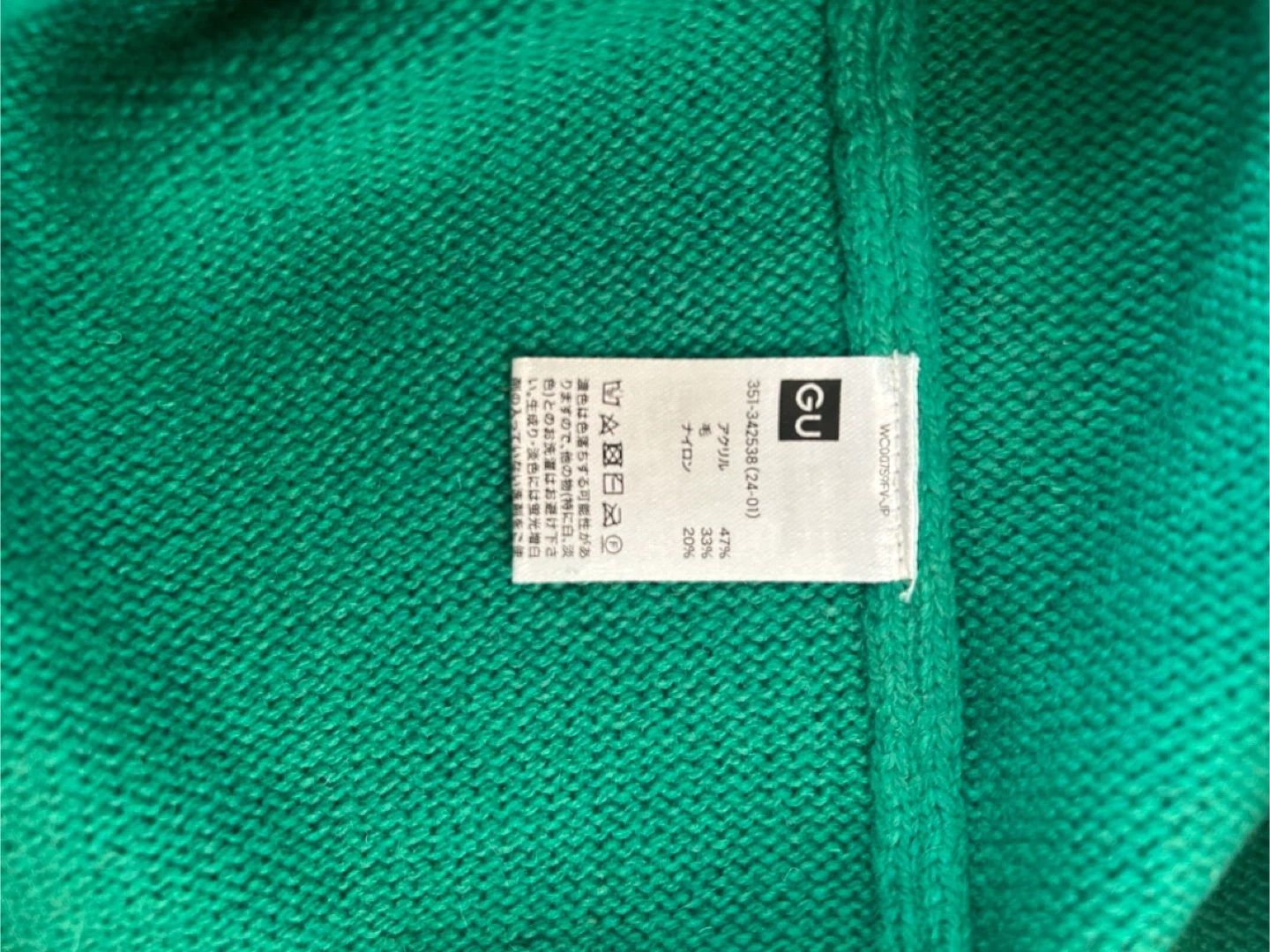 こちらはメンズのSサイズですが、158センチの私が着用していました。レディースのLサイズ相当でしょうか。 ・ブランド:GU ・色:グリーン ・素材:アクリル47%、毛33%、ナイロン20% 肩幅44cm 袖丈55.6cm 身幅49.5cm 身丈65cm 平置き採寸ですが、参考になさってください。 色は1番目の写真が一番近いです。 綺麗な色のニットなので、差し色にいかがでしょうか。 毛玉や使用感はほぼありません。 お引き取り場所はアピタ長津田店か十日市場駅希望です。 よろしくお願いいたします。