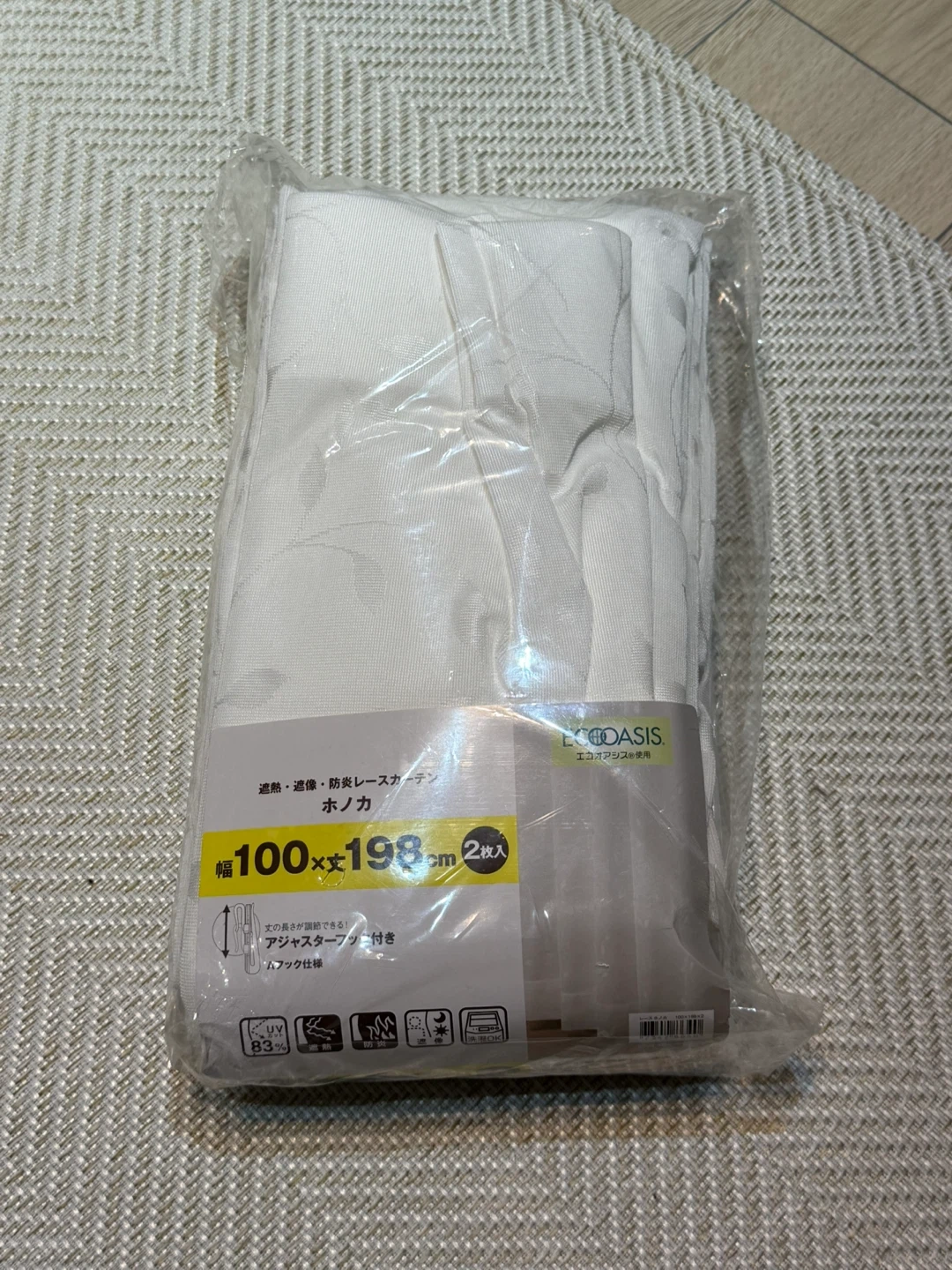 ニトリ エコオアシスのレースカーテンです。 ・遮熱、遮像、防炎レースカーテン ・サイズ:幅100×198cm 2枚入 ・アジャスターフック付き 中古品であることをご了承ください。