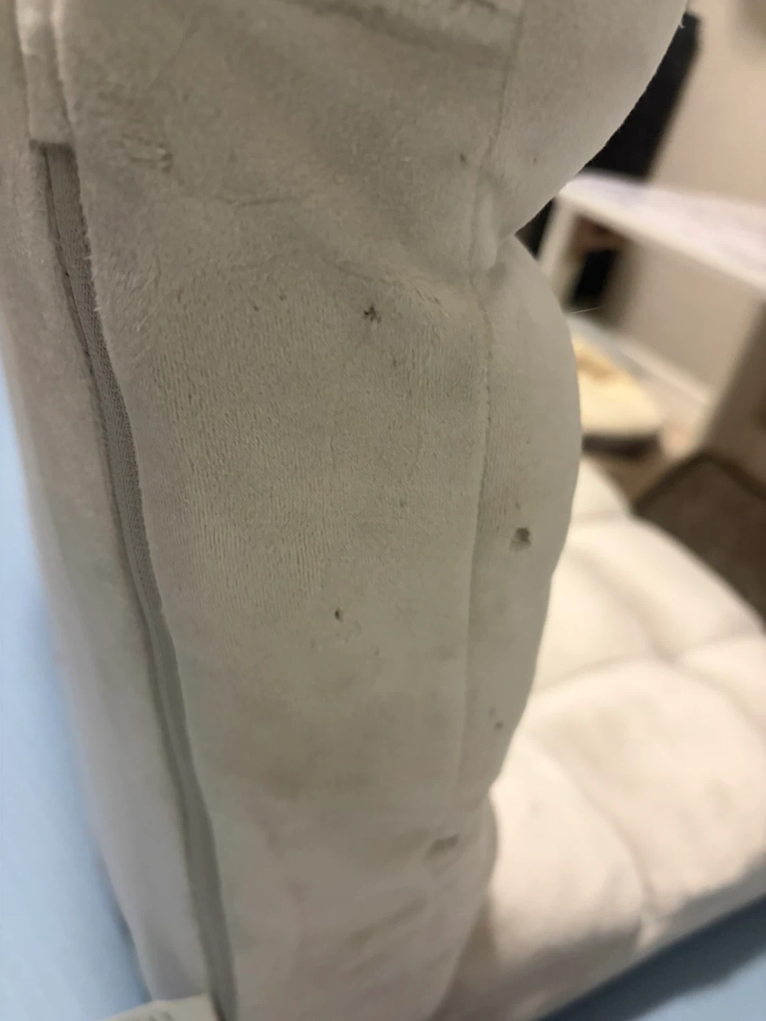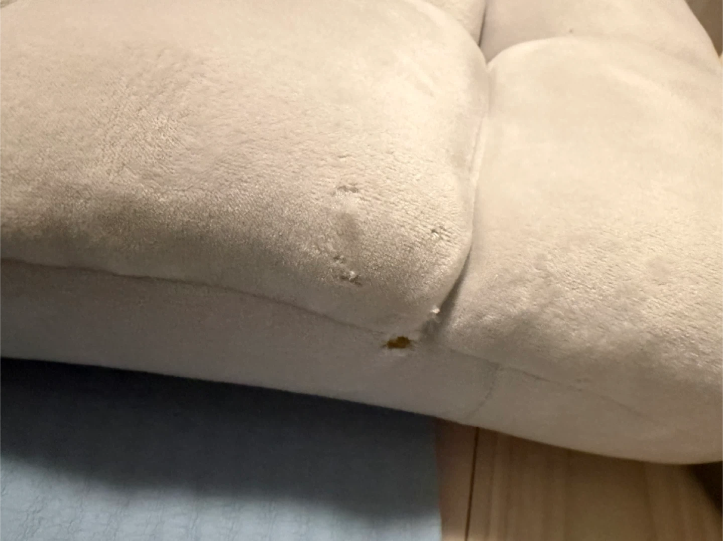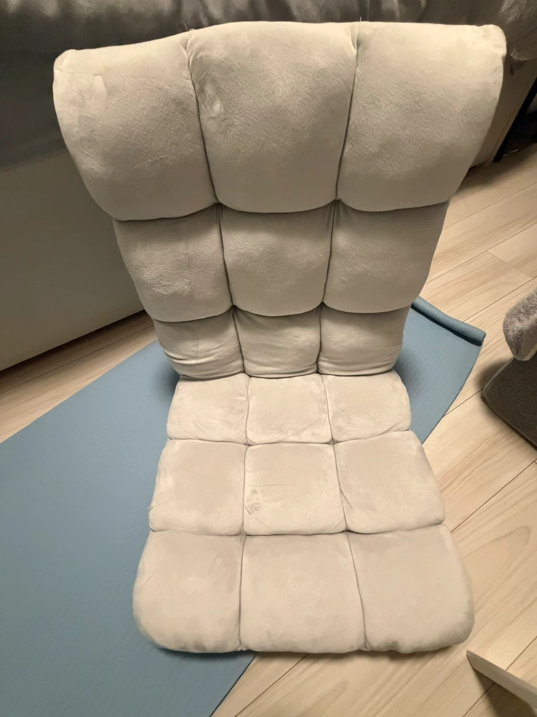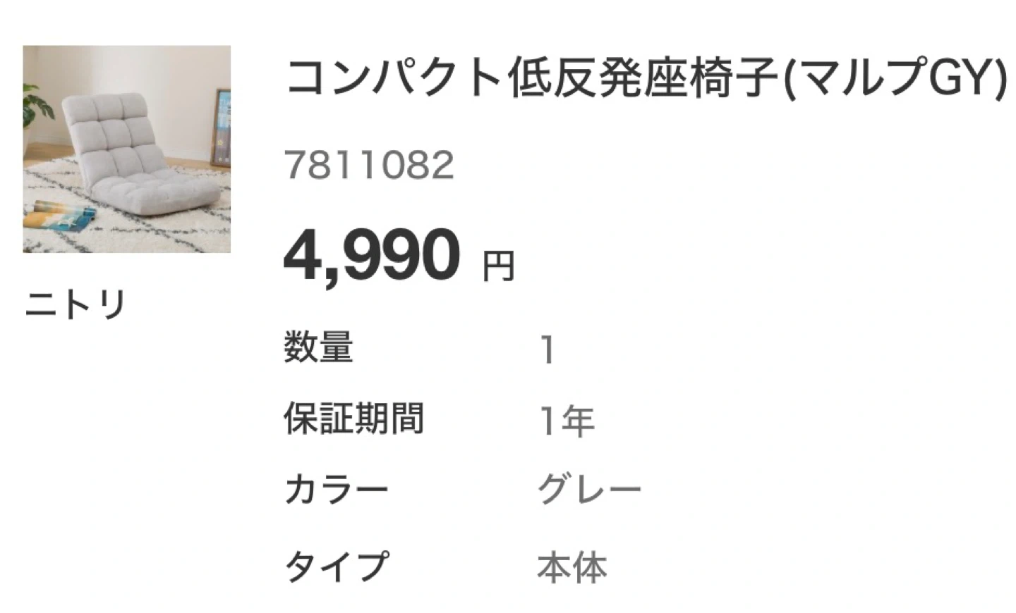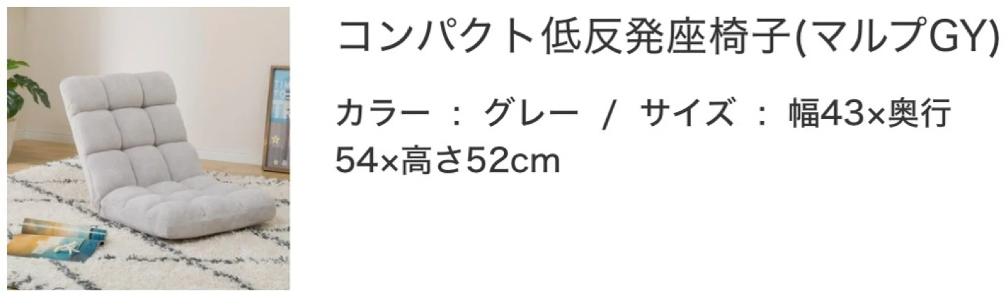ニトリのコンパクト低反発座椅子です。 2年弱使用しました。 購入時からカバーをつけて使用していたので全体的に綺麗です。汚れ等全くありません。 座面には太い低反発クッションを乗せて使用していたため、本体クッション部分のヘタリも感じません。低反発がしっかり機能しています。 定価:¥4,990 猫に2箇所ほど爪とぎされており、小さい穴が開いています。(画像参照)そこまで目立ちませんが気になる方はお控えください。 ・カラー:グレー ・サイズ:幅43×奥行54×高さ52cm ご不明点があればお気軽にお尋ねください。