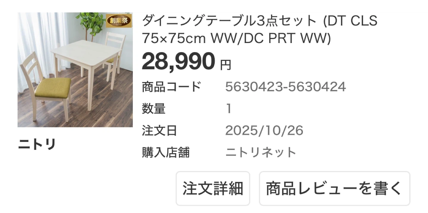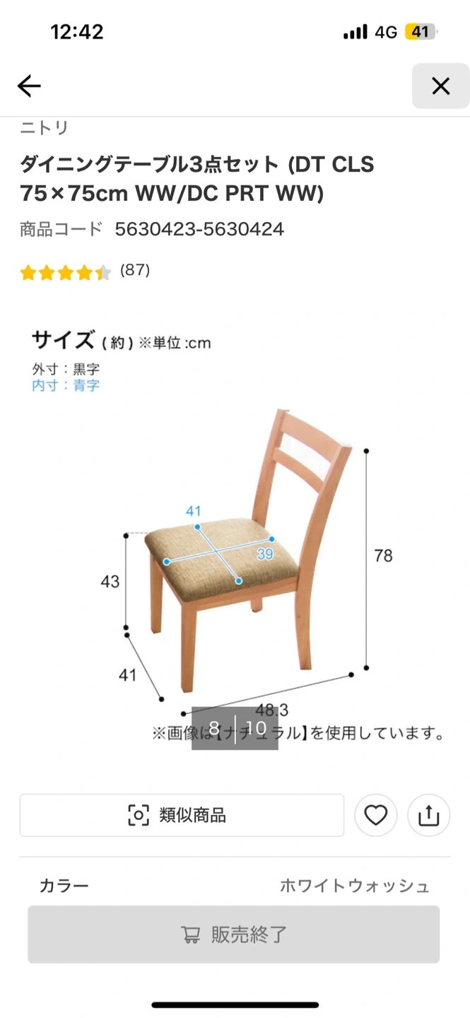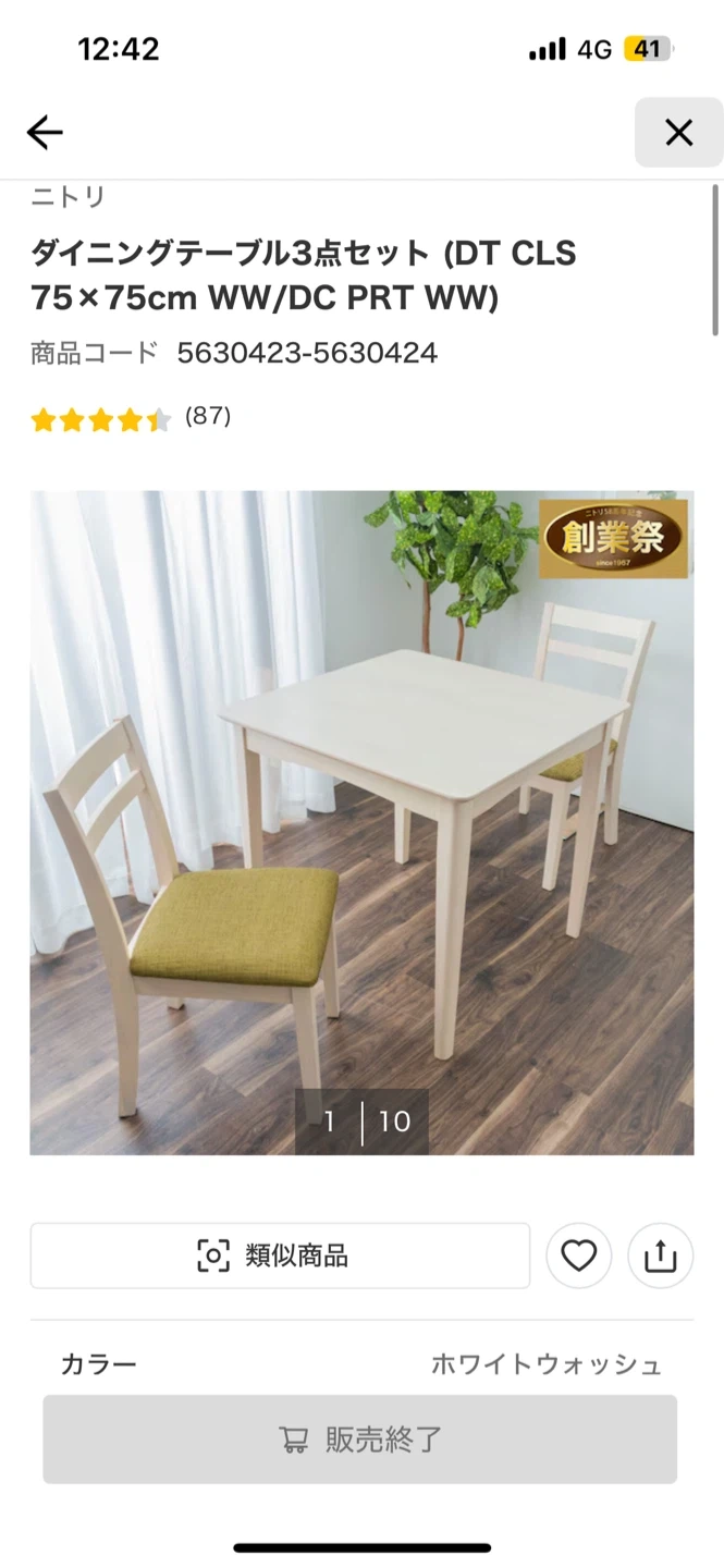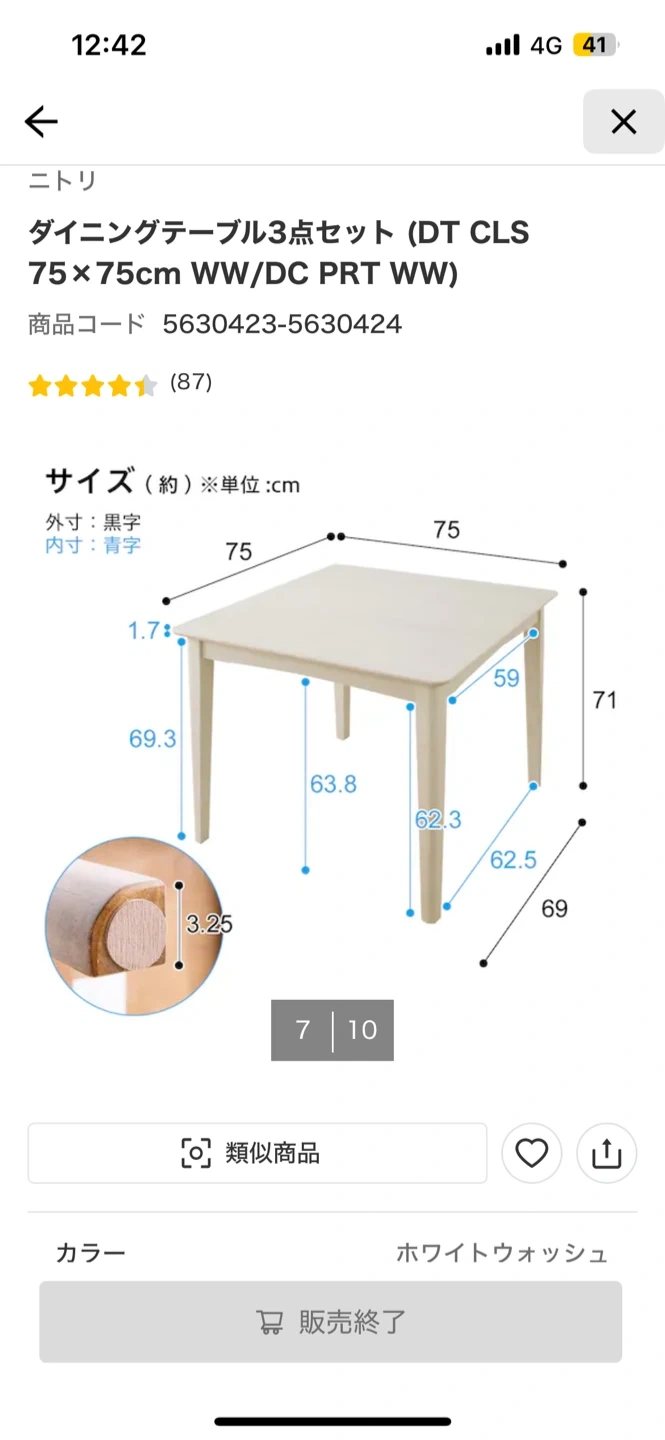 ニトリのダイニングテーブル3点セットです。 【情報】 ブランド:ニトリ 商品名:ダイニングテーブル3点セット (DT CLS 75×75cm WW/DC PRT WW) 商品コード:5630423-5630424 サイズ: テーブル:幅75×奥行75×高さ71cm チェア:幅41.5×奥行48.5×高さ78cm カラー:ホワイトウォッシュ 【状態】 引越しの際に、新しく購入し、 組み立て部屋の中にありますが、 ほぼ使っていない状態です。 (ソファと別テーブルでほぼ過ごしているため) 組み立て済みです。 足立区に取りに来られる方よろしくお願いします! 比較的きれいな状態です。 ご不明点があればお気軽にお尋ねください。