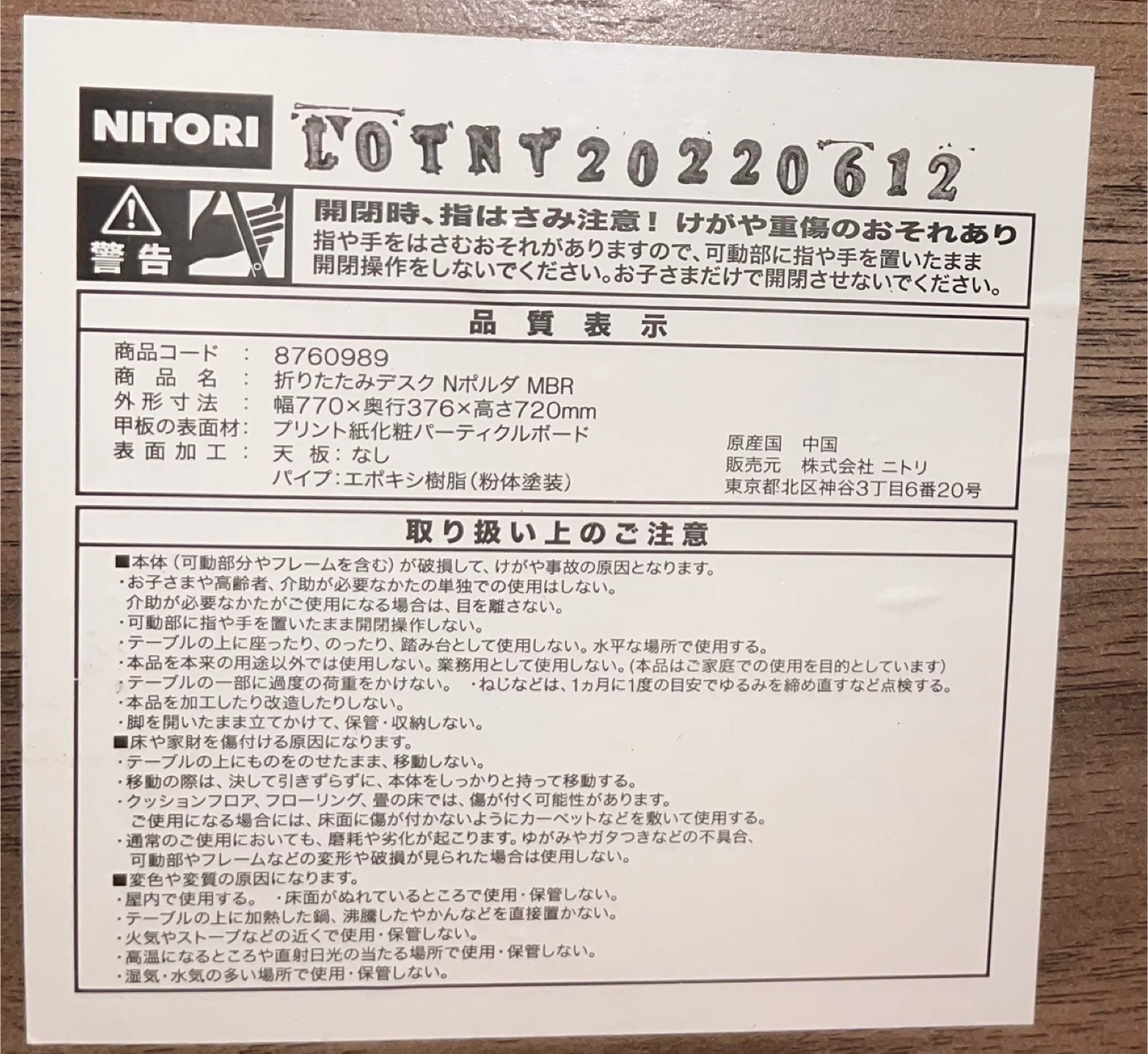 ニトリの折りたたみデスクです 【情報】 ブランド:ニトリ 商品名:折りたたみデスク Nポルダ MBR サイズ:幅770×奥行376×高さ720mm 【状態】 使用感少なめ 中古品であることご了承ください 自宅の近くまで取りに来ていただけると助かります