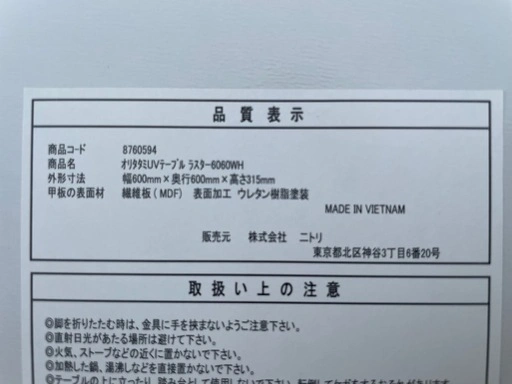あたたかさニトリの折りたたみ式ローテーブルです。 【商品の状態】 総合:◯ 動作:◎ 傷(外装):◯ 汚れ(外装):▲ におい:◎ 年式:- 商品の状態は個人の感じ方により変わると思いますので、参考程度にお考えください。 清掃はしておりますが、写真では確認しづらい傷や汚れがある可能性があります。 写真の情報が全てです。 中古品にご理解頂けない方はご購入をお控えください。 返品やキャンセルは受け付けておりません。 【お渡し場所】 横浜市港南区 折りたたみ式で、コンパクトに収納できます。普段使いや来客用、作業スペース用などにいかがでしょうか。 サイズ:幅 約600 mm × 奥行 約600 mm × 高さ 約315mm 天板表面:UV塗装 コンパクトで省スペース。UV塗装でお手入れも簡単です。 【オプション】 ・配送料:1,000円〜(場所により異なります。詳細はお問合せください。) ・時間指定:0円〜 ・下取り:0円〜(商品により買取可能な場合があります。) ご希望の方はお気軽にご連絡ください。