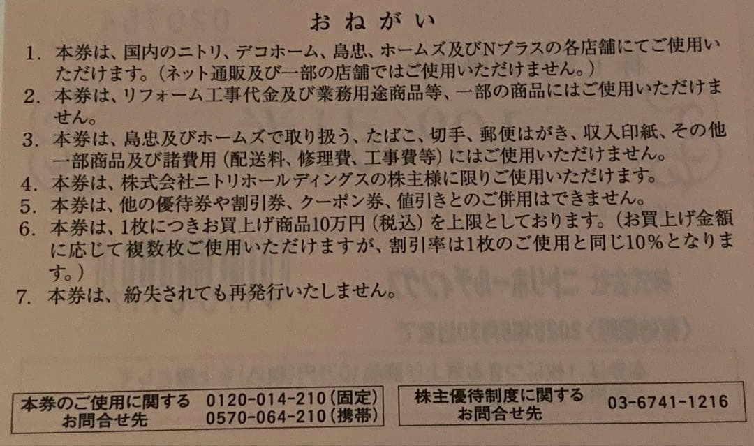 ニトリ、デコホーム、島忠、ホームズ、及びNプラスの各営業店舗でのお買物が10%割引になります。株主優待券1枚につき、10万円のお買上げを上限といたします。 一部、対象外となる商品等がございます。裏面画像や、店頭などでご確認ください。 ご希望の方はお気軽にご連絡ください。